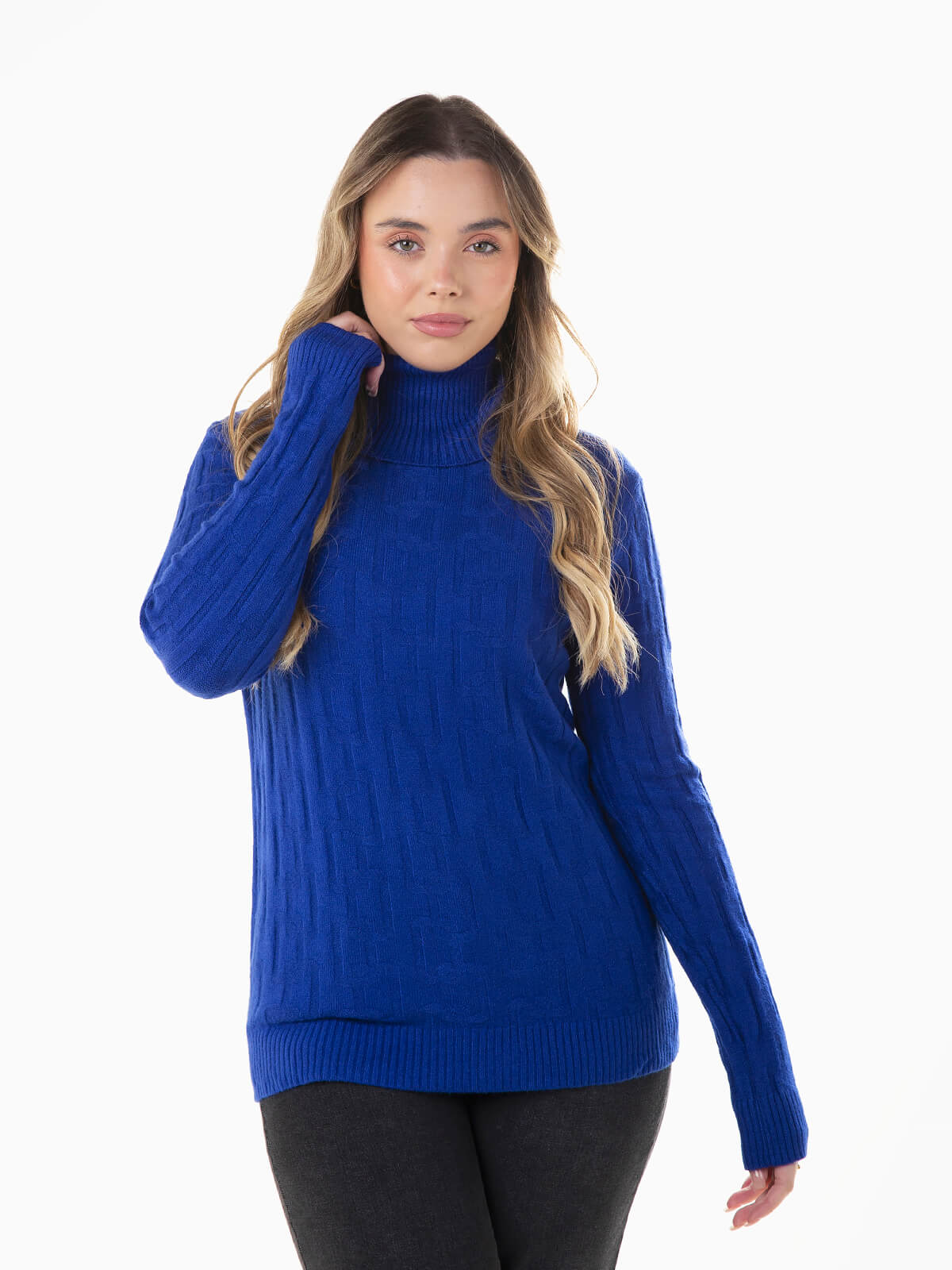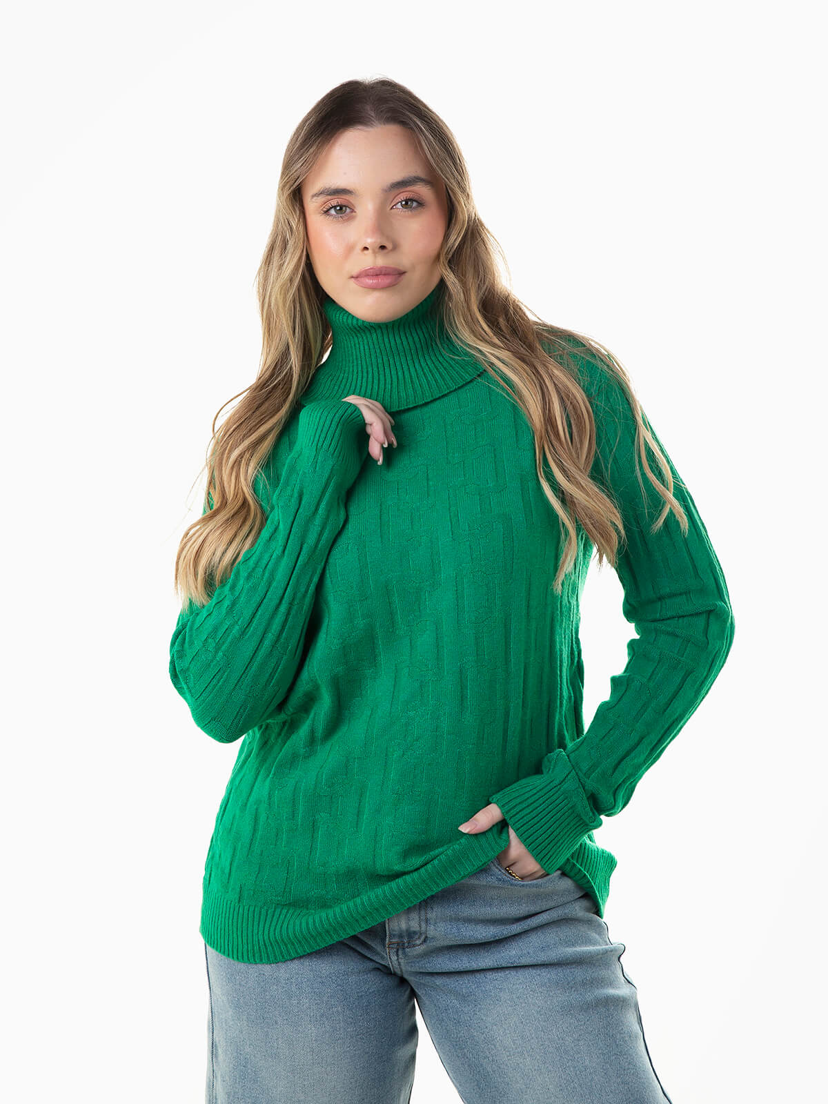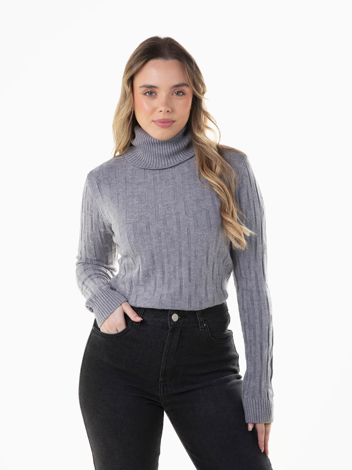 Camisola malha estrutura de gola alta para mulher. Camisola justa de manga comprida com acabamentos canelados.