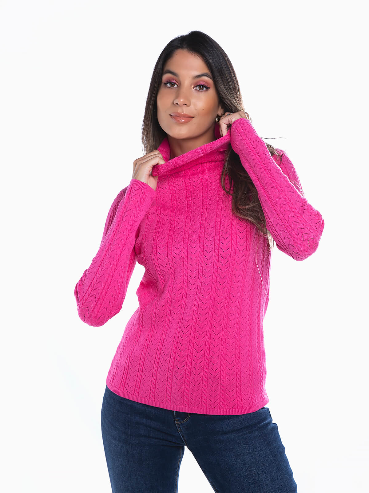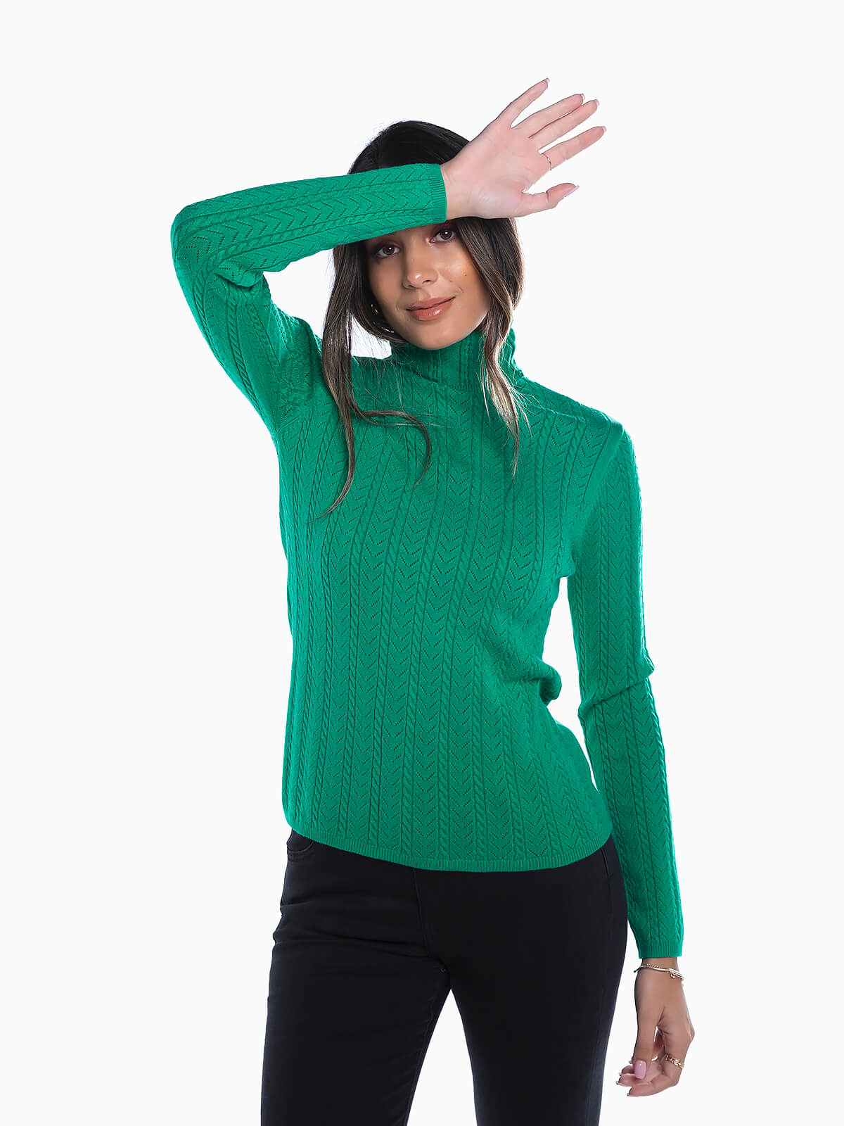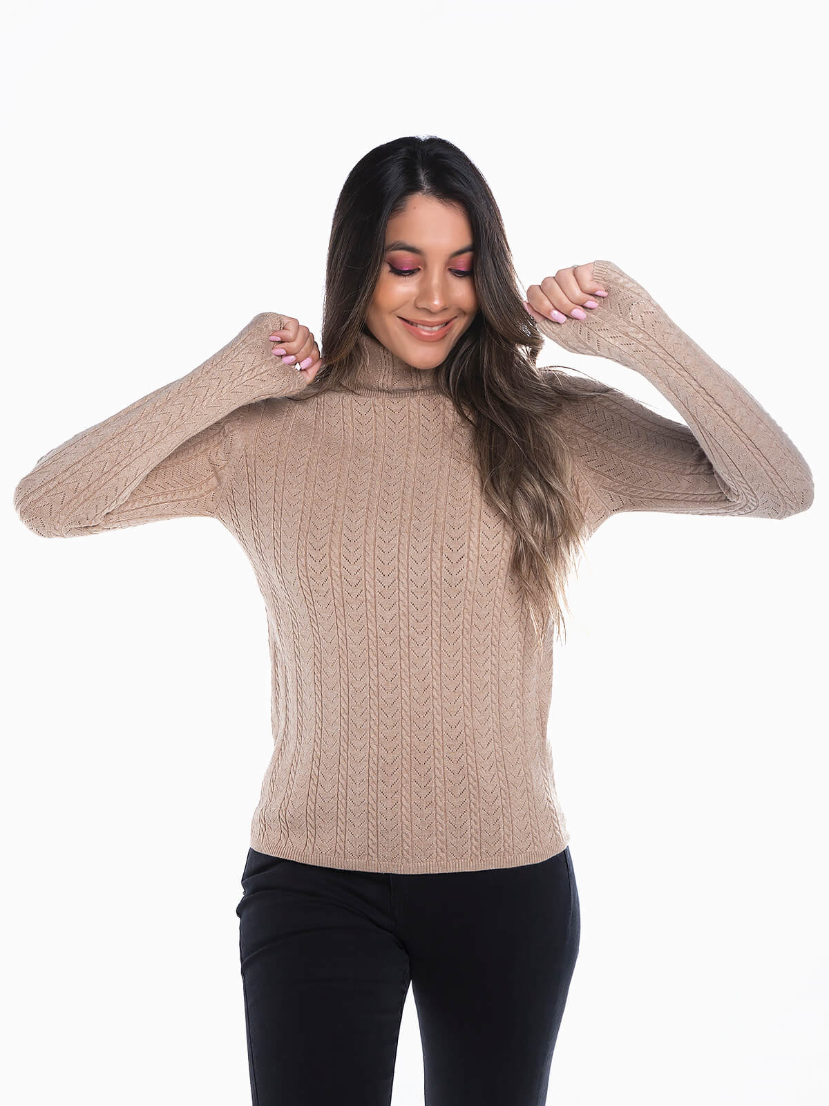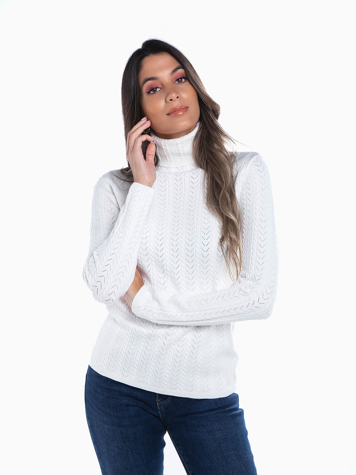 Camisola em malha estuturada com gola alta para senhora. Camisola justa de manga comprida com pormenores abertos.
