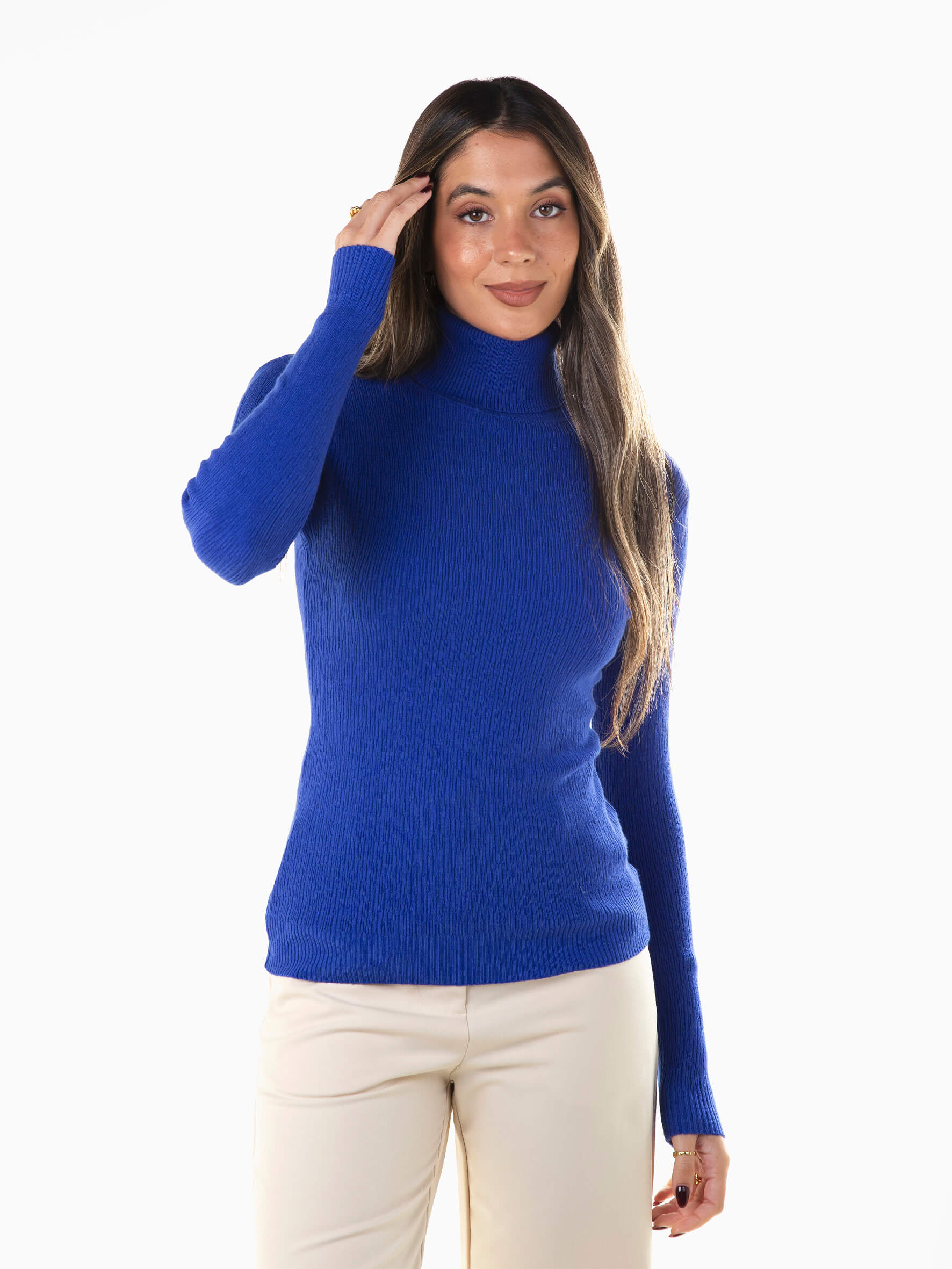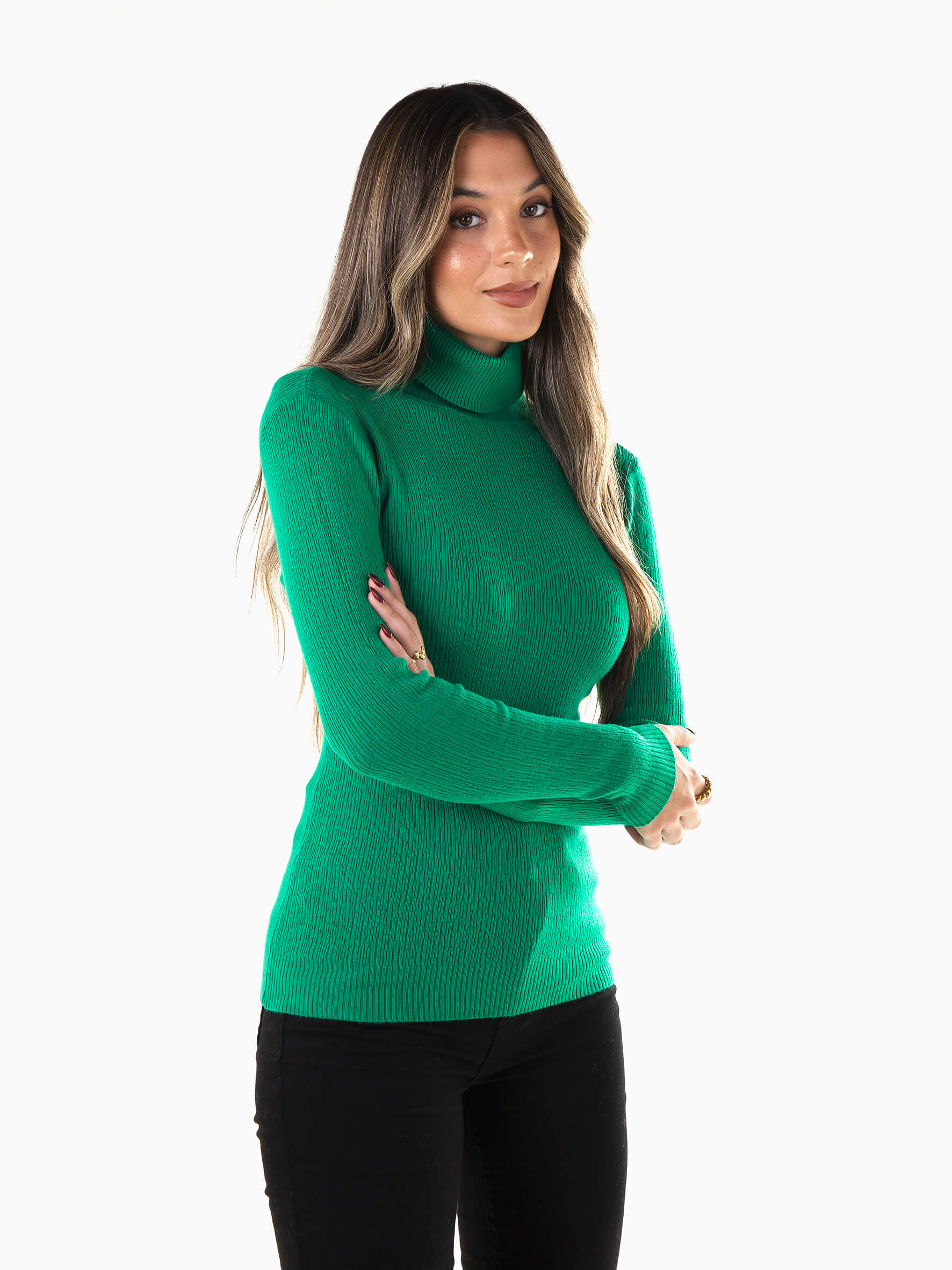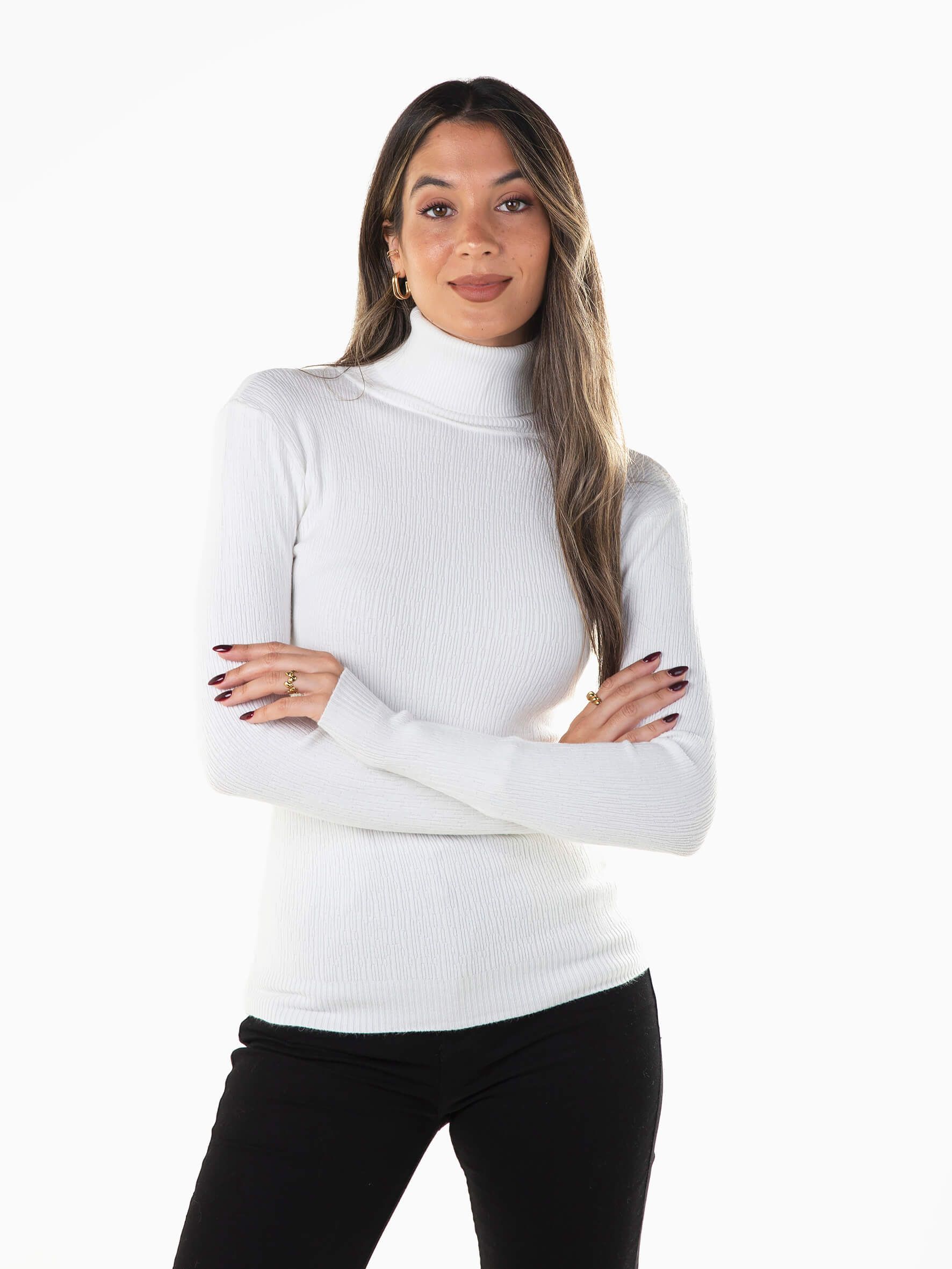 Camisola em malha estruturada com gola alta dobrada para senhora. Camisola manga comprida com acabamentos canelados.