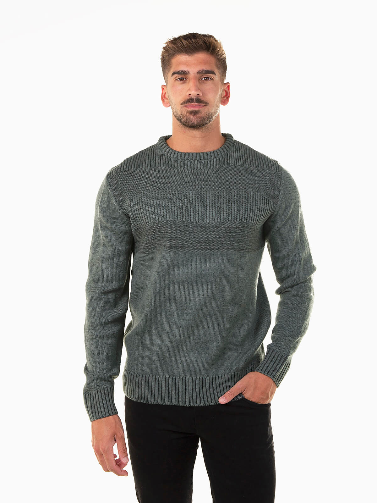 Camisola de malha estruturada para homem, com gola redonda e acabamentos canelados nas extremidades. Versátil e confortável, é a escolha ideal para completar looks de outono-inverno com estilo e simplicidade.