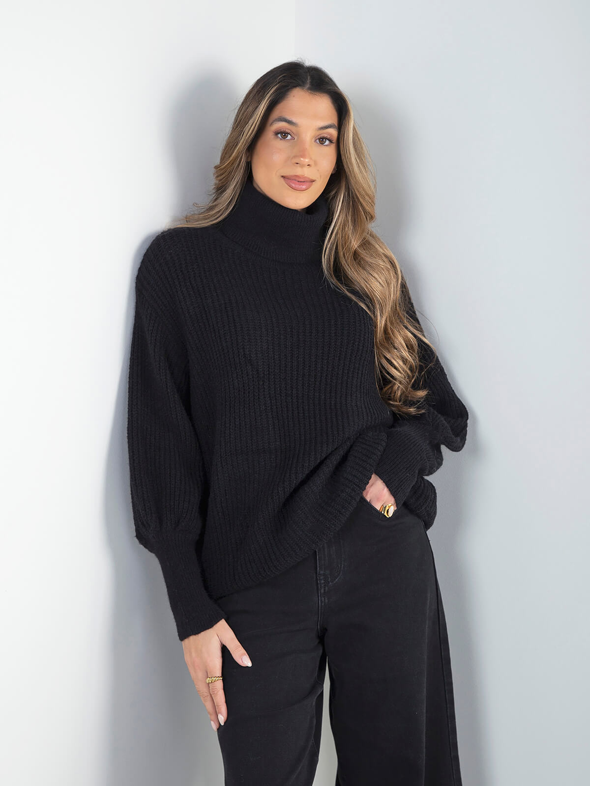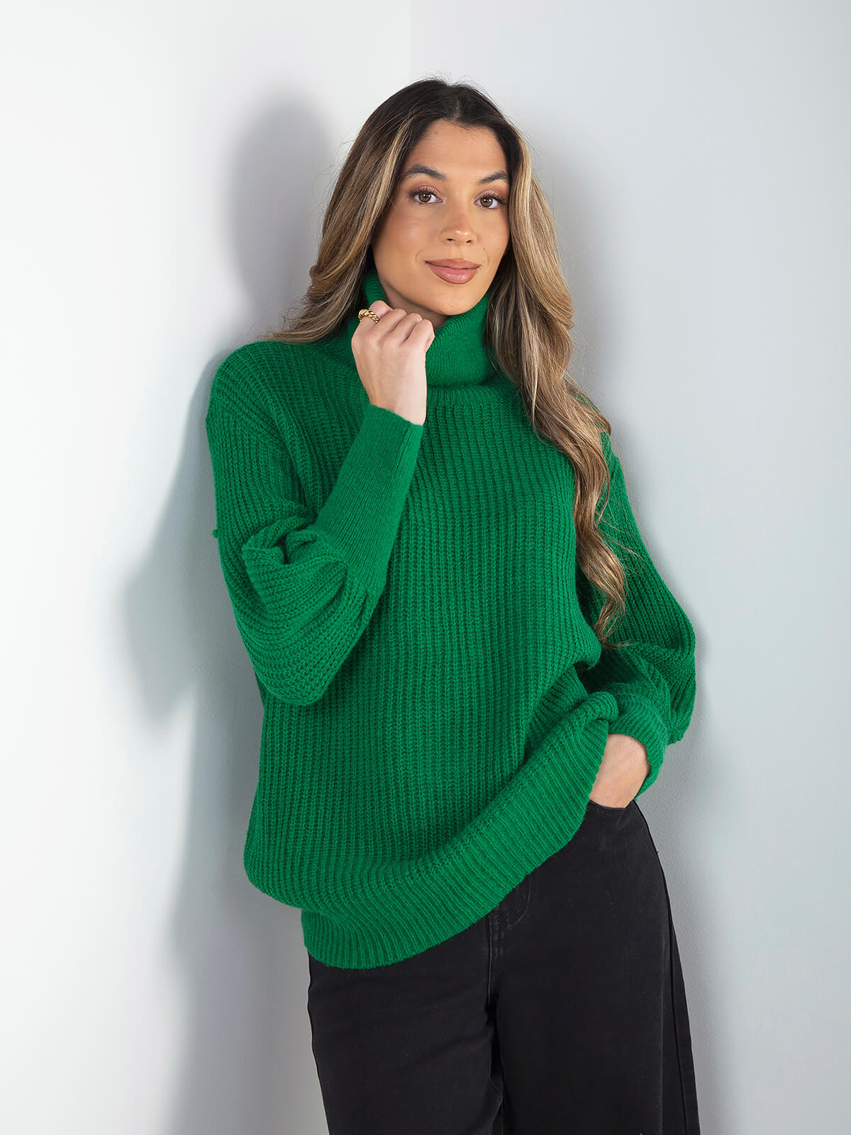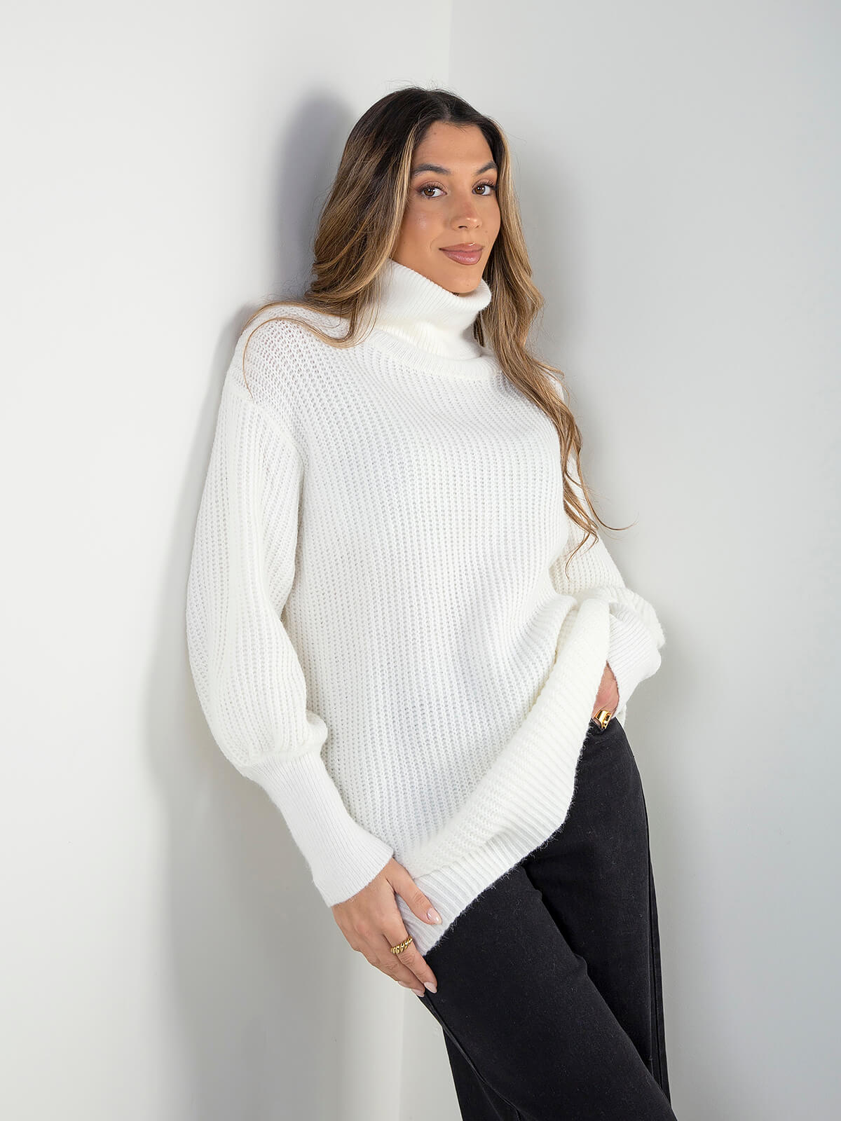 Camisola de malha estruturada com gola alta dobrável, manga comprida e modelo confortável. A textura da malha confere um acabamento cuidado, ideal para looks de inverno práticos e intemporais, fáceis de conjugar com calças de ganga ou calças de alfaiataria.