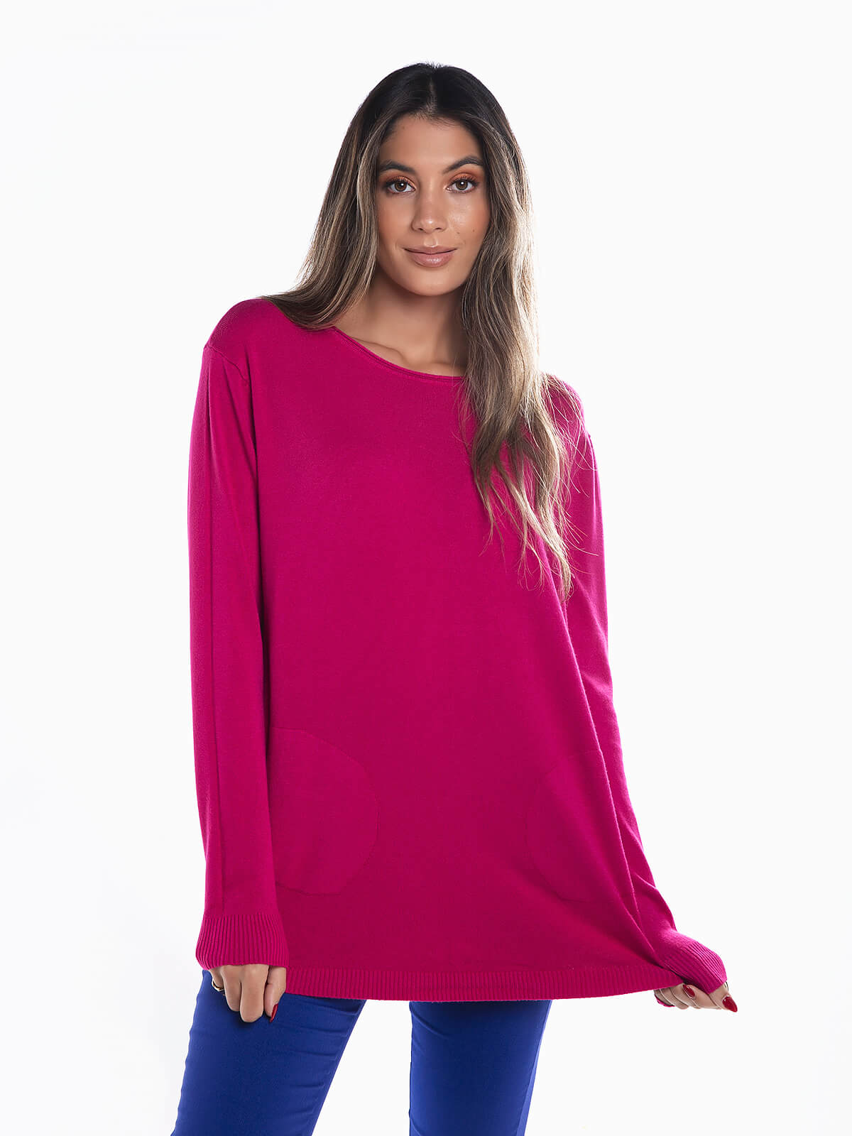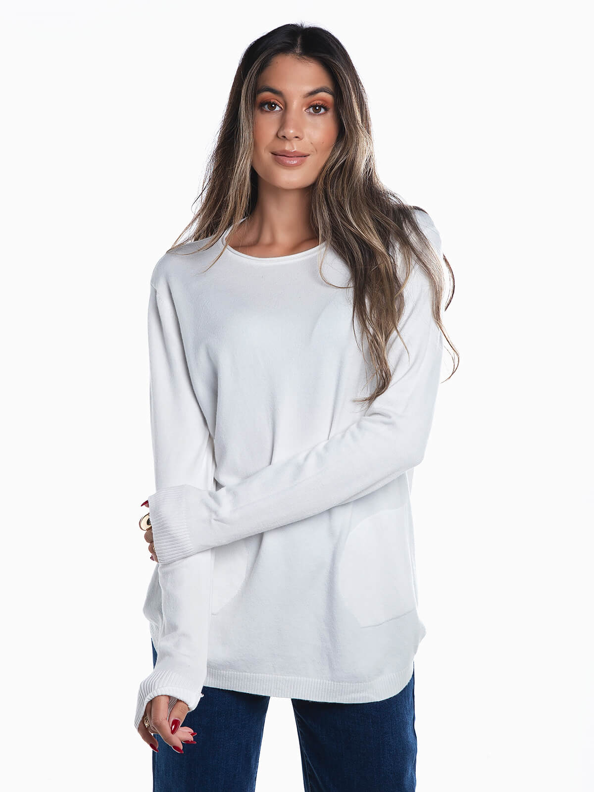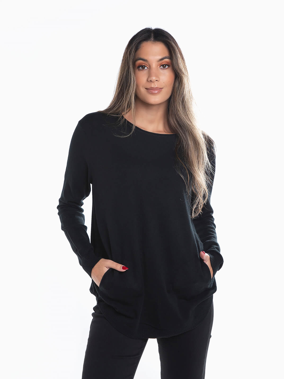 Camisola em malha fina com 2 bolsos à frente. Camisola manga comprida com decote redondo. Acabamentos canelados.