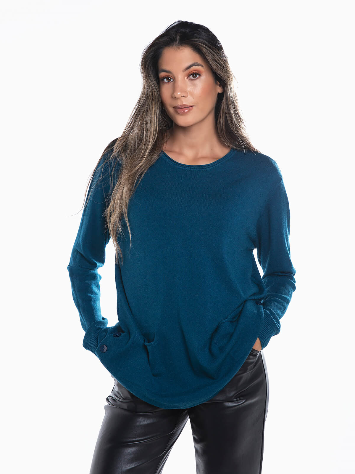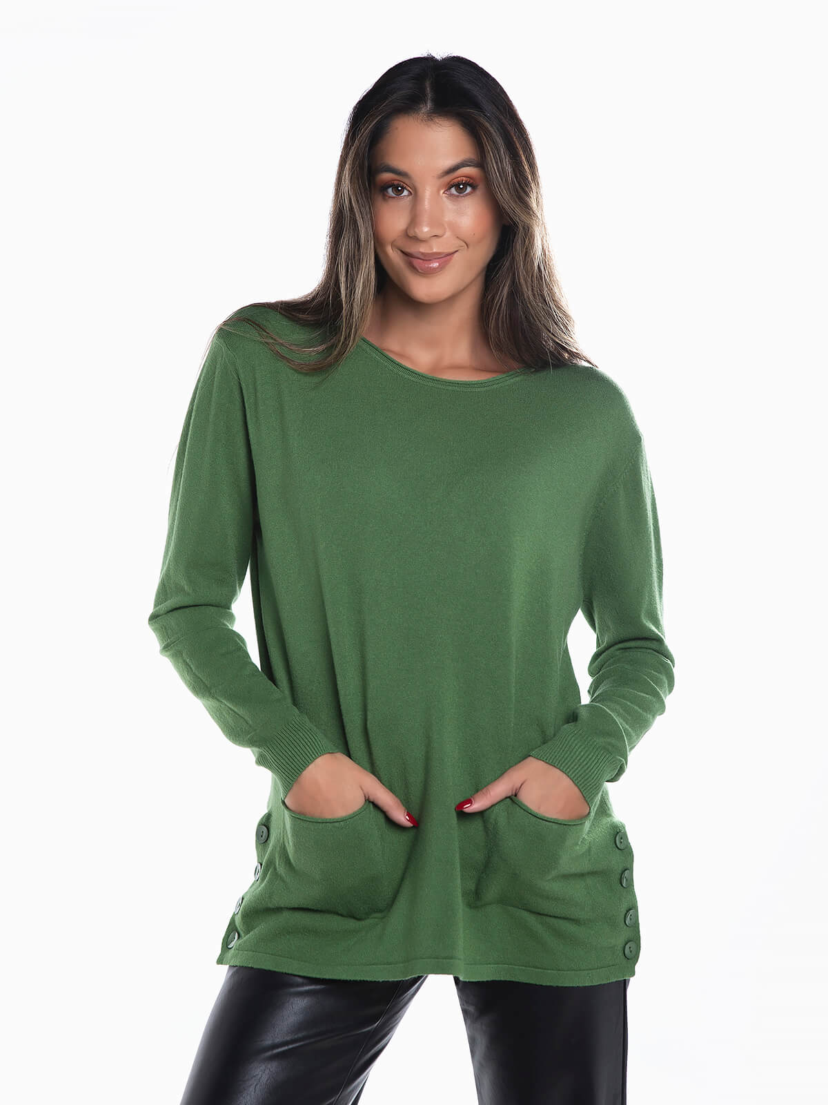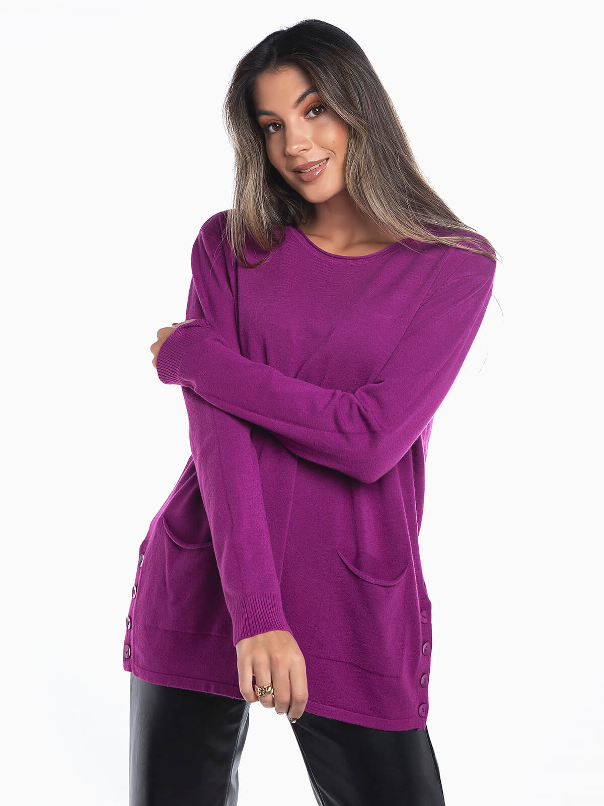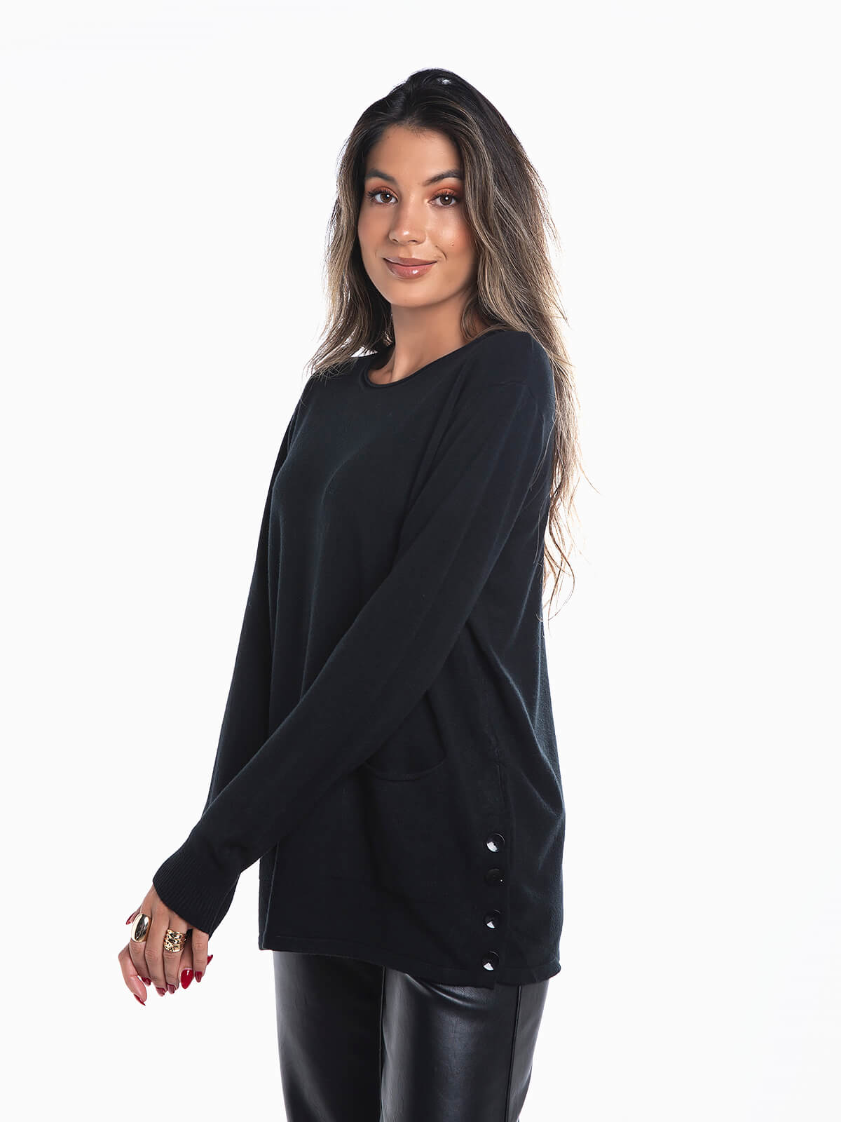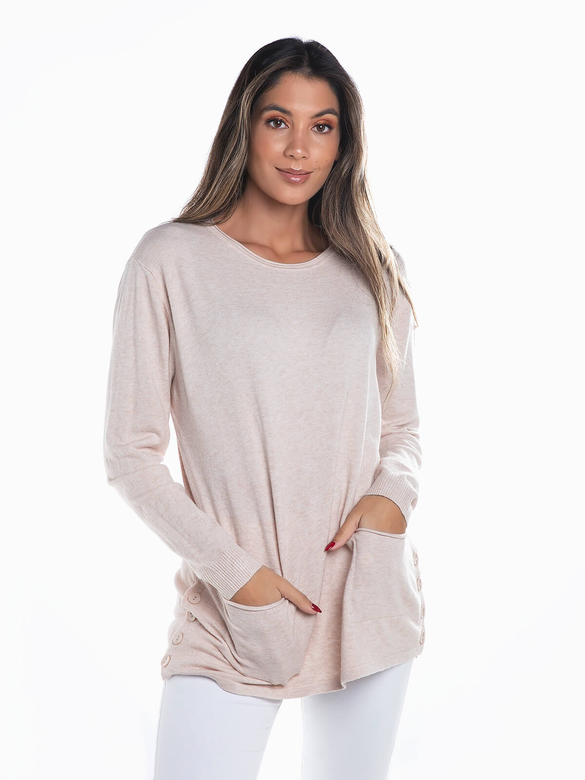 Camisola em malha fina com bolsos quadrados à frente. Camisola manga comprida com botões laterais. Decote redondo.