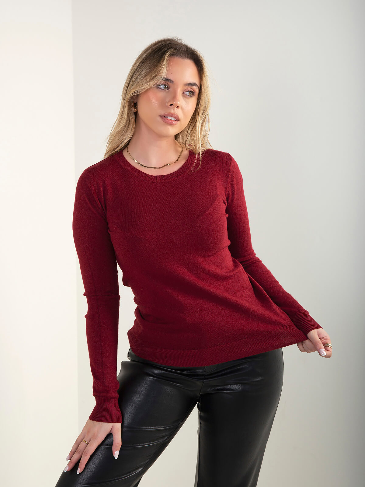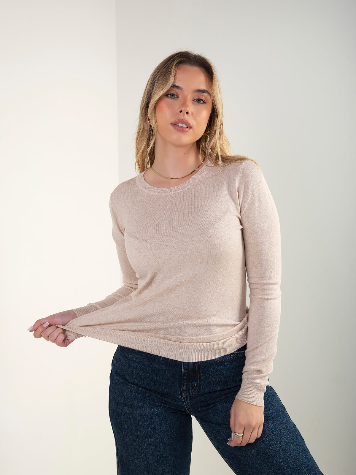 Camisola de malha fina com decote redondo, feita numa mistura de lã, seda, algodão e cashemira para máximo conforto. Suave, leve e perfeita para looks básicos e elegantes dentro da moda acessível.