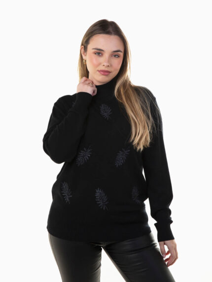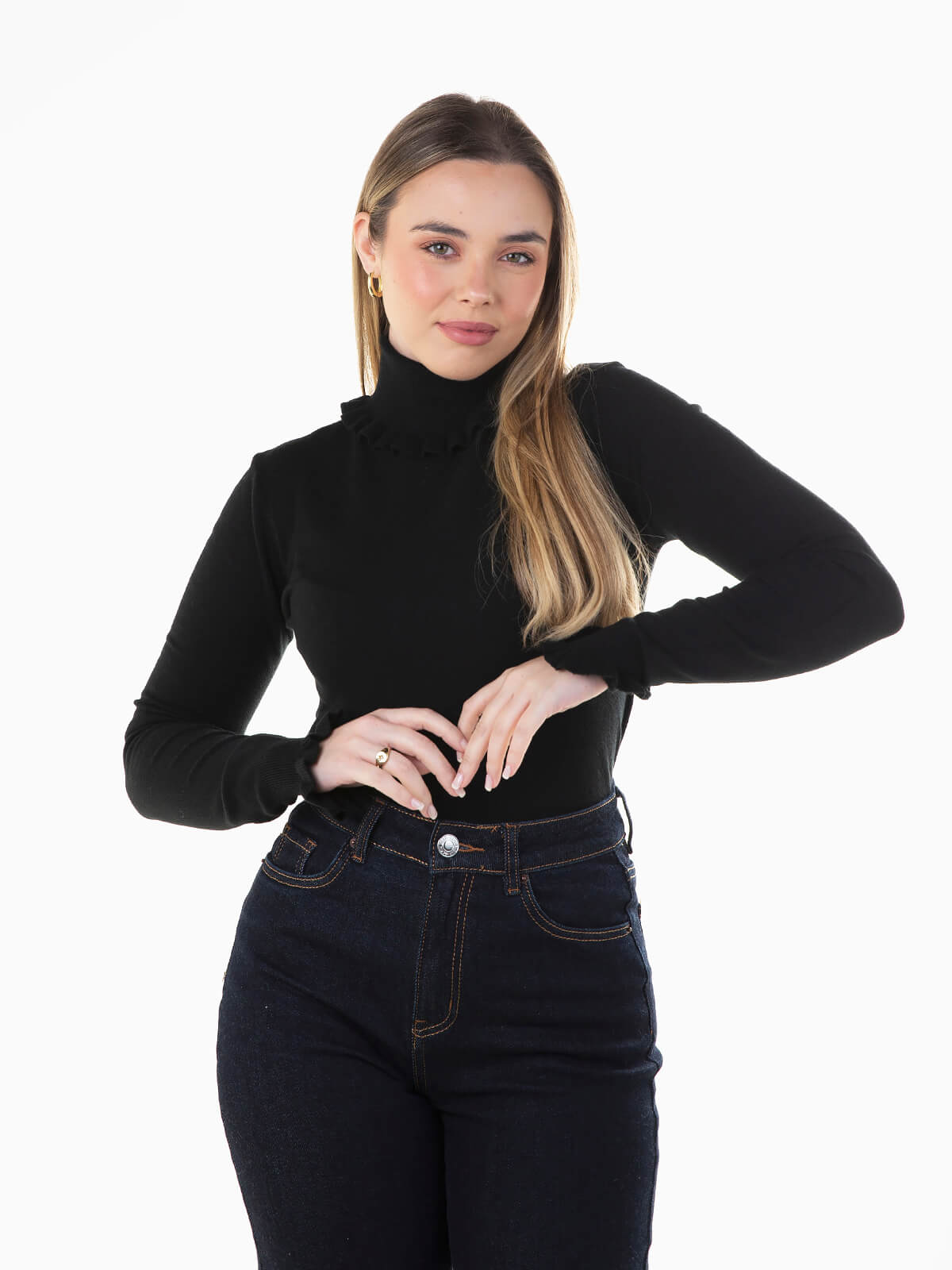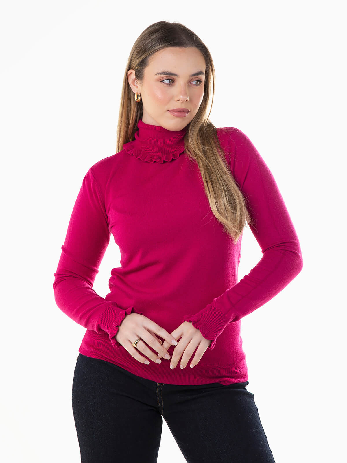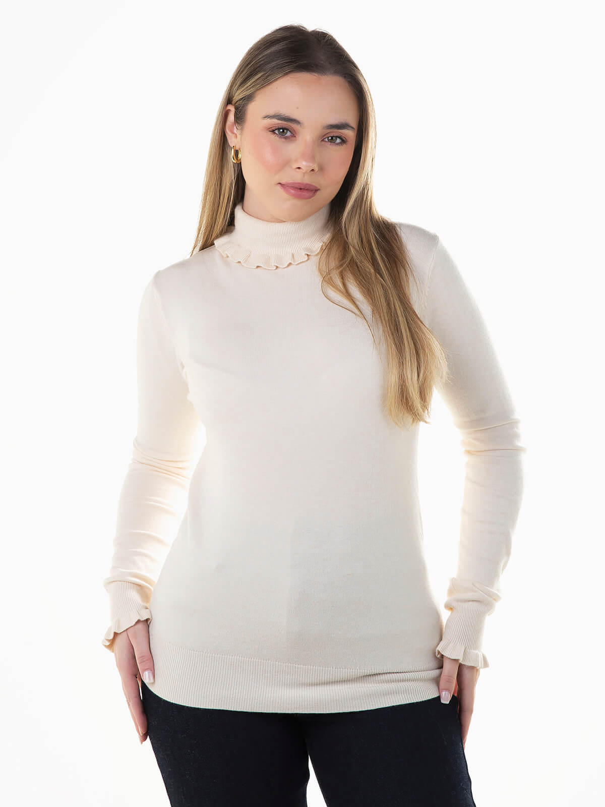 Camisola malha fina e confortável combinada com folhos nas extremidades. Camisola de manga comprida com gola alta dobrada. Acabamentos canelados.