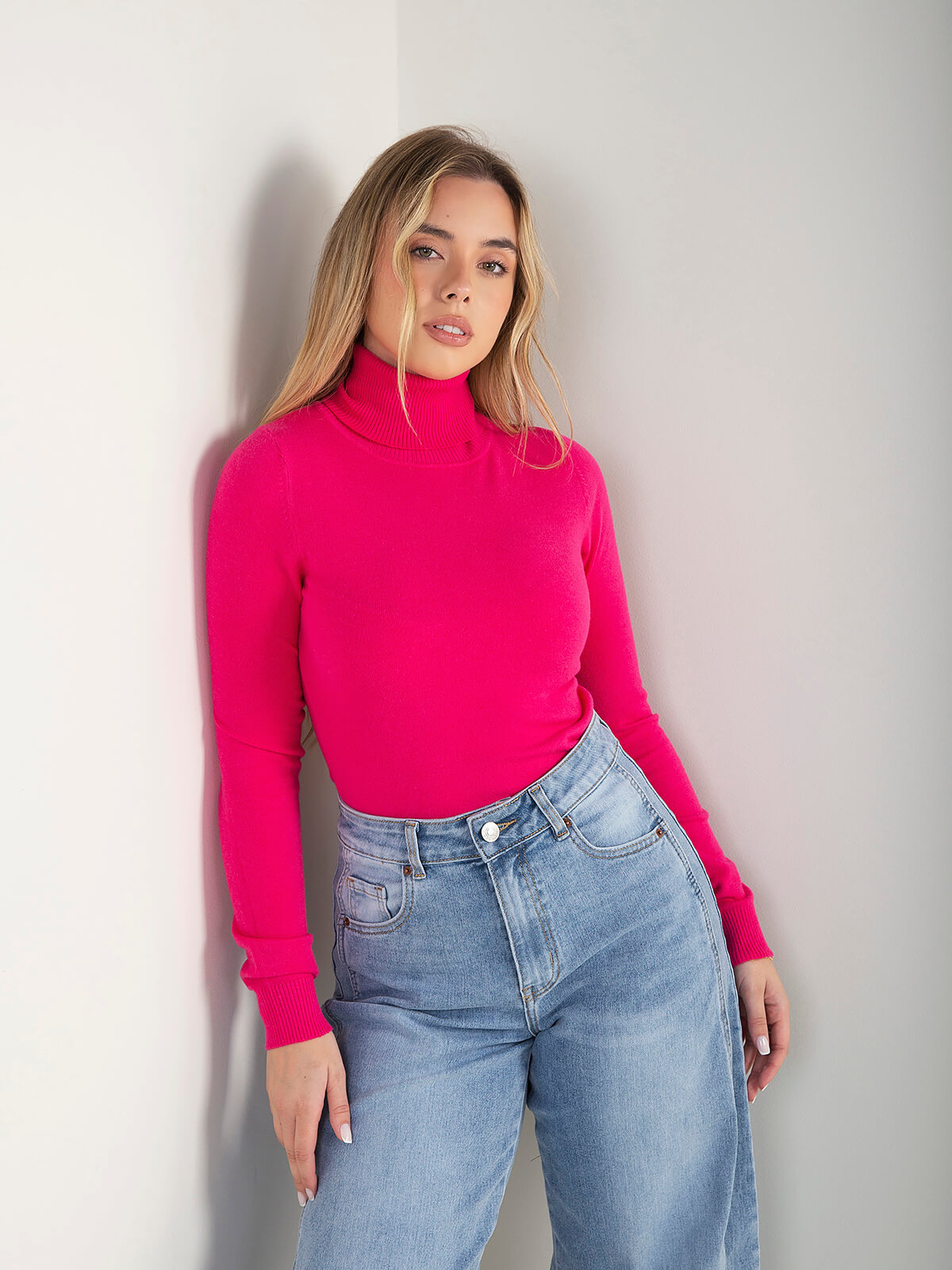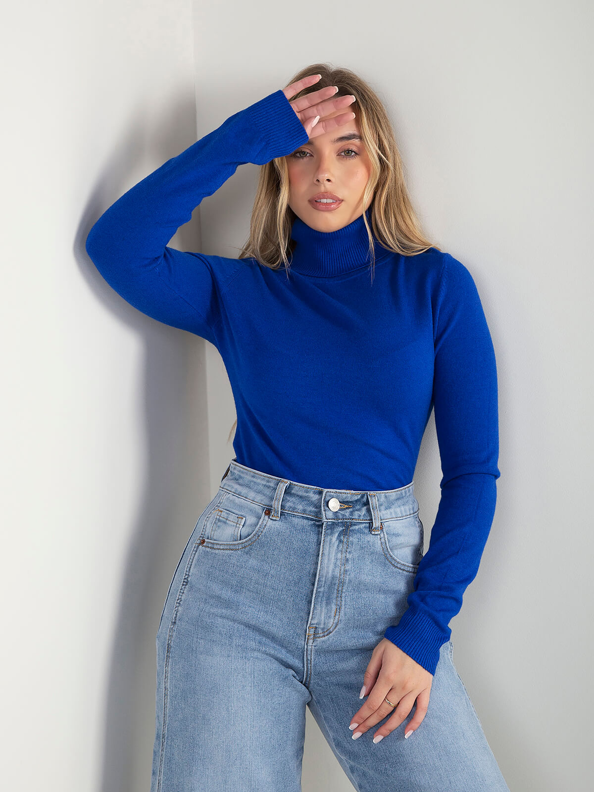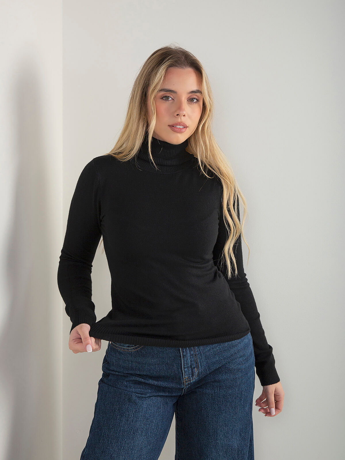 Camisola de malha fina com gola alta, manga comprida e acabamento canelado na gola, punhos e barra. Modelo confortável e um essêncial da estação.