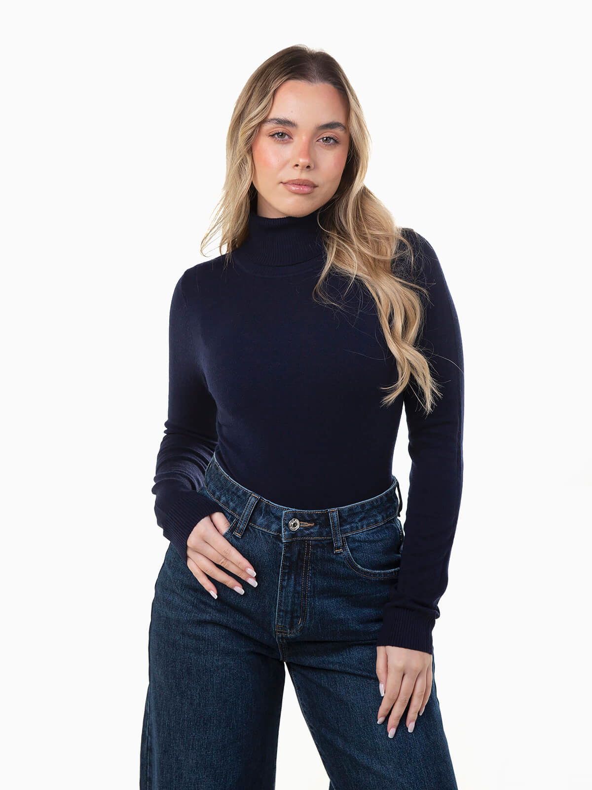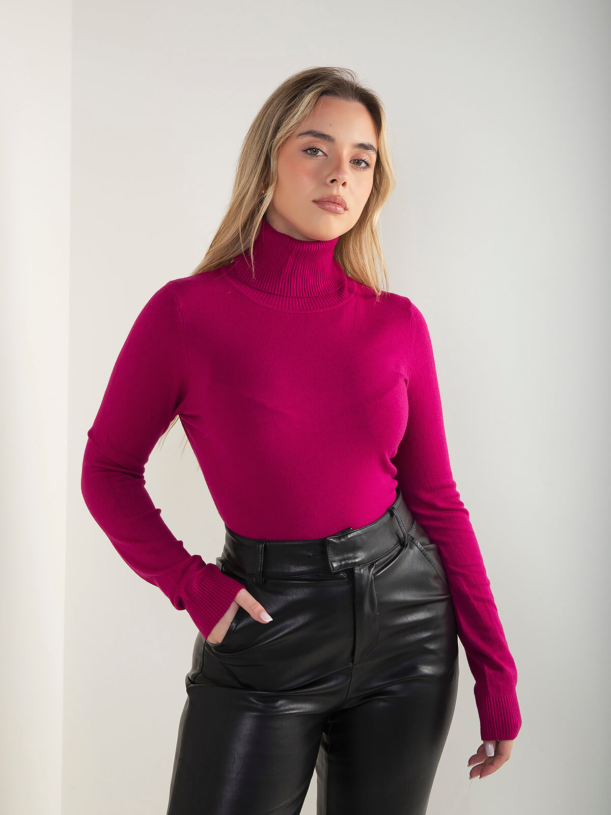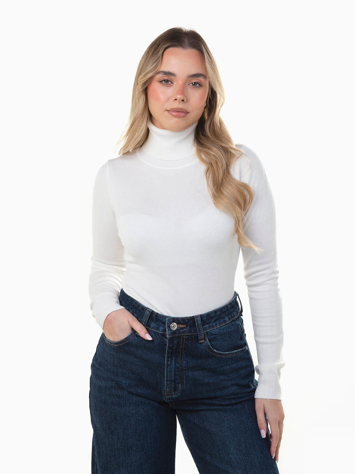 Camisola de malha fina com gola alta, manga comprida e acabamento canelado na gola, punhos e barra. Modelo confortável e um essêncial da estação.