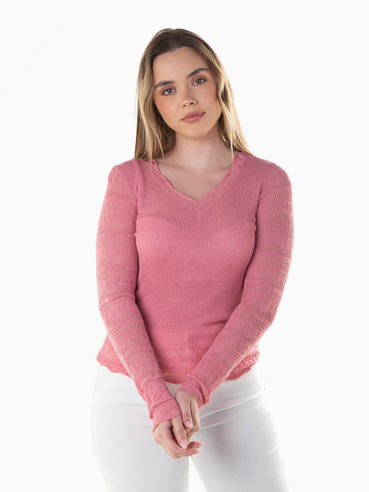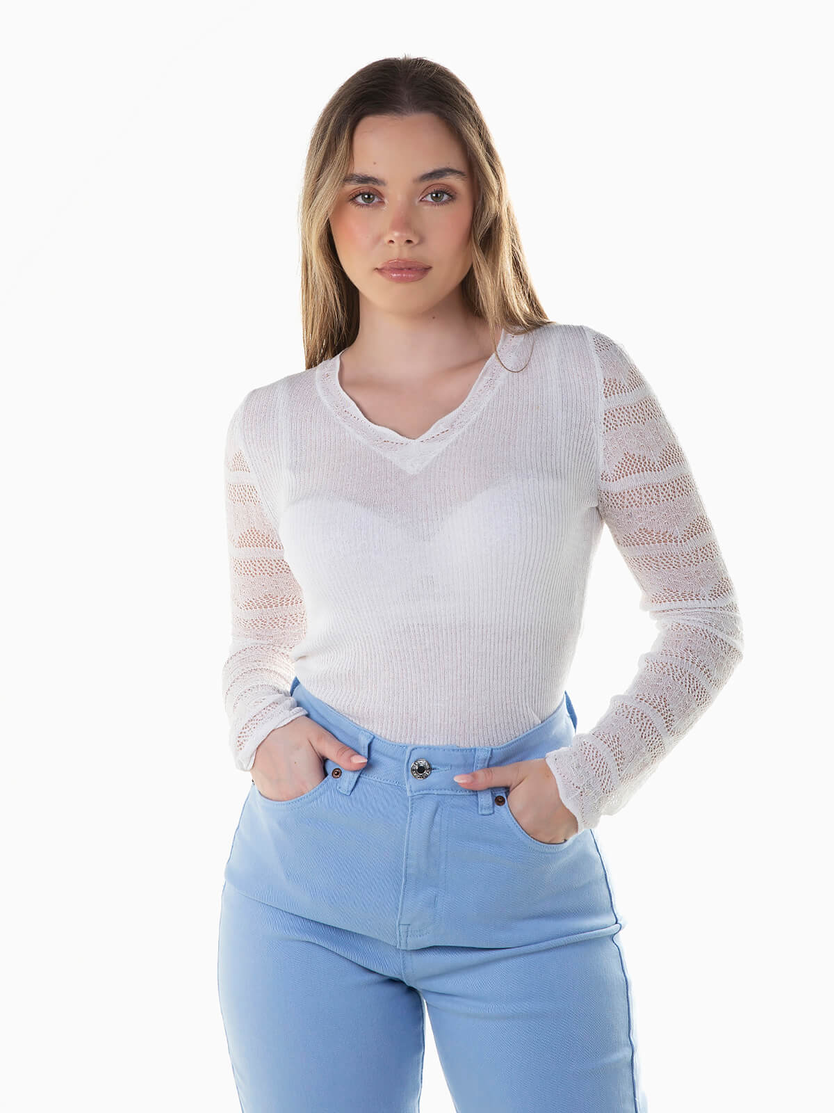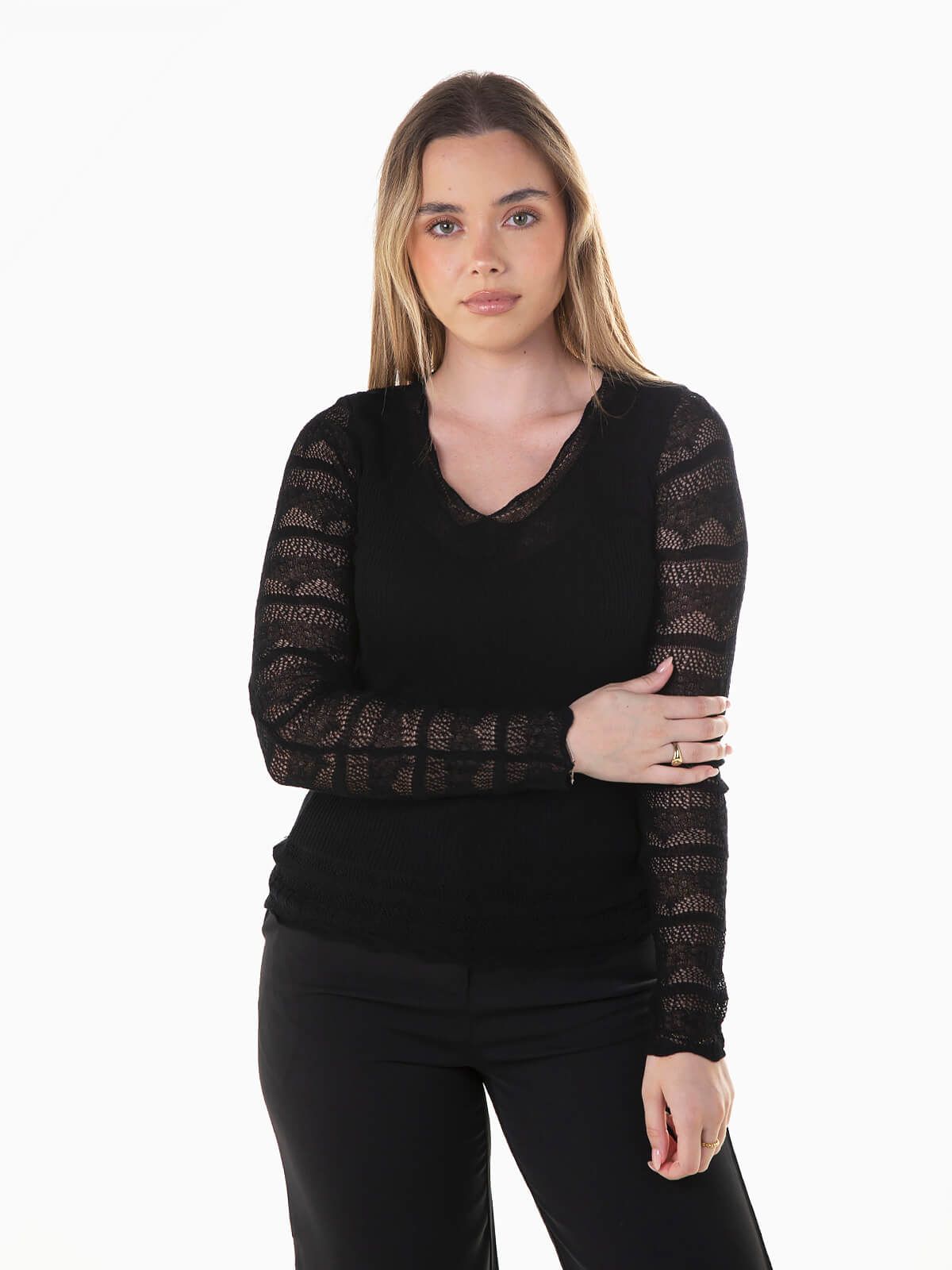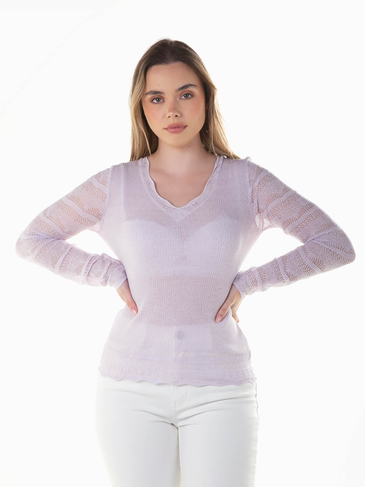 Camisola de malha comprida combinada com renda nos braços e cós. Camisola semitransparente com decote em bico e pormenor rendilhado, confecionada com mistura de seda.