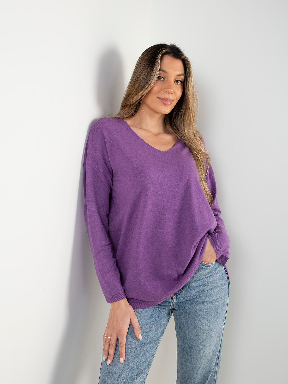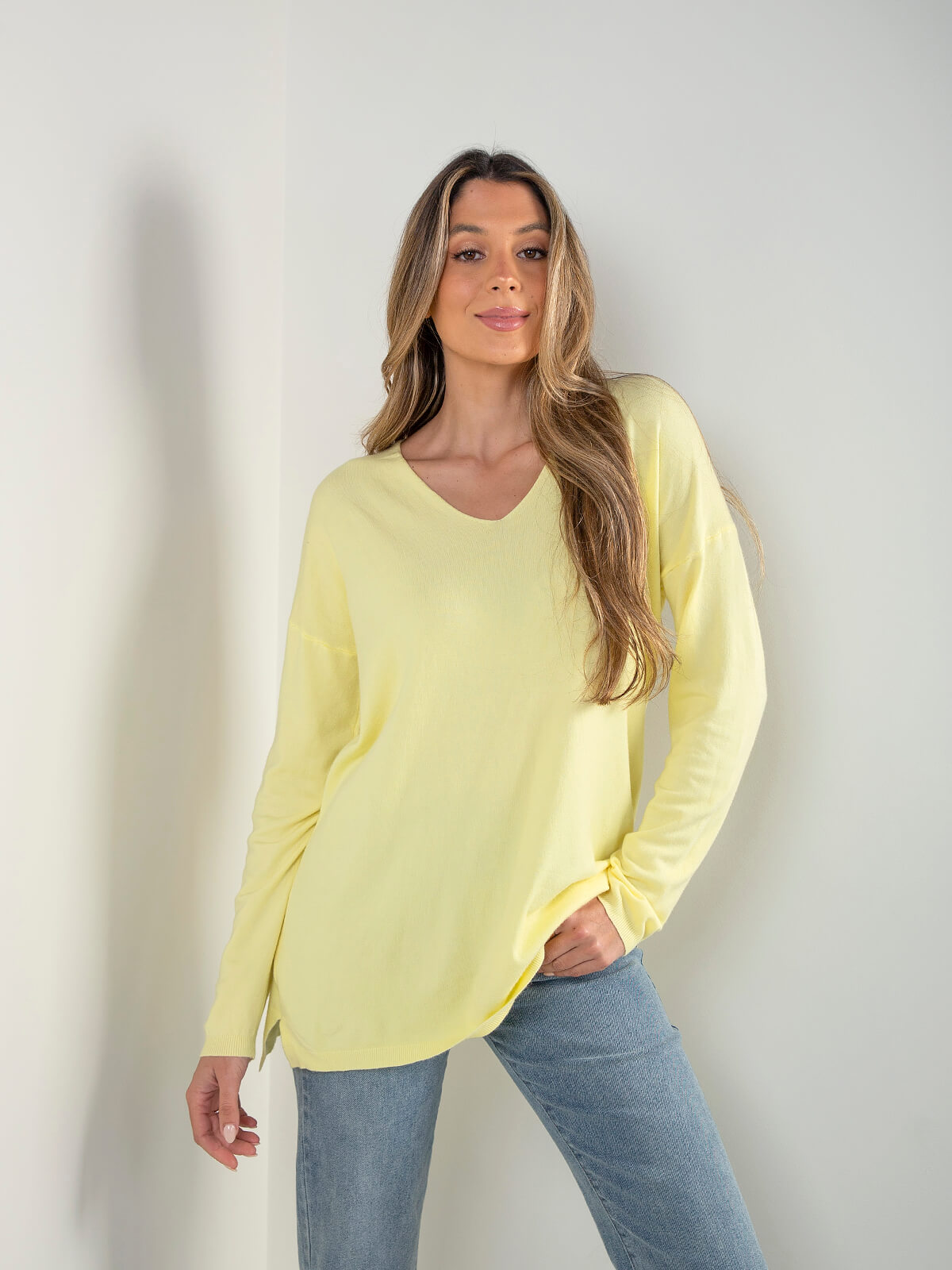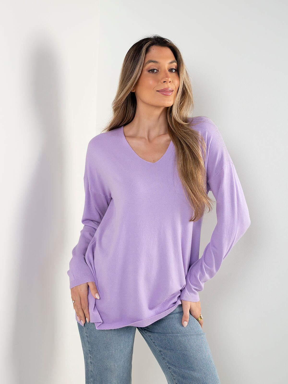 Camisola de malha fina com corte oversized, decote em V e aberturas laterais na base. Modelo leve, confortável e fácil de conjugar em diferentes estilos.