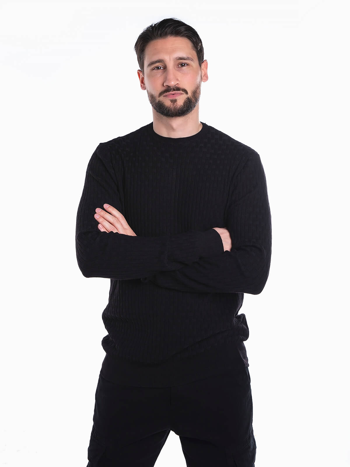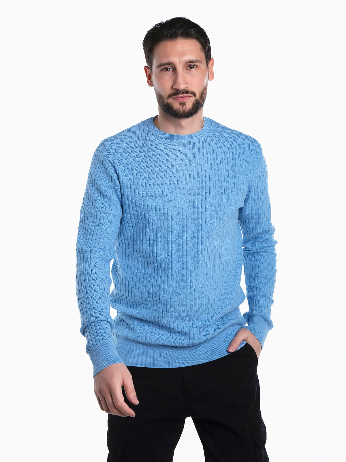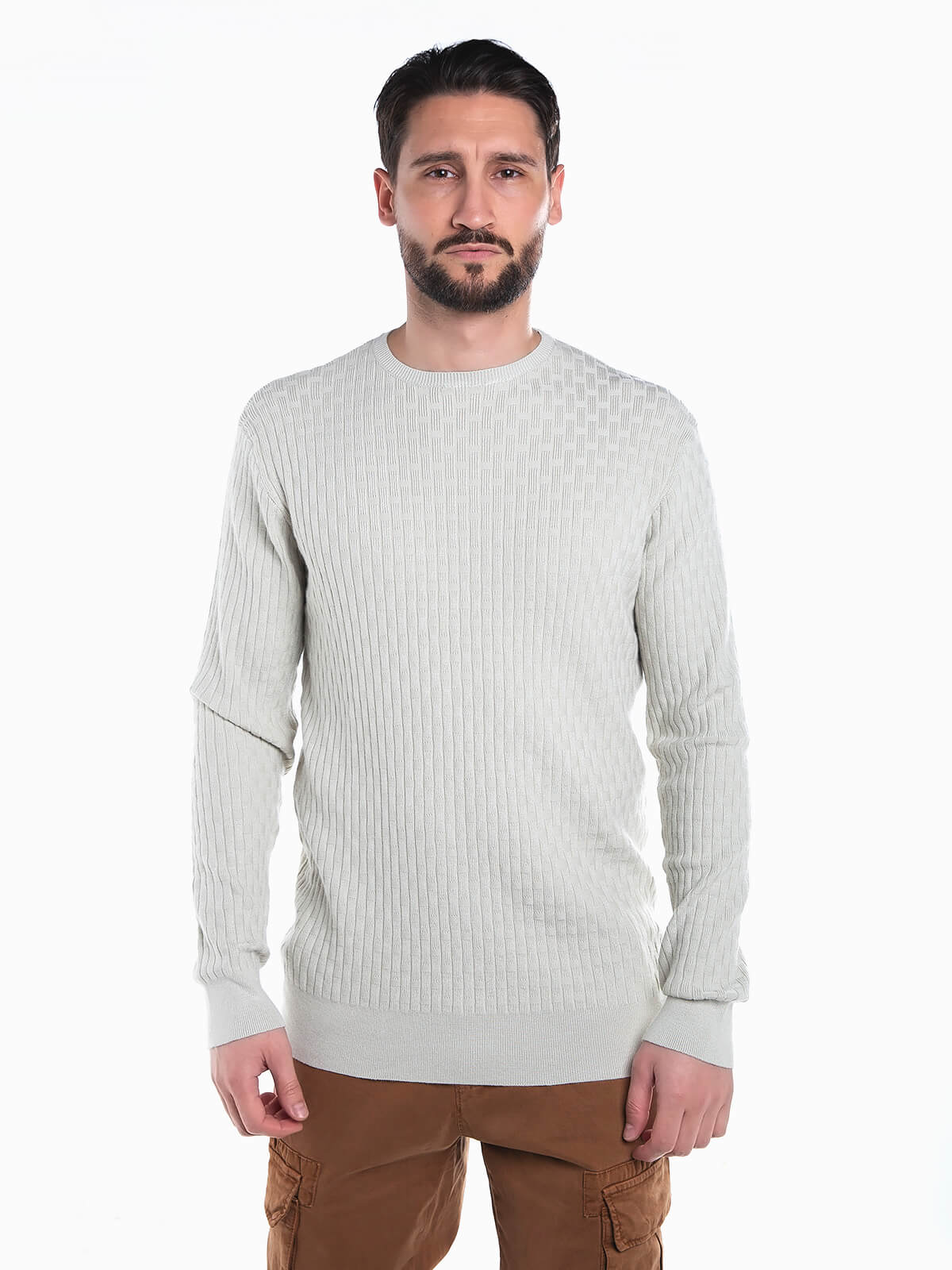 Camisola em malha fina trabalhada para homem. Camisola manga comprida com gola redonda. Acabamentos em nervuras.