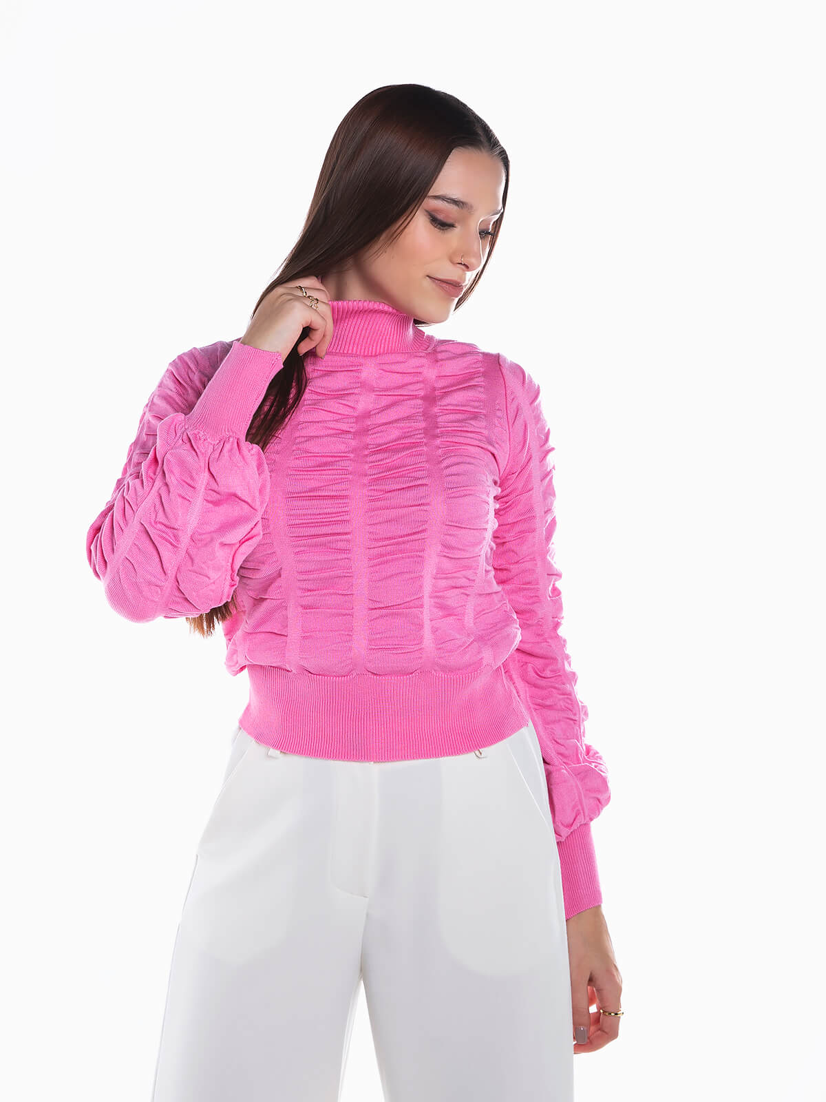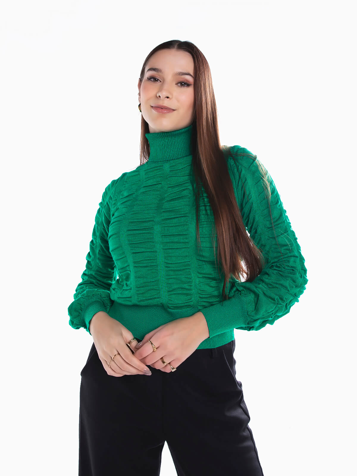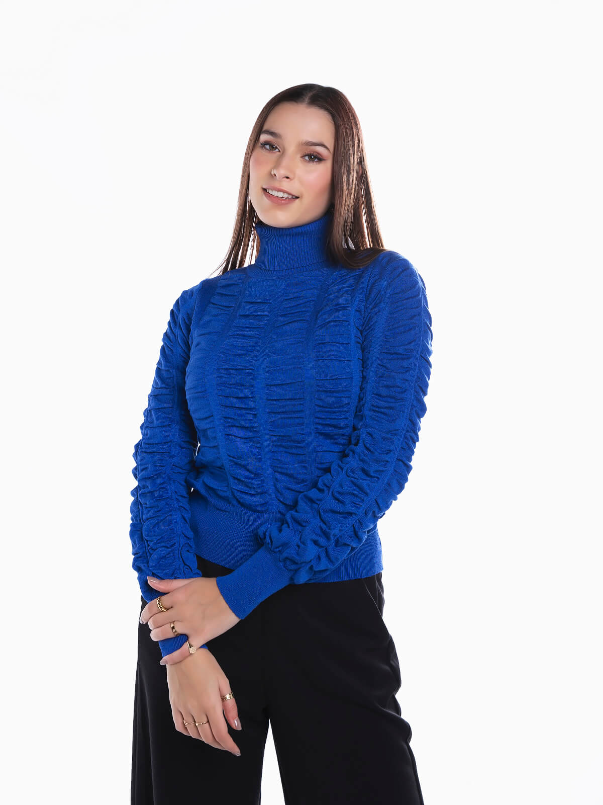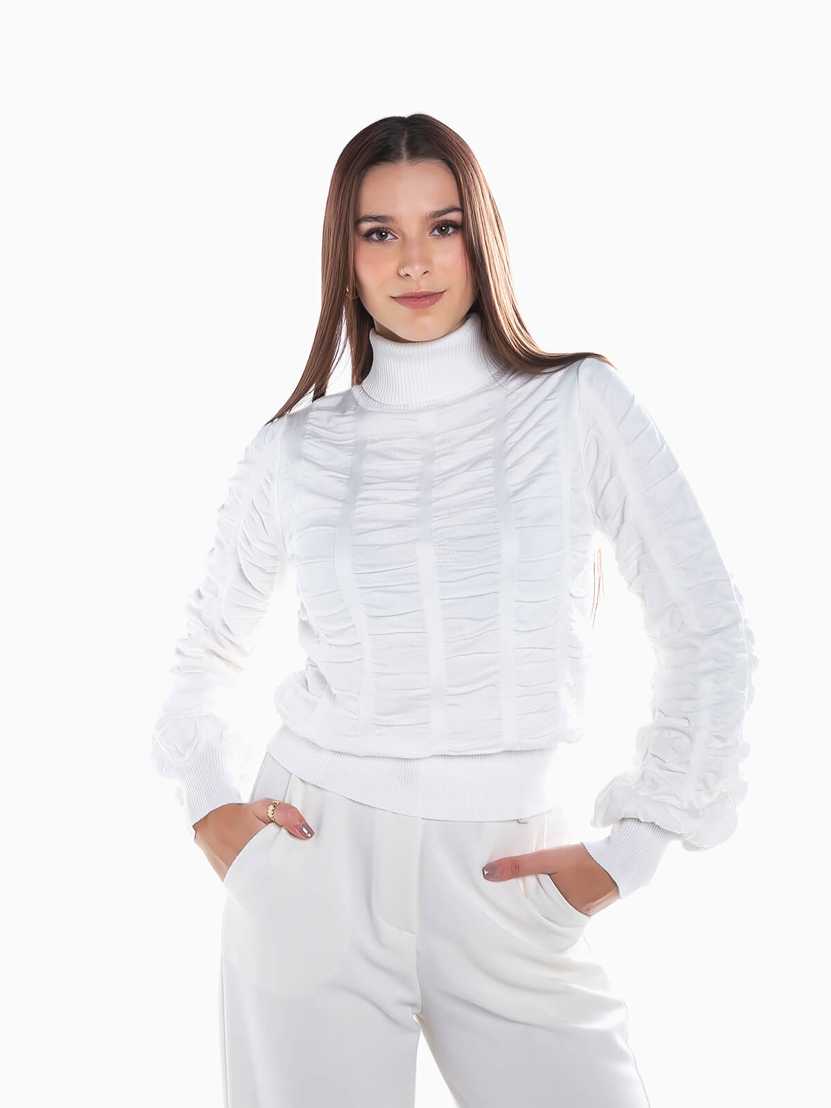 Camisola de malha franzida com gola alta para senhora. Camisola de manga comprida com acabamentos canelados.