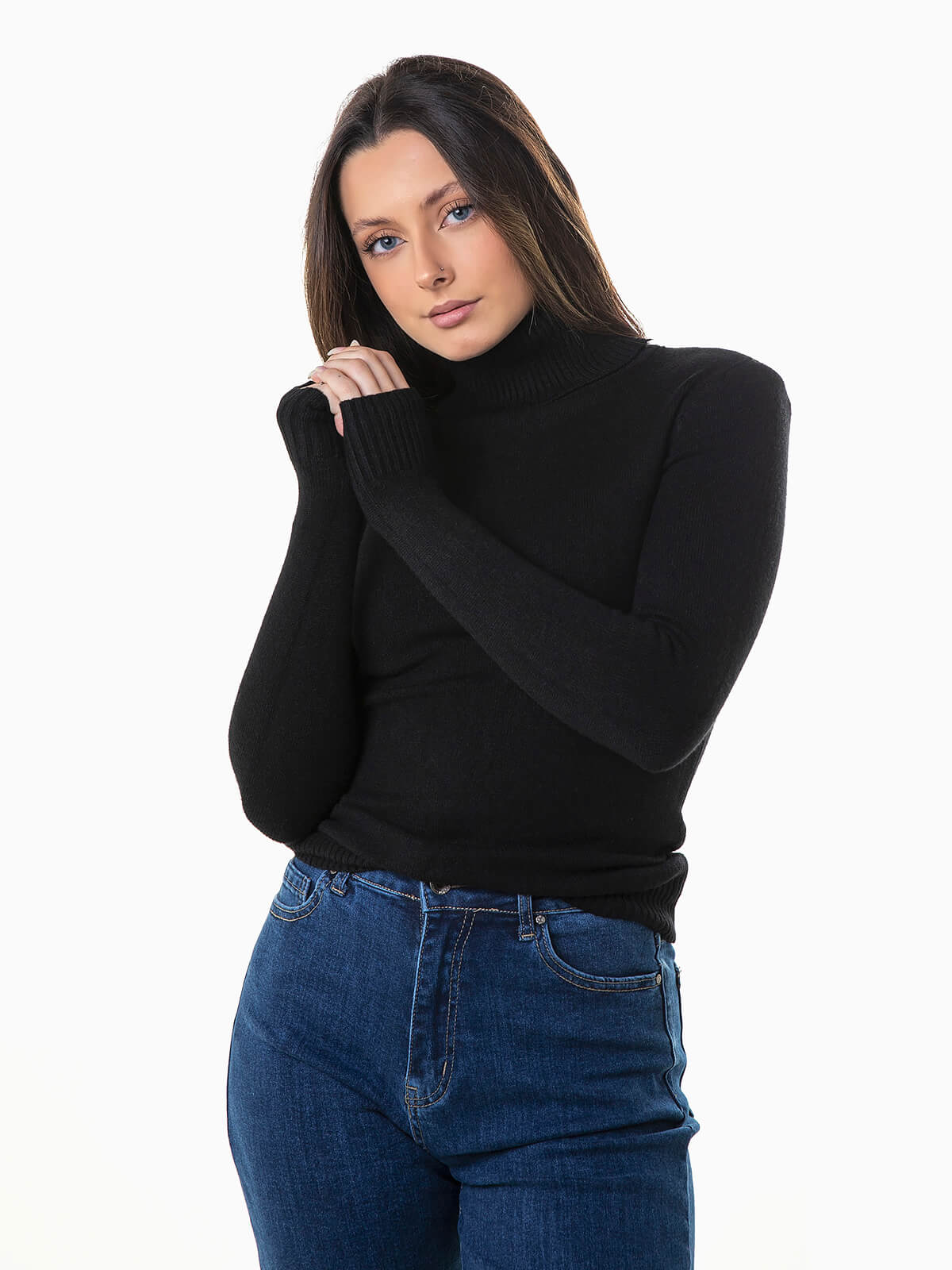 Camisola de malha com gola alta canelada para senhora. Camisola para senhora de manga comprida.