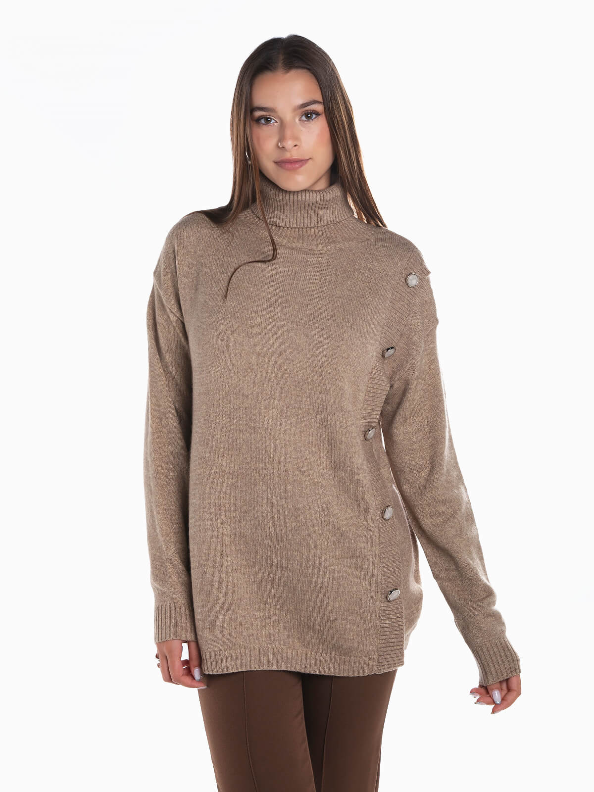 Camisola malha com gola alta e botões de pérolas decorativos. Camisola oversize manga comprida com acabamentos canelados.