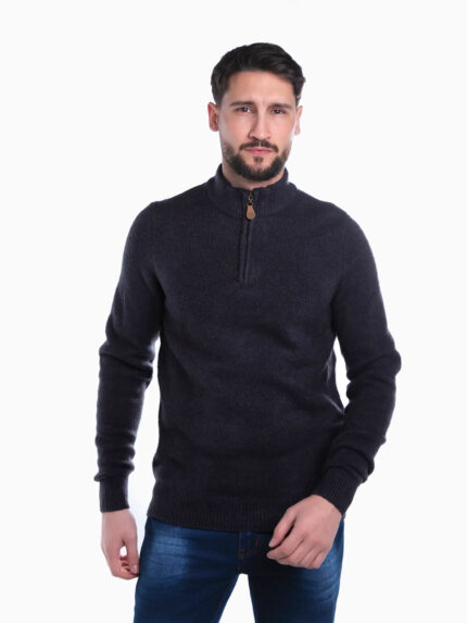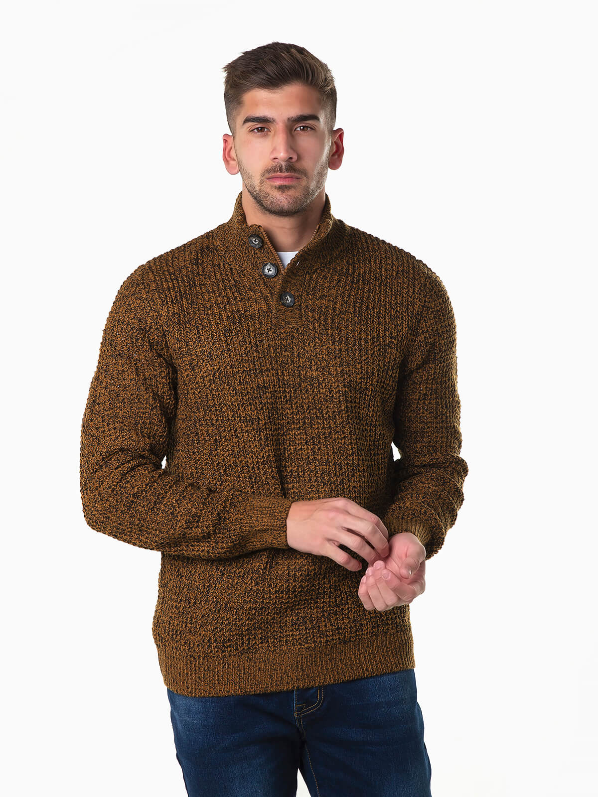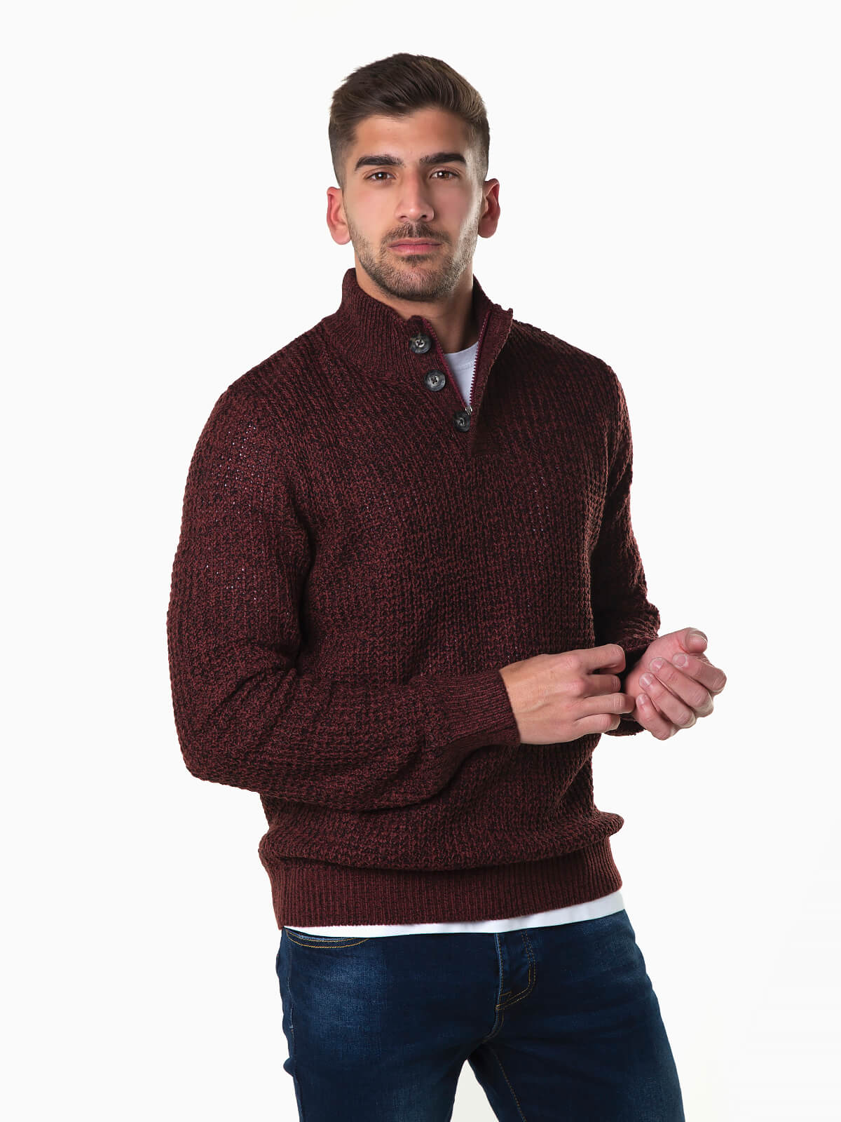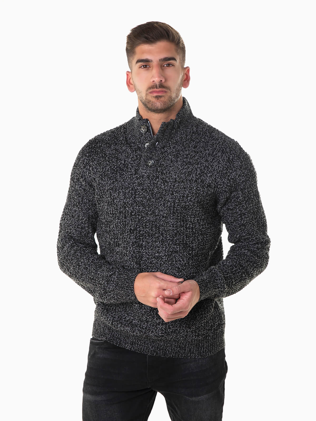 Camisola malha mesclada com gola alta e aperto de botões. Camisola para homem de manga comprida com acabamentos canelados.