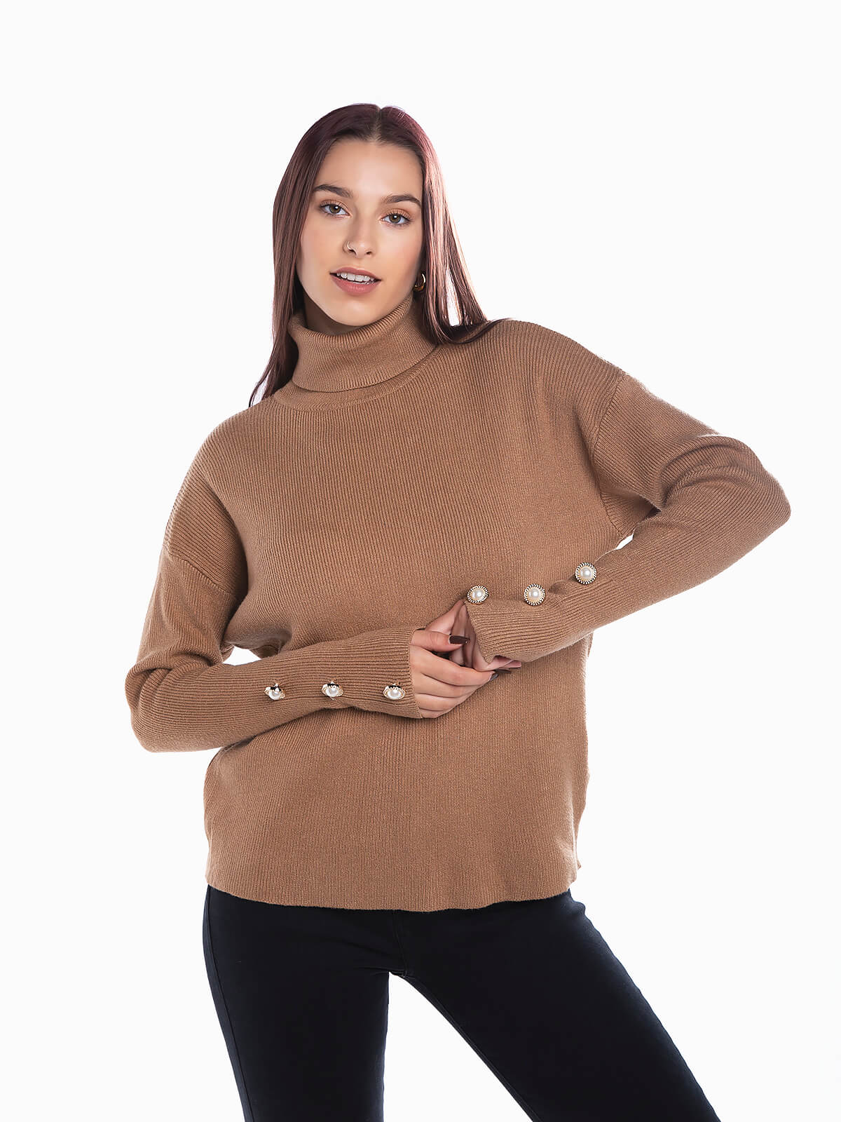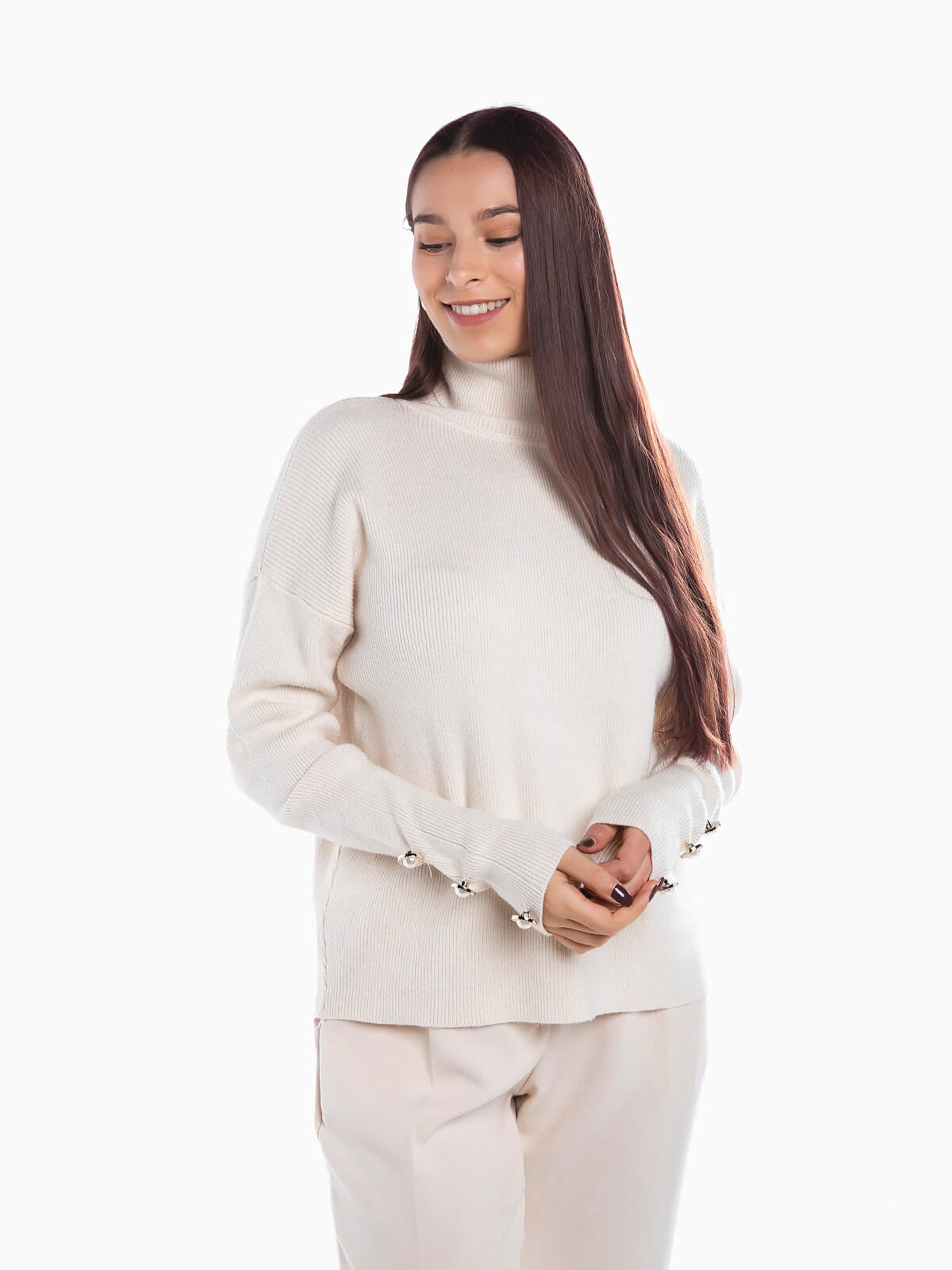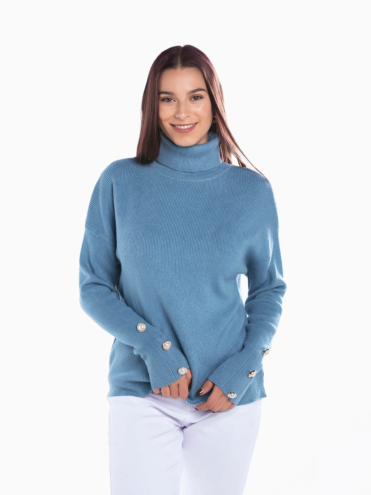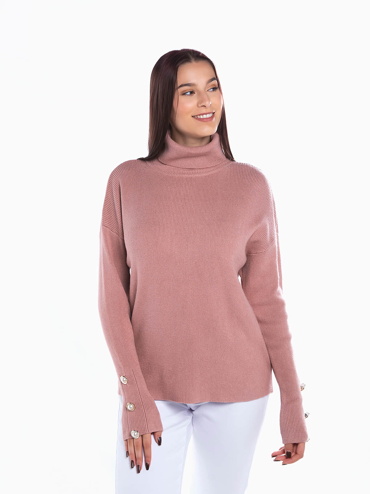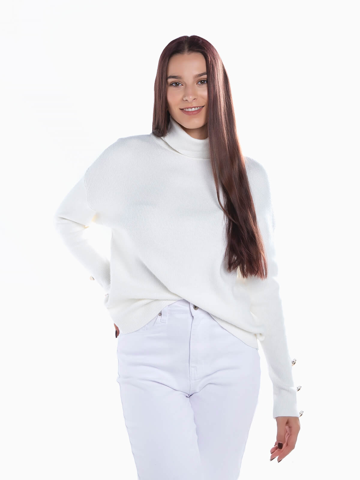 Camisola de malha canelada gola alta com botões aplicados nos punhos. Camisola de manga comprida com ombros descaídos.