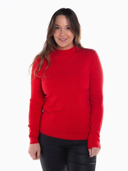 Camisola em malha com estrutura lisa e canelada. Camisola curta manga comprida com gola alta dobrada.