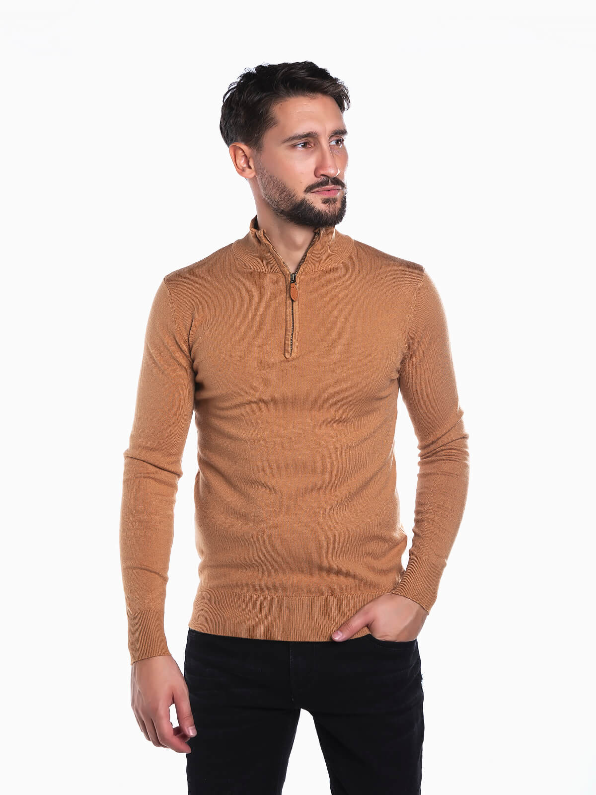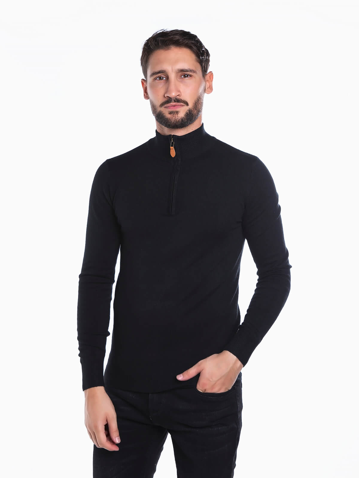 Camisola de malha com gola alta e fecho éclair para homem. Camisola justa de manga comprida. Acabamentos em nervuras.