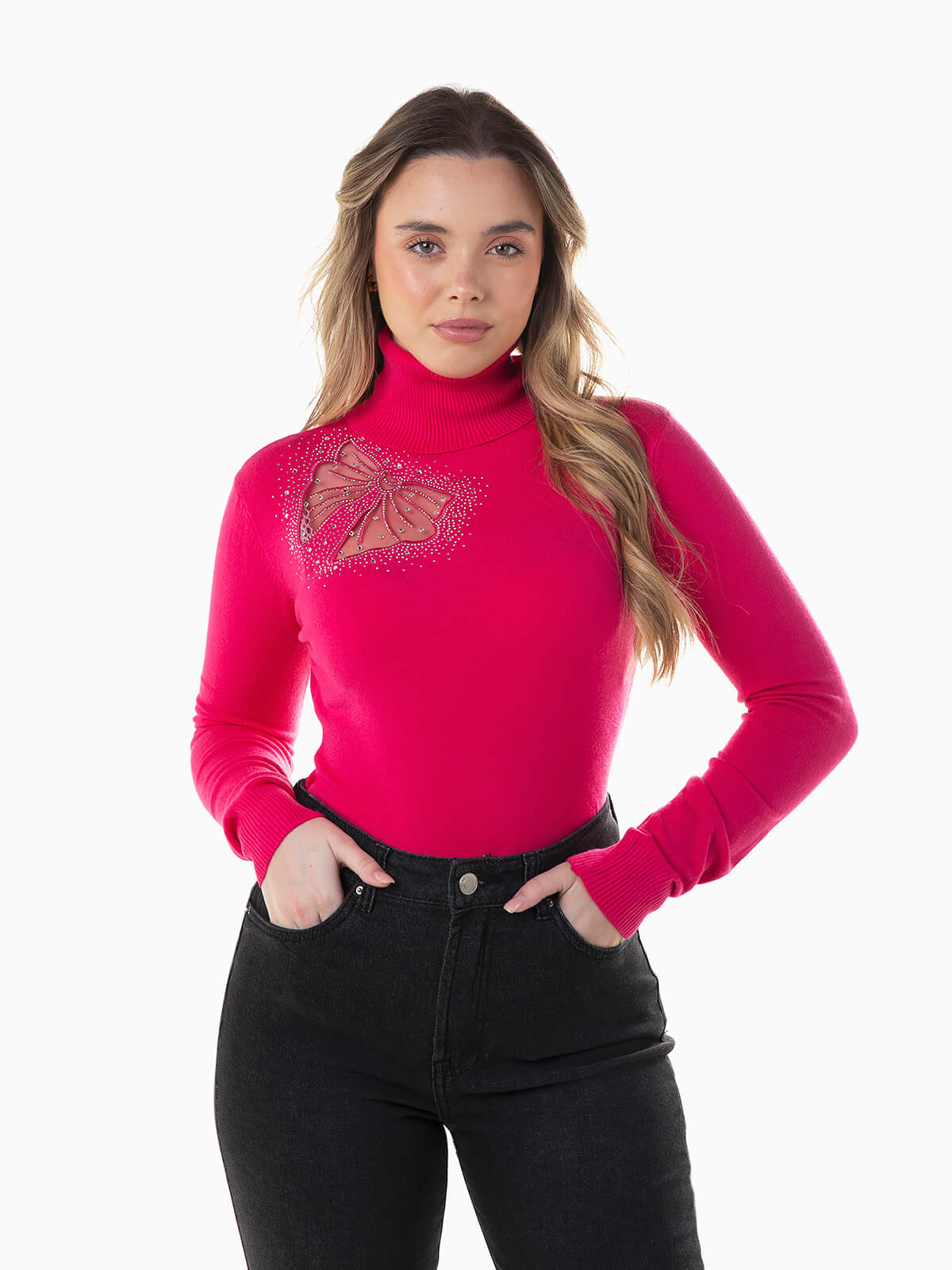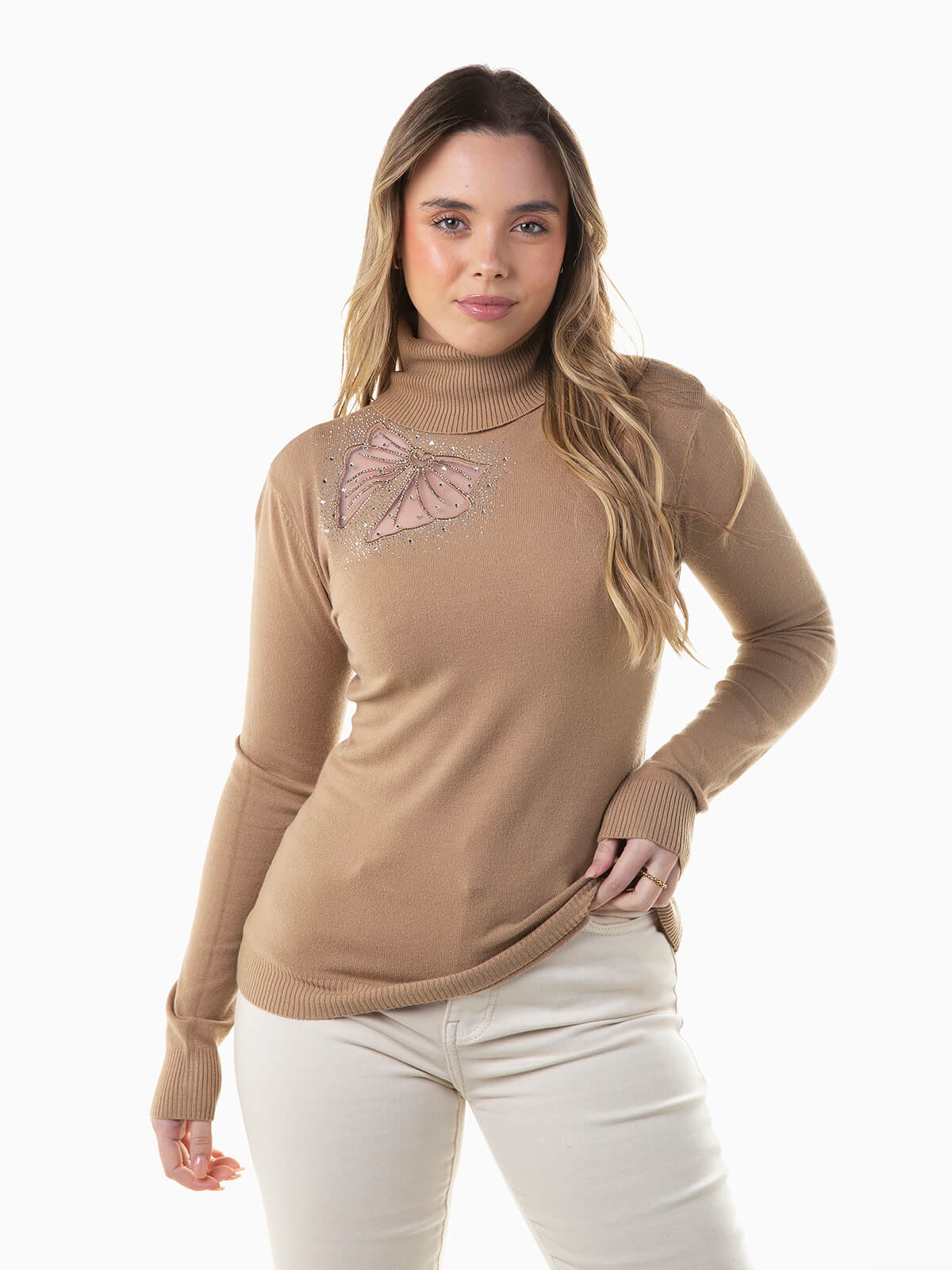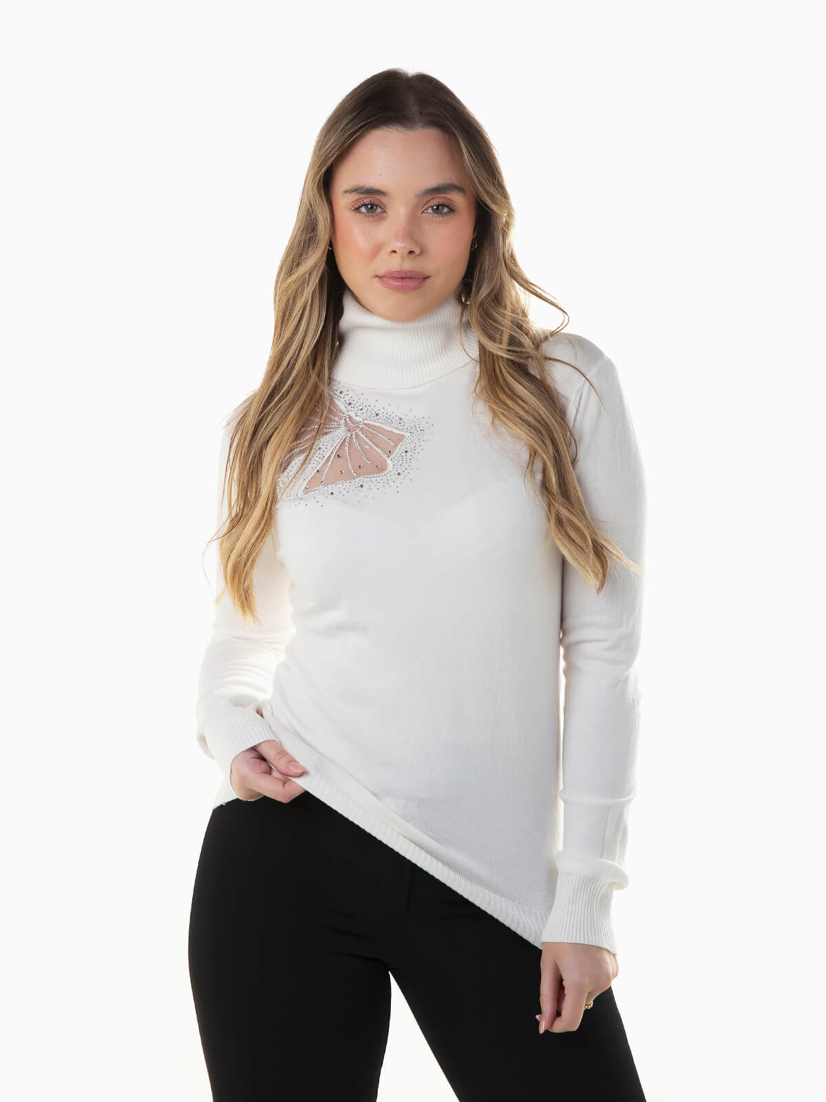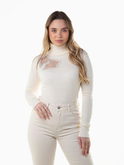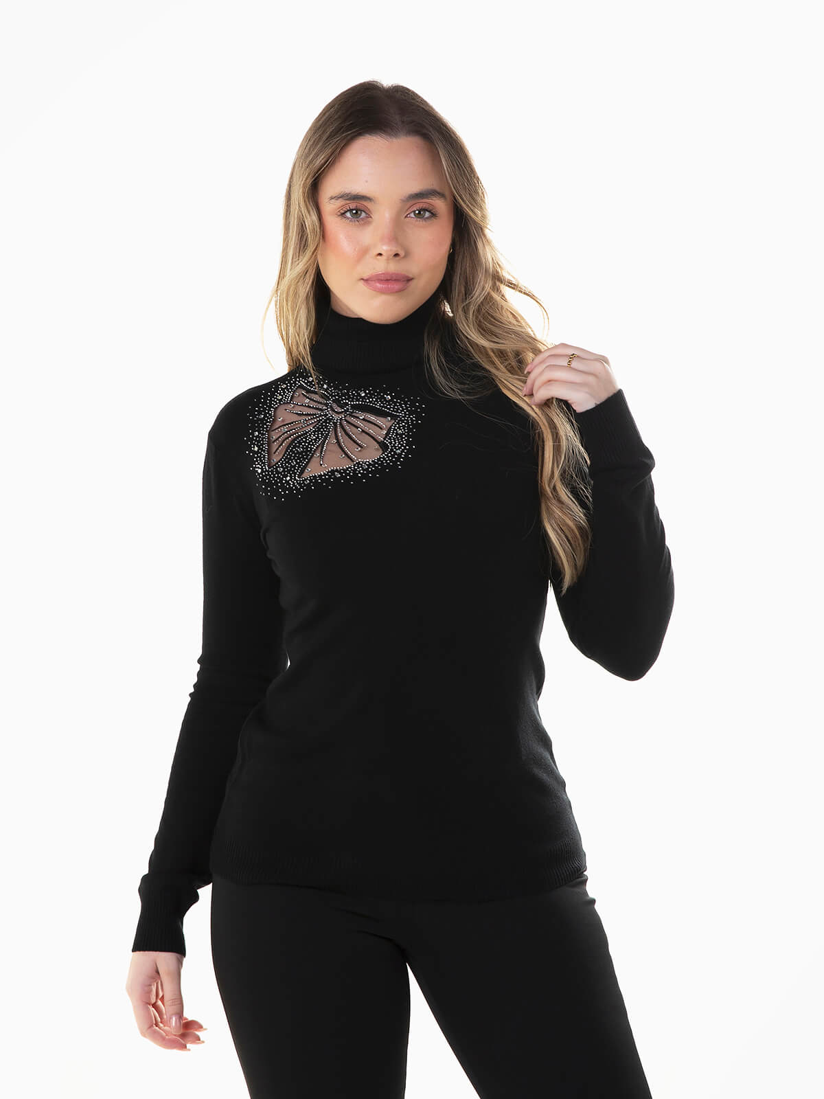 Camisola de malha com laço transparente e strass aplicado. Camisola de manga comprida com gola alta dobrada. Acabamentos canelados.