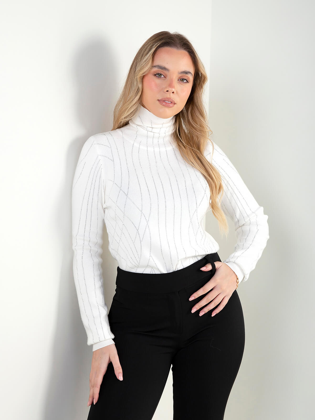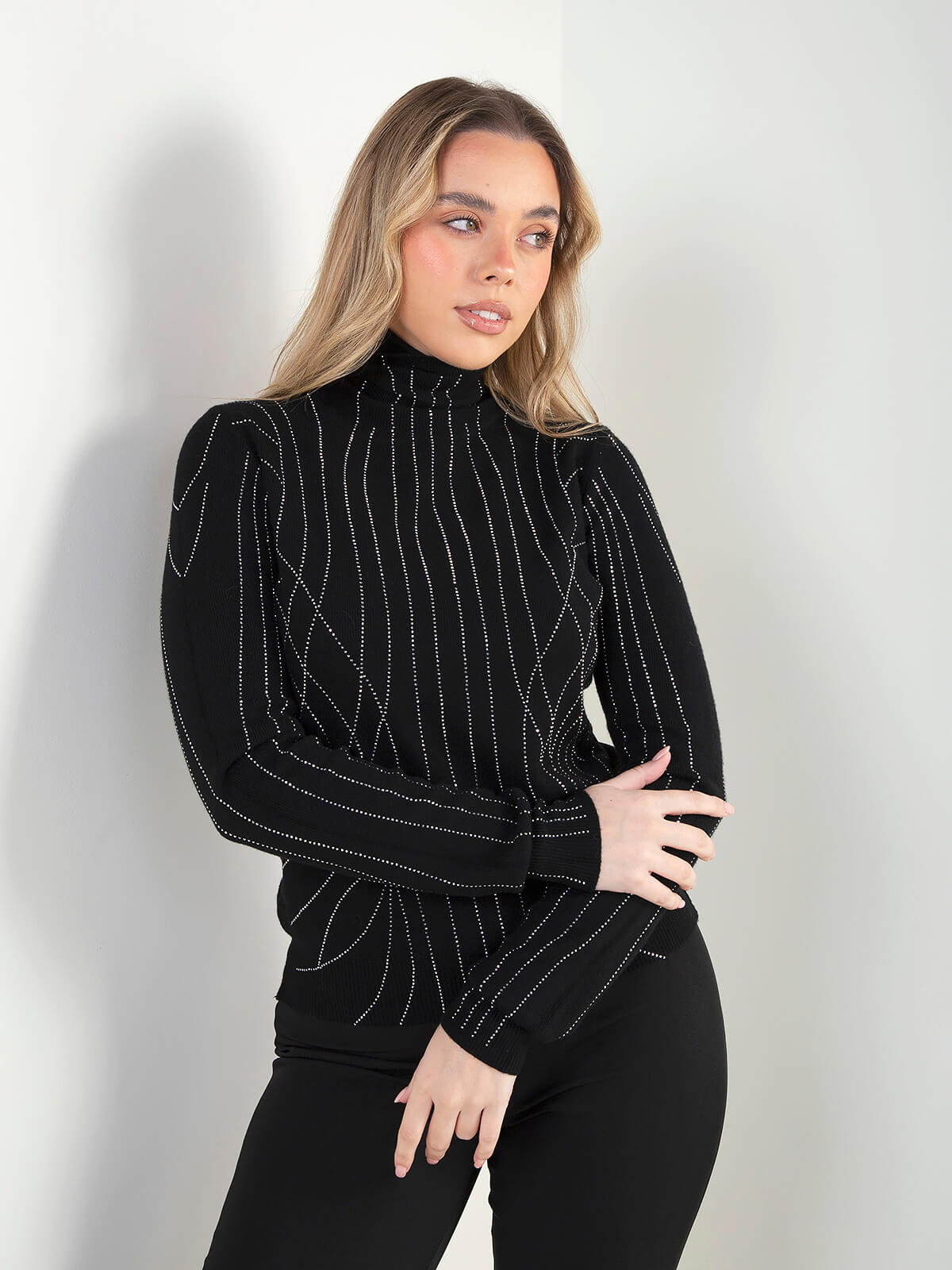 Camisola de malha com gola alta e padrão geométrico em strass, que acrescenta detalhe ao look sem perder sobriedade. Um modelo versátil, ideal para conjugar com calças de alfaiataria, ganga ou looks mais formais.