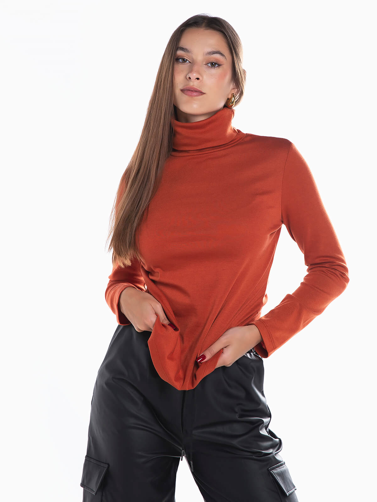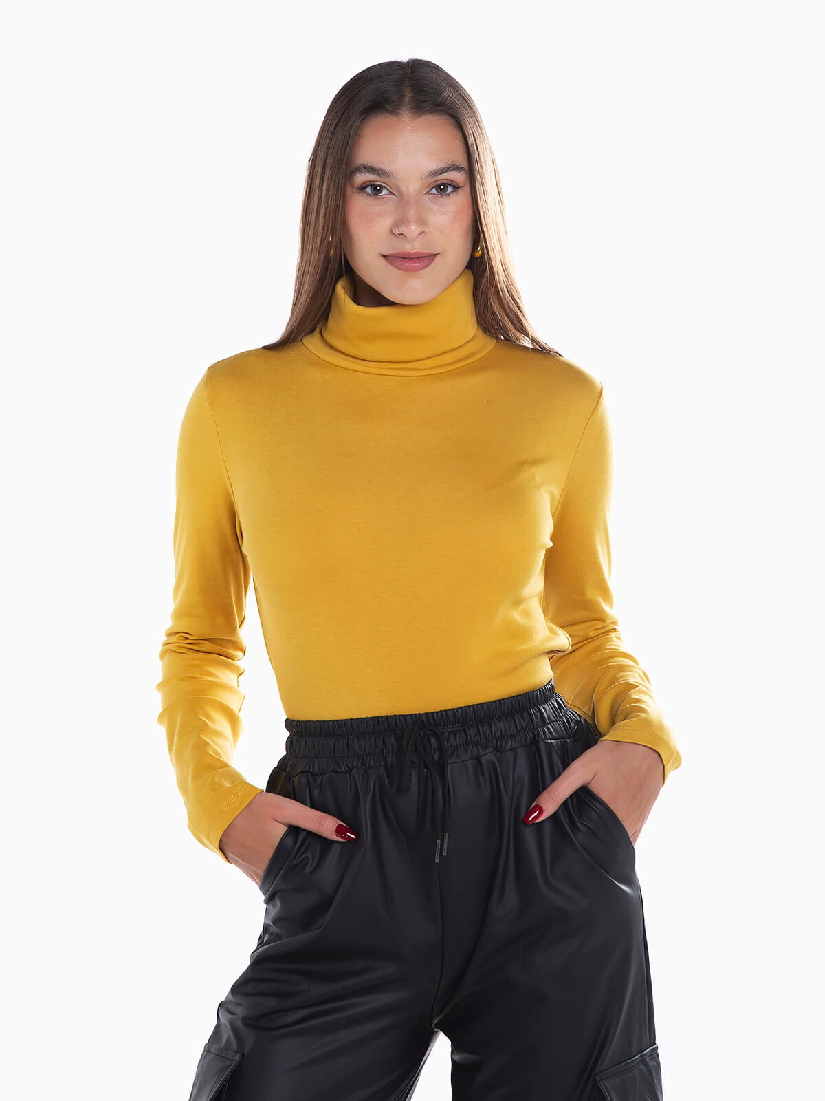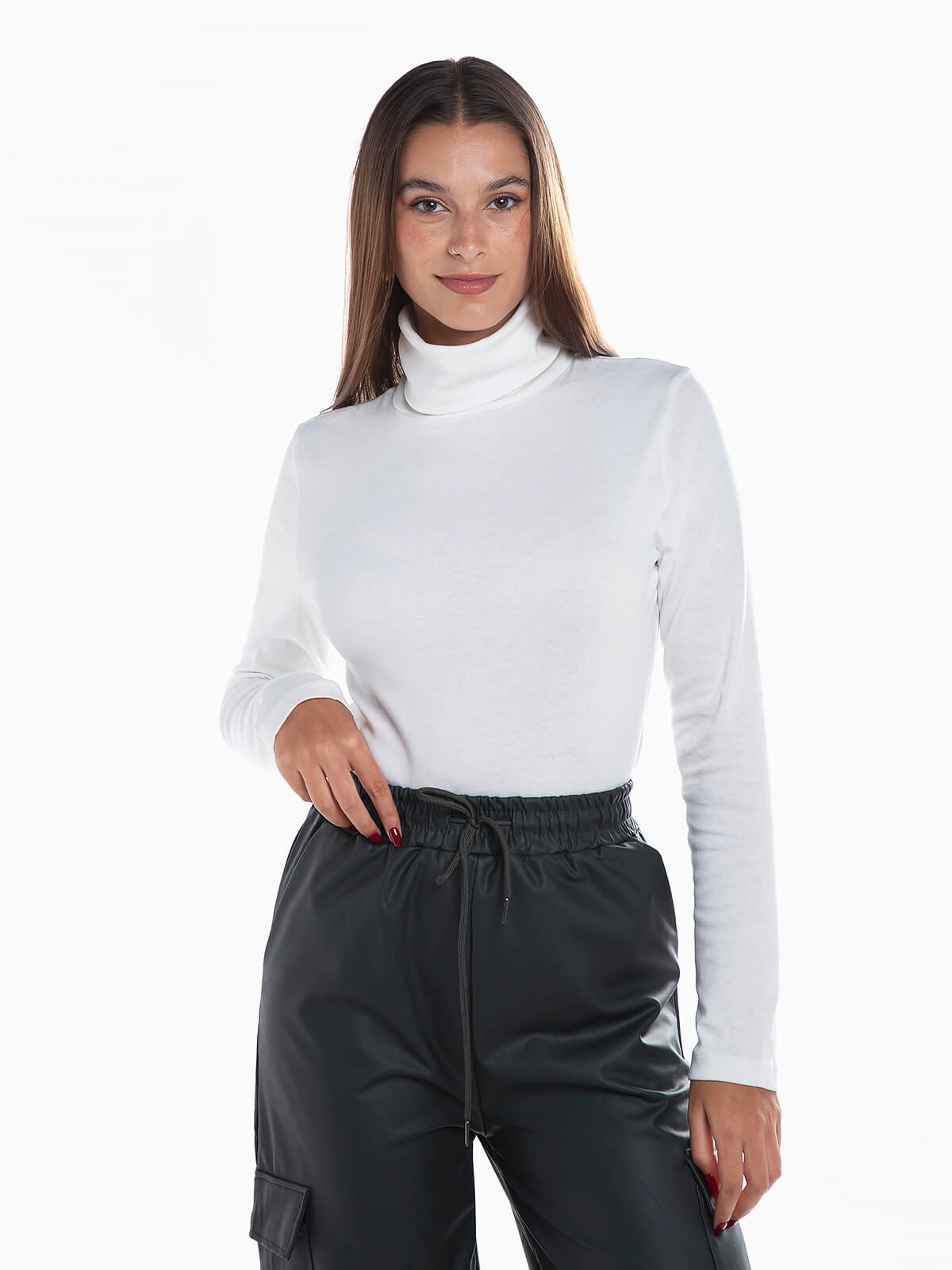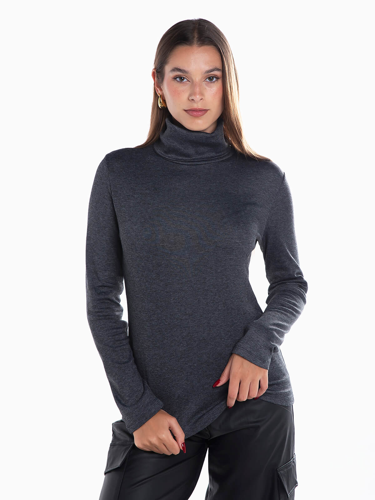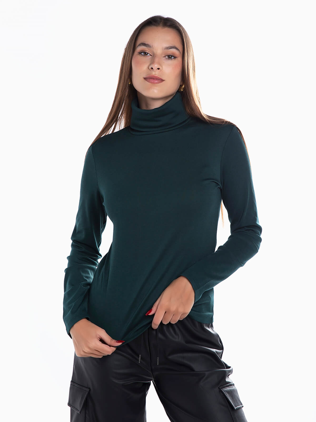 Camisola malha com gola alta dobrada para senhora. Camisola elástica com manga comprida.