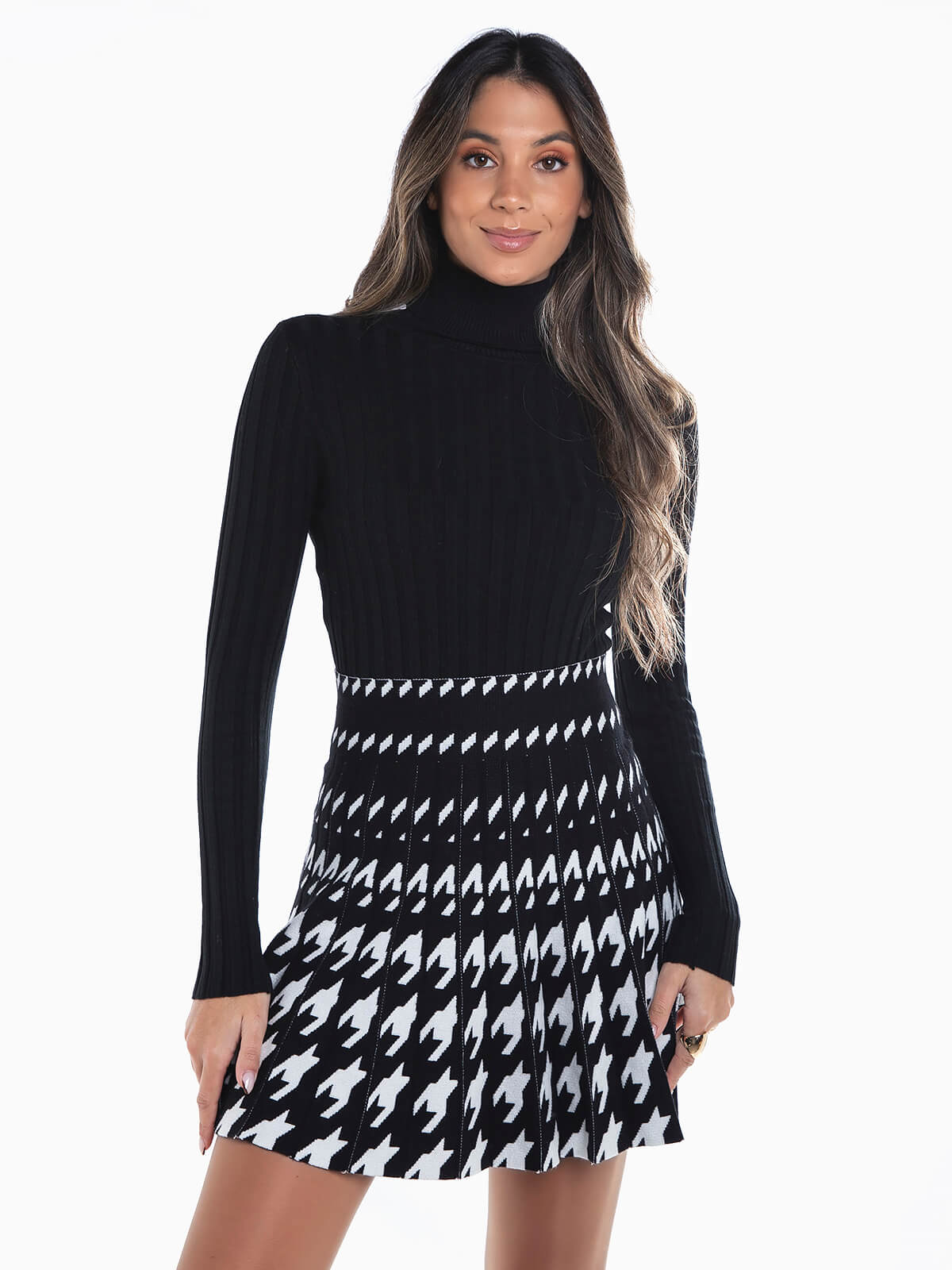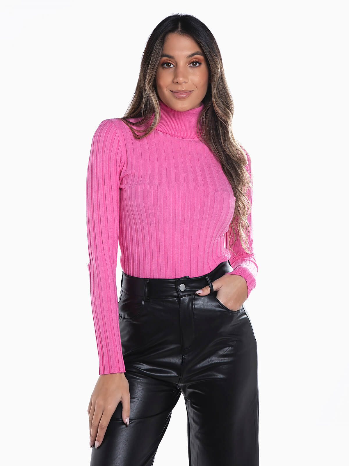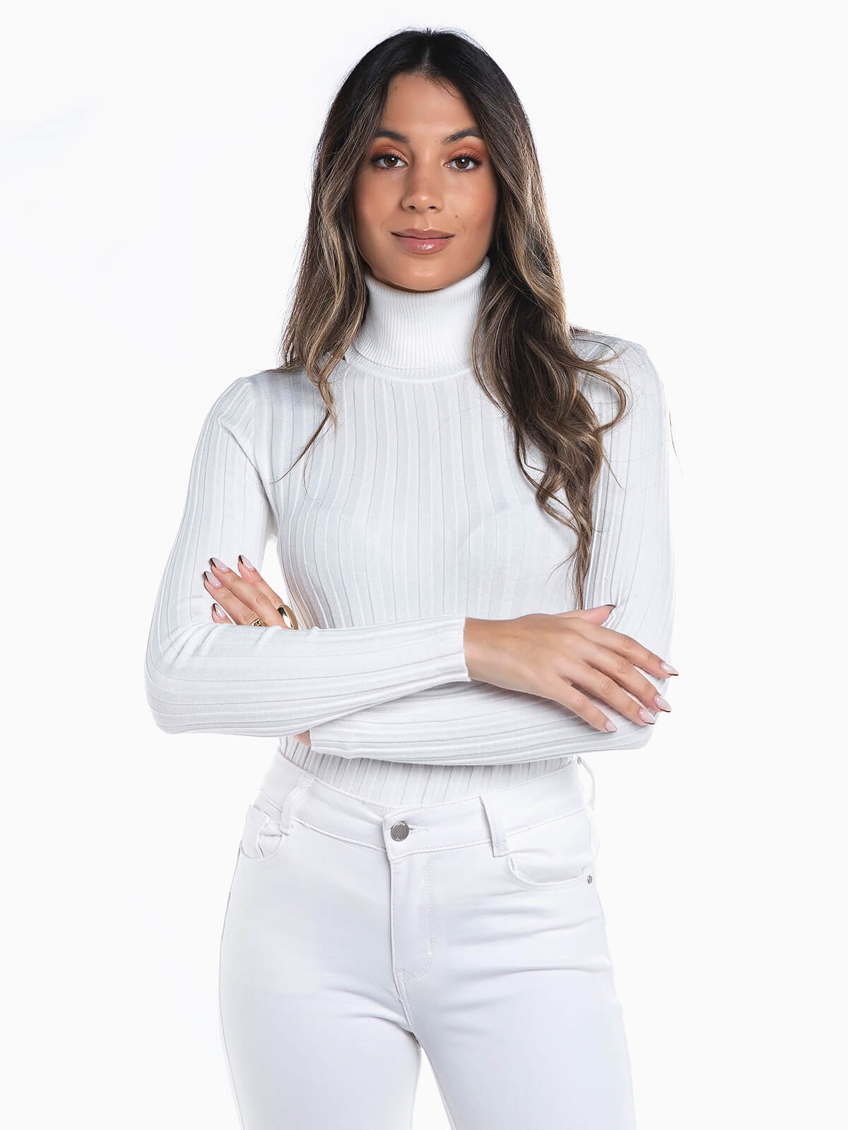 Camisola malha canelada com gola alta dobrada para senhora. Camisola manga comprida em tecido com mistura de lã para maior conforto térmico.