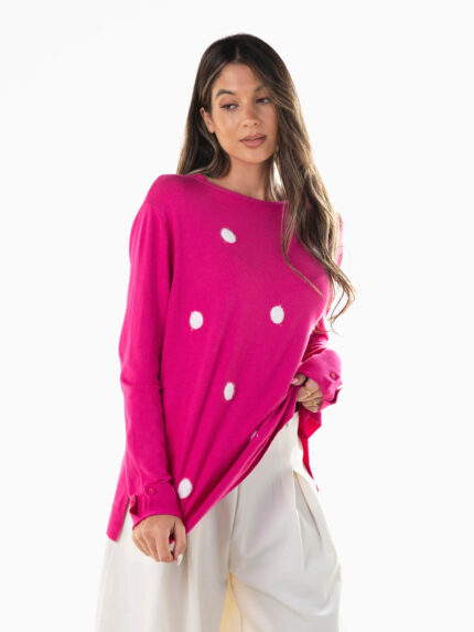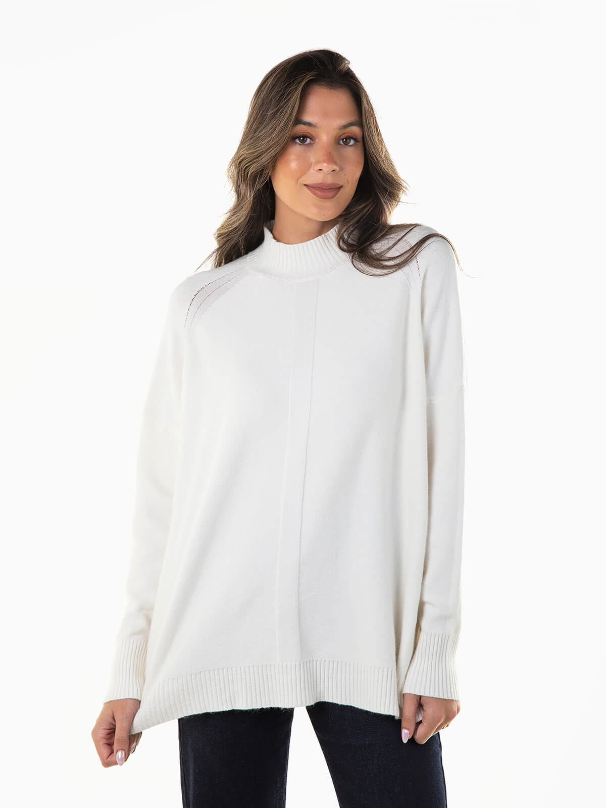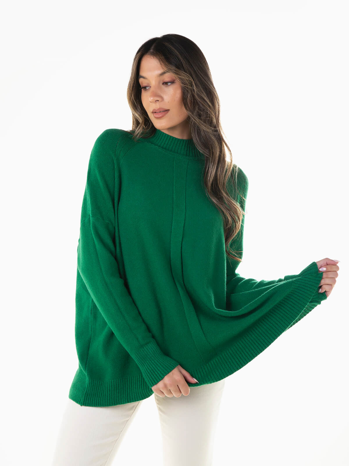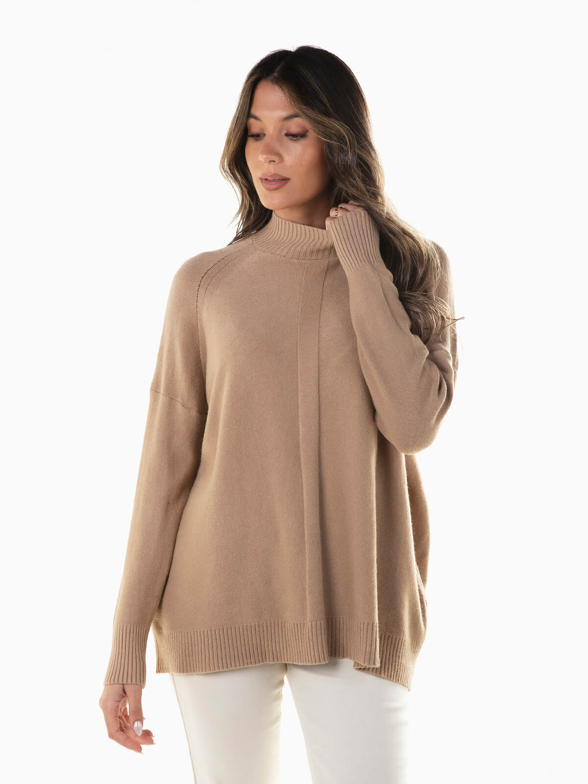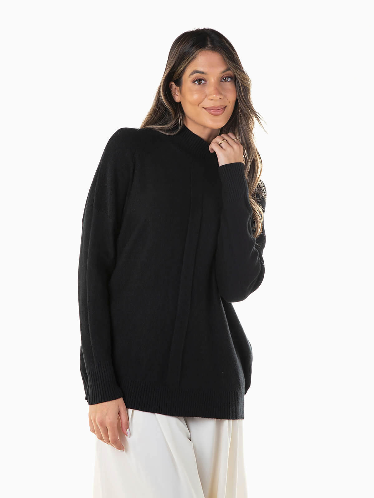 Camisola de malha com gola perkins para senhora. Camisola larga de manga comprida com acabamentos canelados. Ombros descaídos.