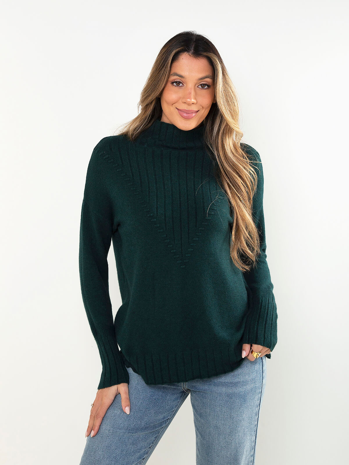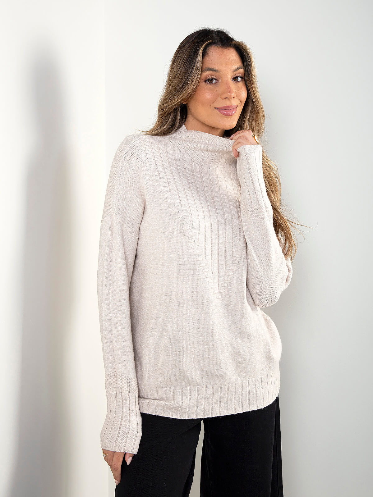 Camisola em malha fina, com gola perkins e detalhe canelado frontal. Um modelo simples e intemporal, ideal para looks mais cuidados ou combinações descontraídas com ganga.