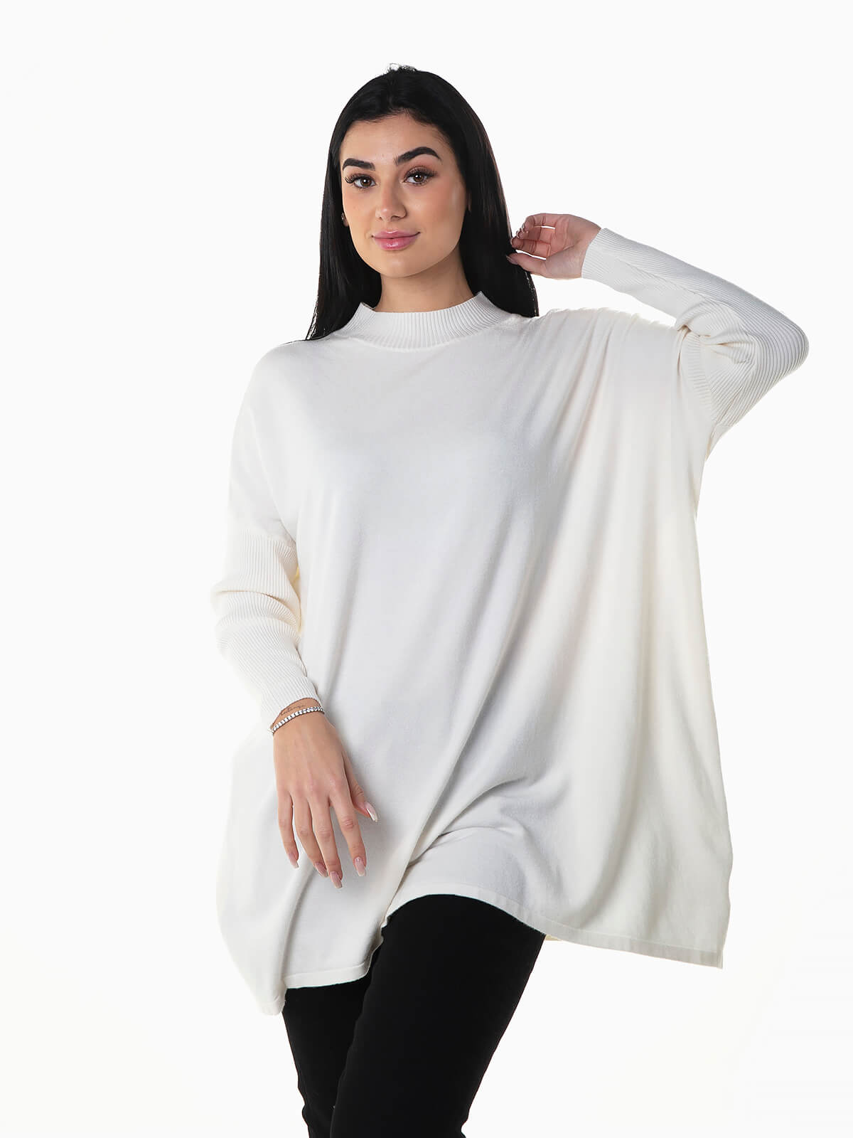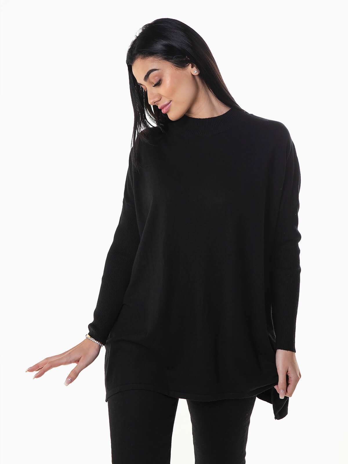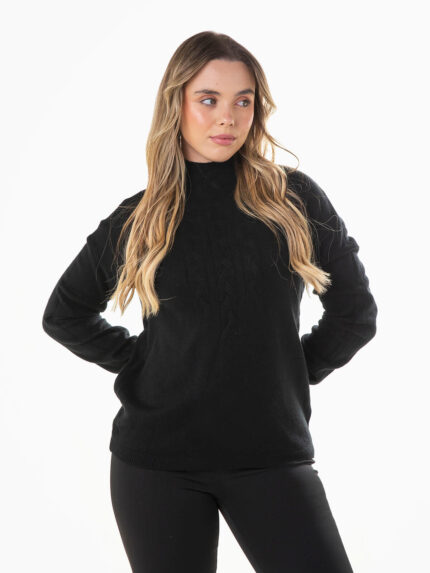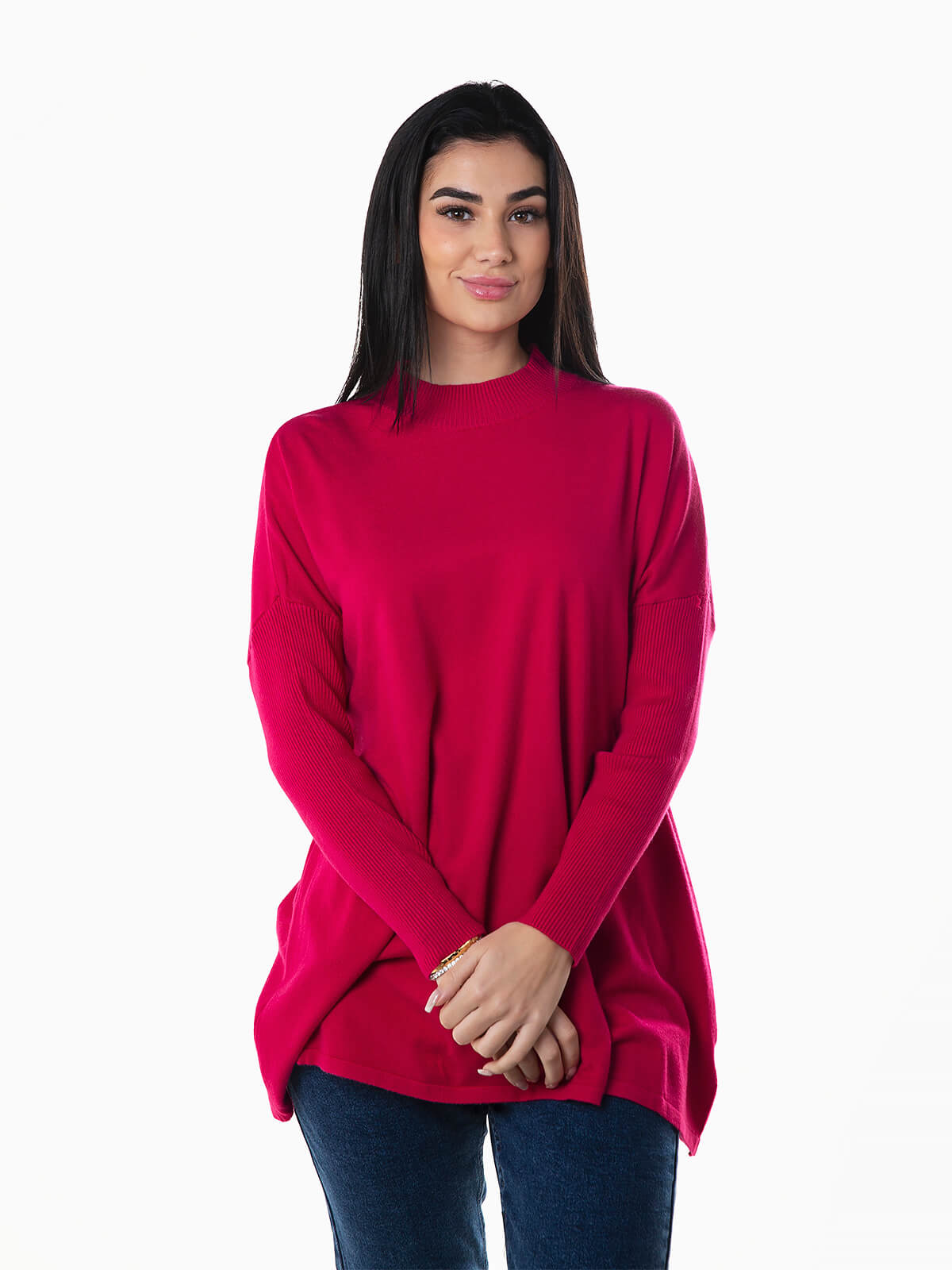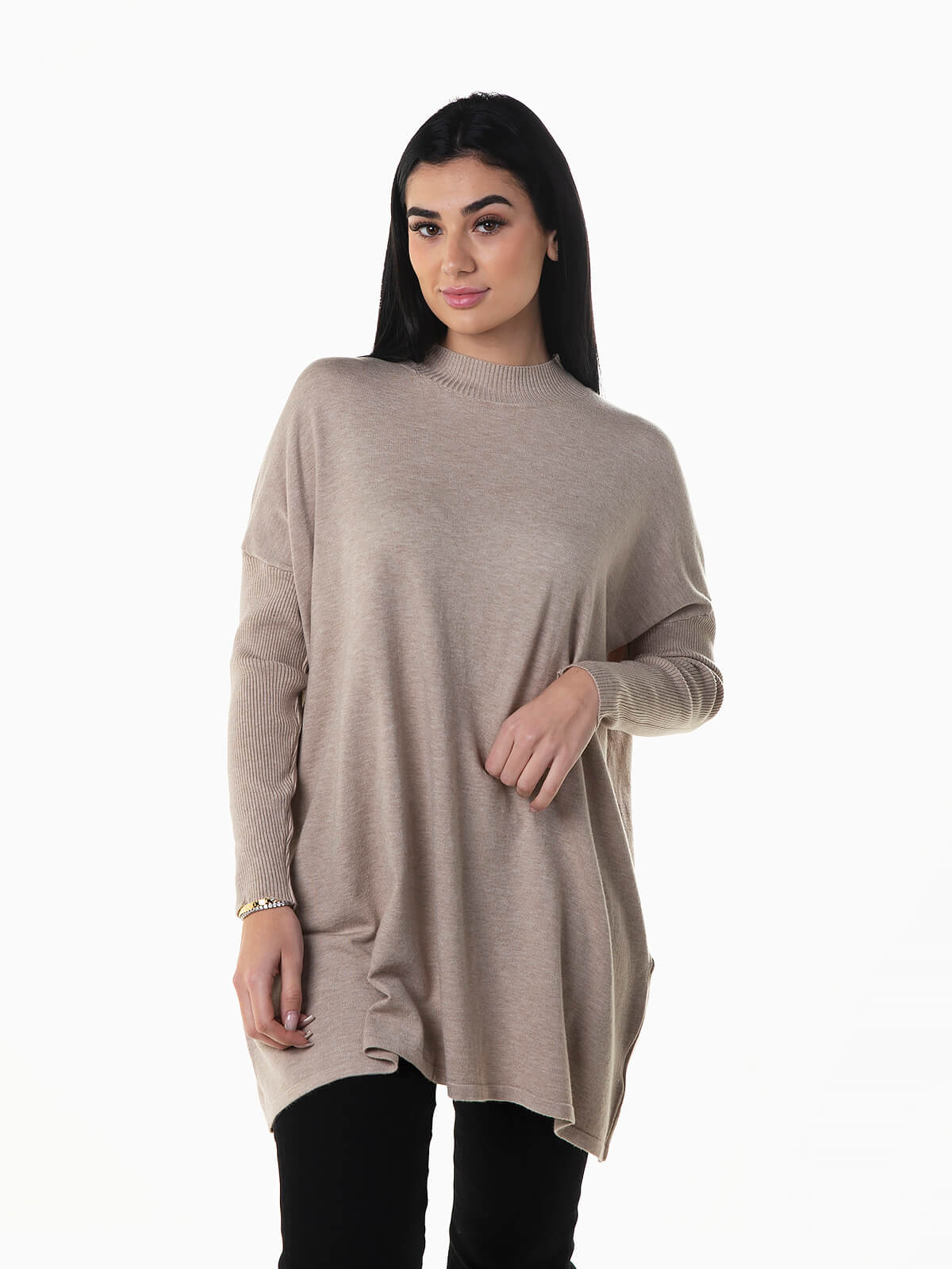 Camisola larga de malha com gola perkins. Camisola para senhora com manga comprida justa. Acabamentos canelados.
