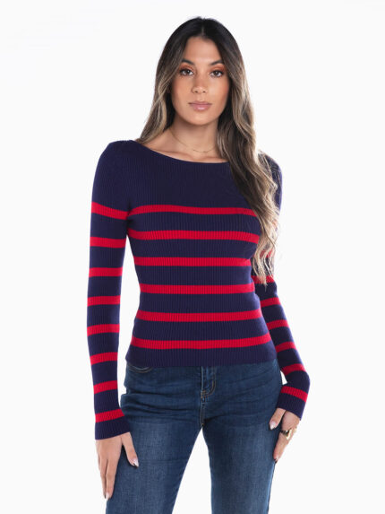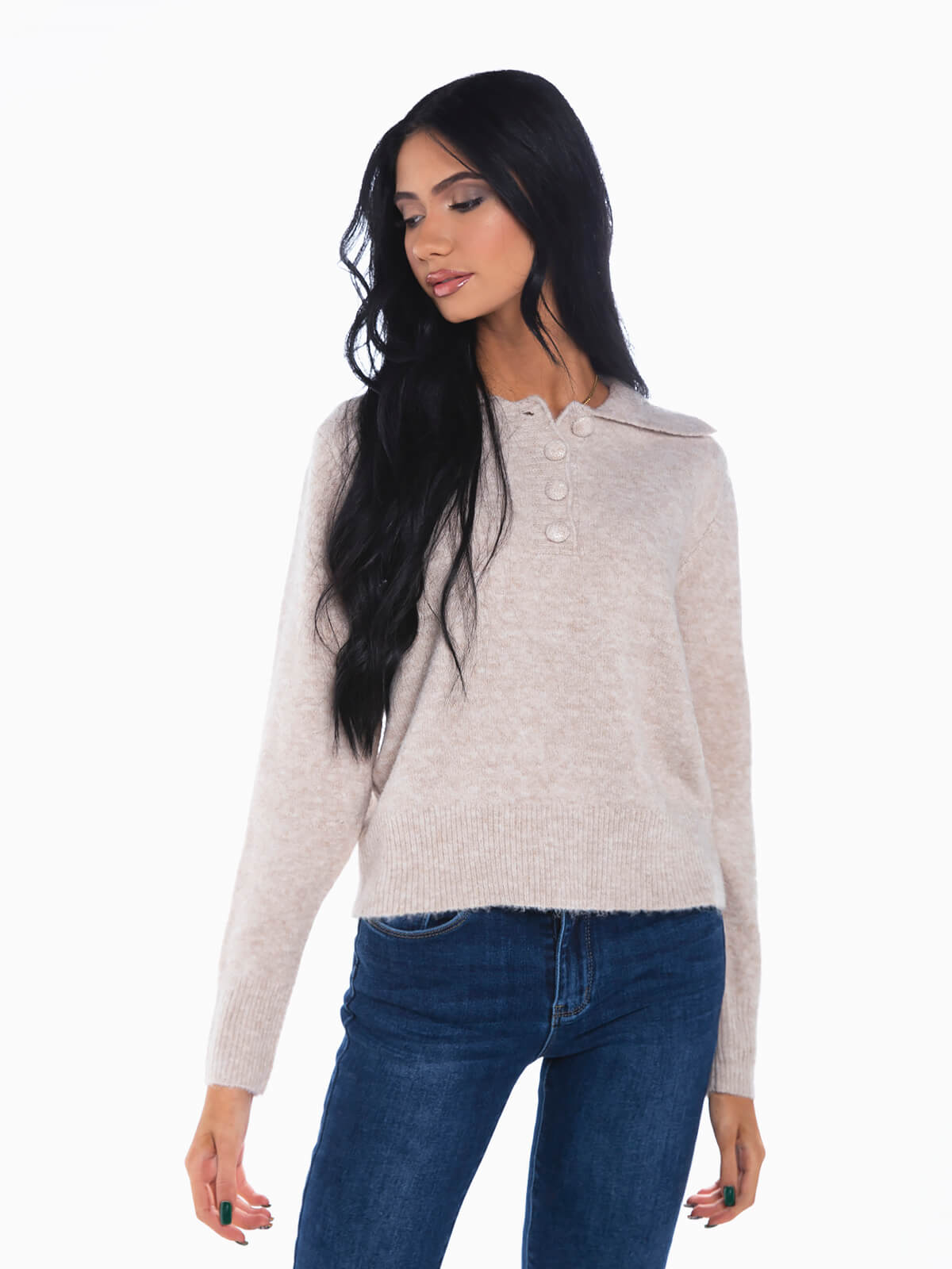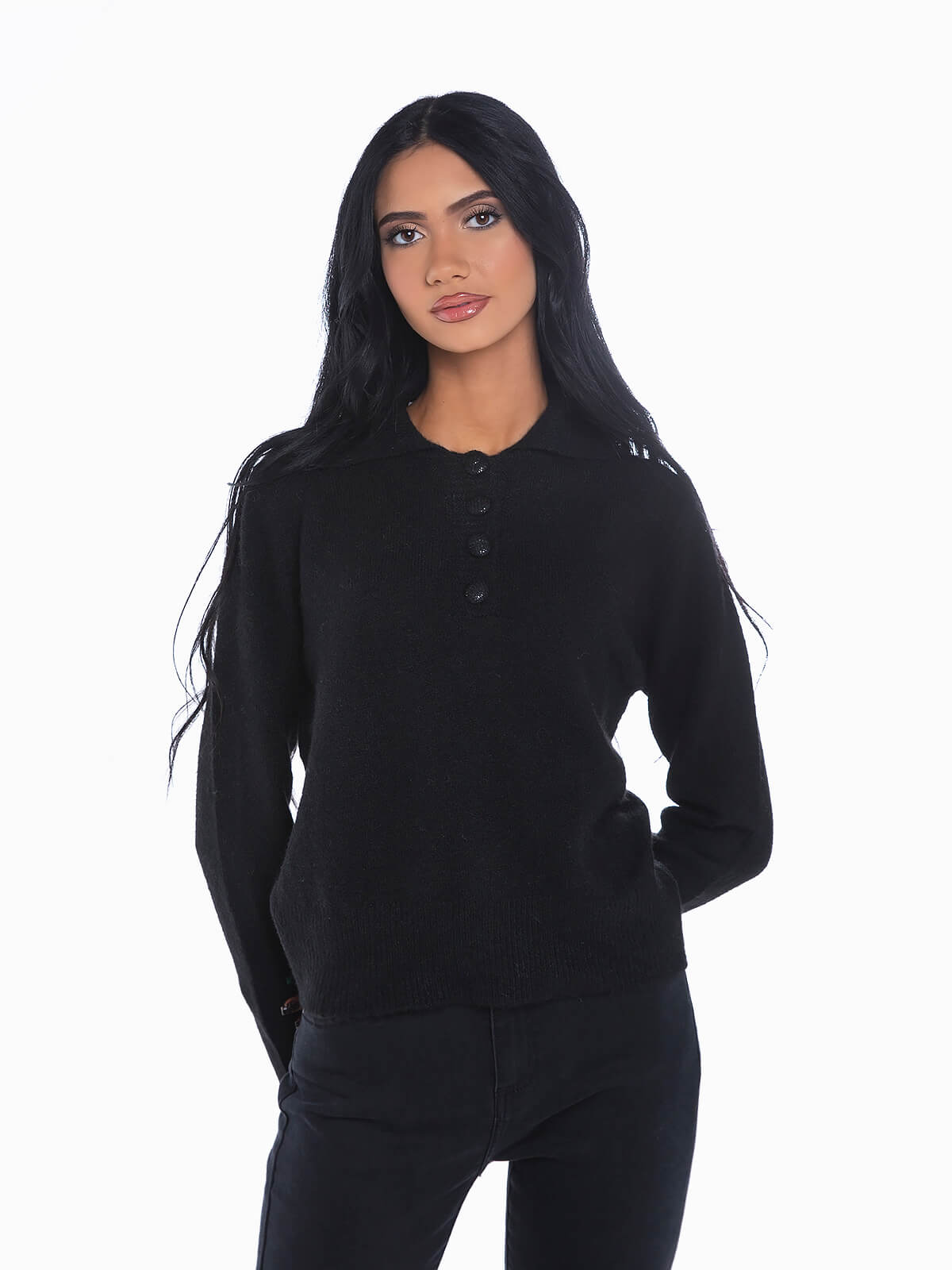 Camisola de malha com gola polo para senhora. Camisola de manga comprida com acabamentos canelados. Carcela com 4 botões.