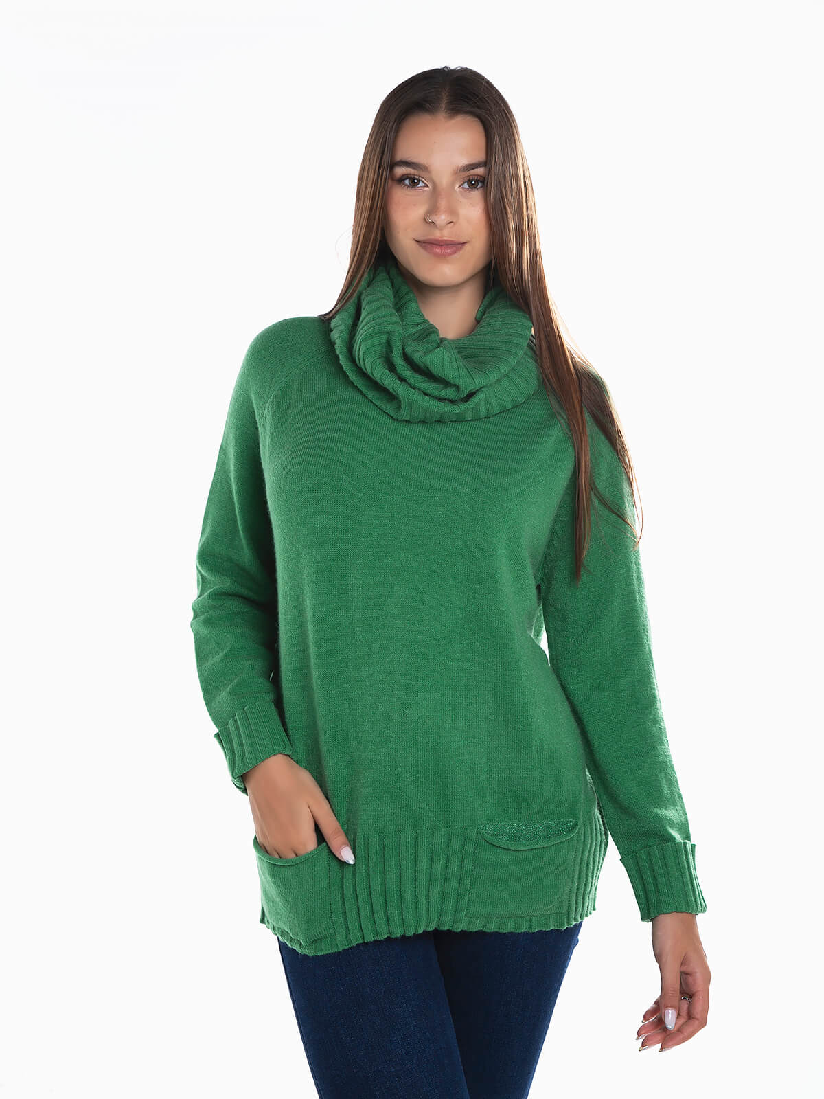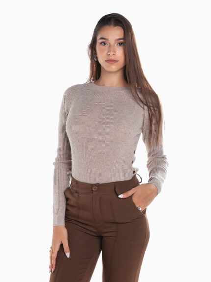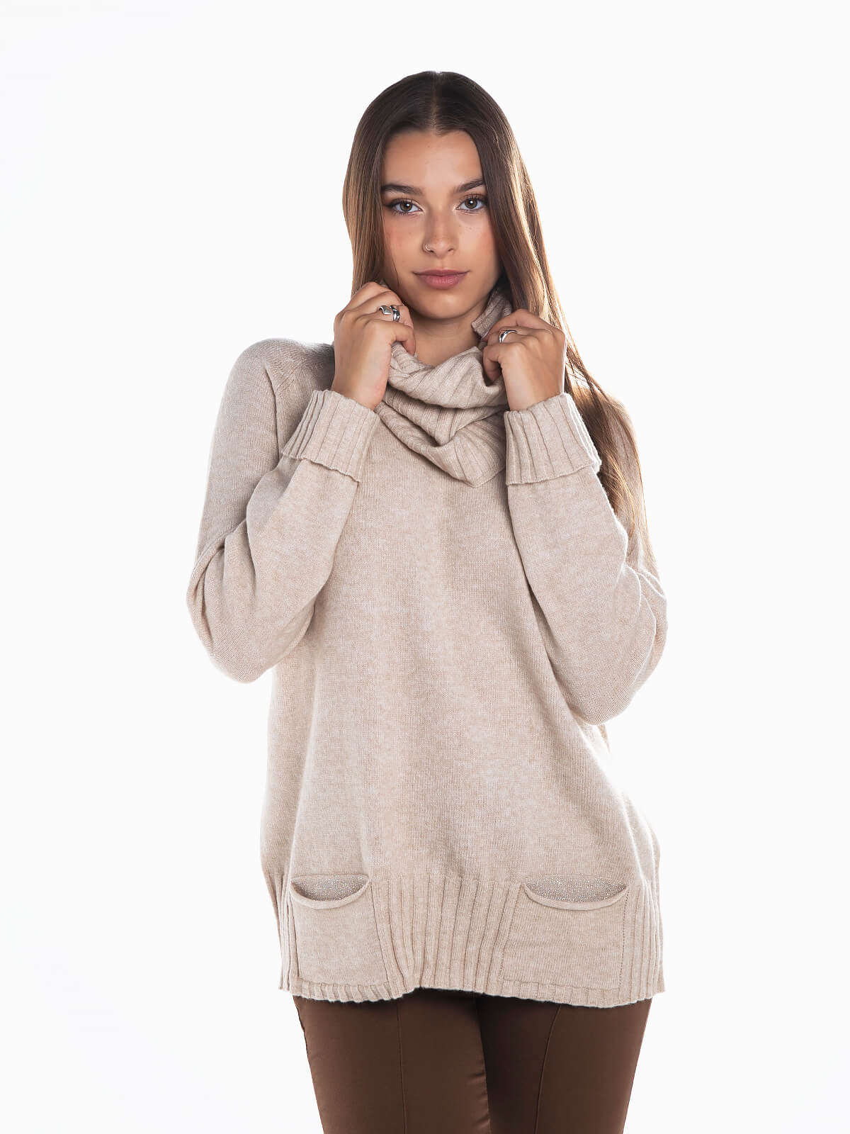 Camisola de malha com gola canelada removível. Camisola de manga comprida em tecido mistura lã com 2 bolsos. Acabamentos canelados.