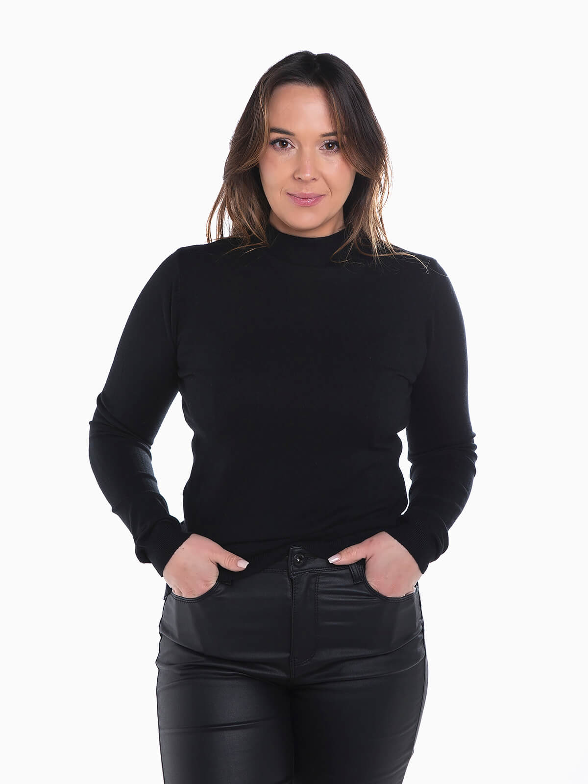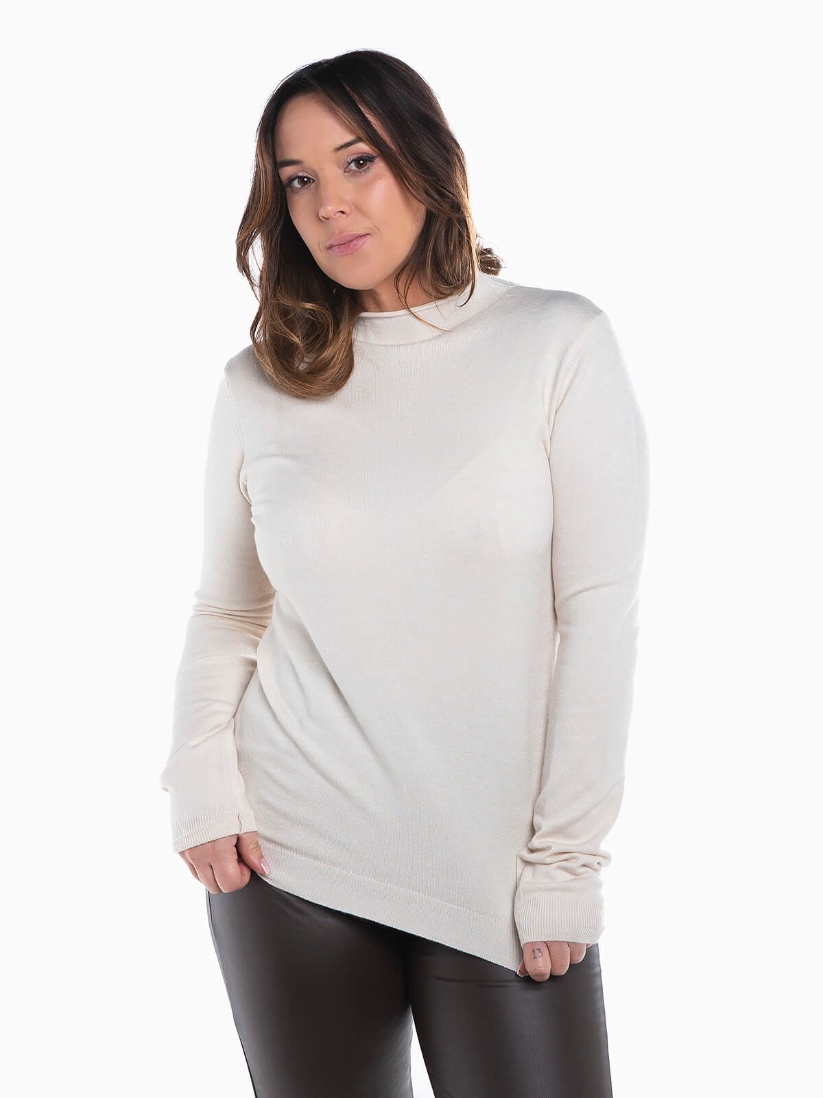 Camisola malha com gola perkins acabado em rolinho. Camisola manga comprida com extremidades caneladas.