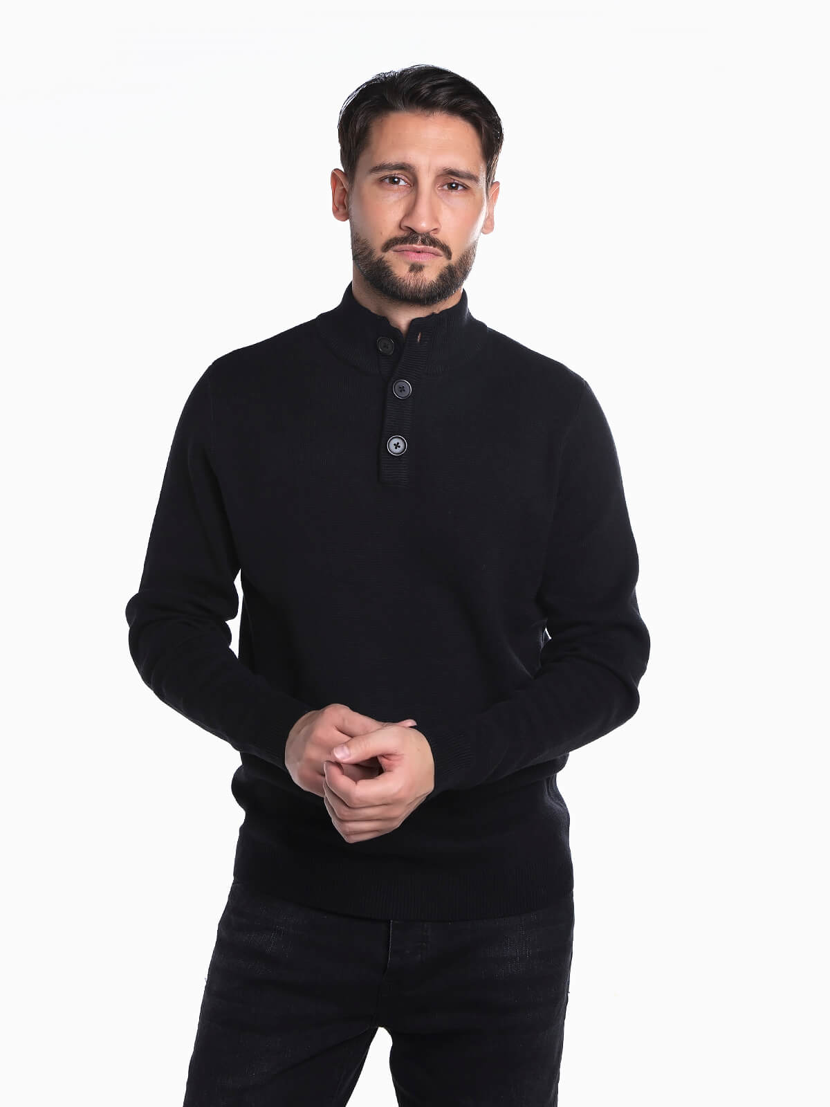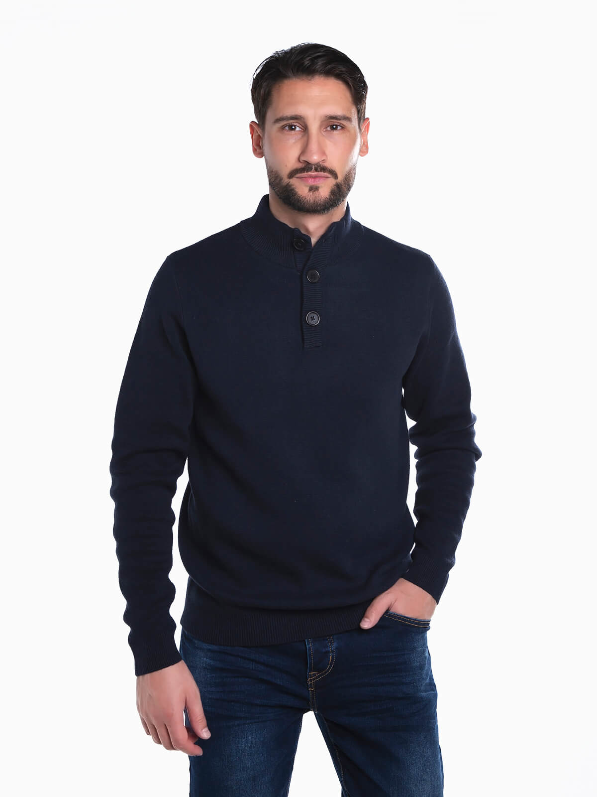 Camisola malha com gola subida e aperto de botões. Camisola manga comprida para homem com acabamentos canelados.