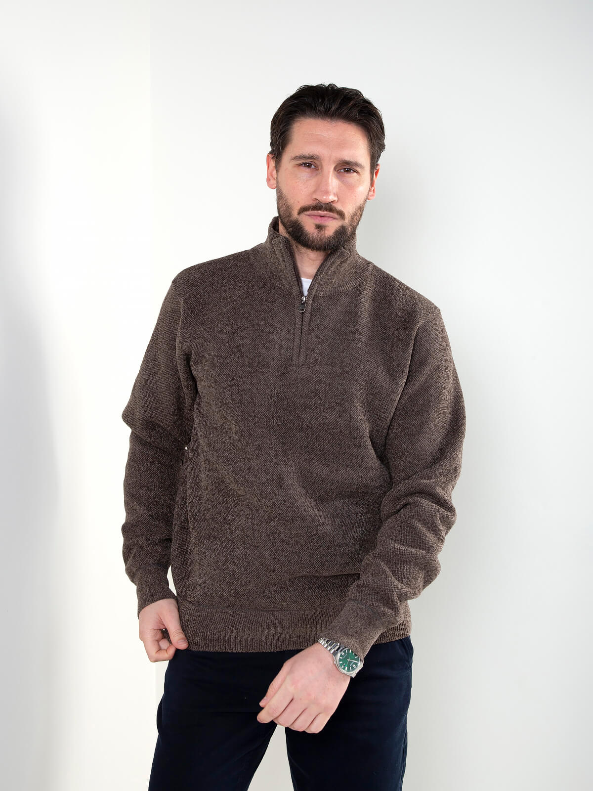 Camisola de malha mesclada para homem com meia gola e fecho frontal. Modelo confortável e versátil, ideal para o dia a dia e para as transições de estação. Interior com forro aos quadrados que acrescenta conforto térmico. Acabamentos canelados nos punhos e na base. Uma opção prática para looks casuais ou mais arranjados.