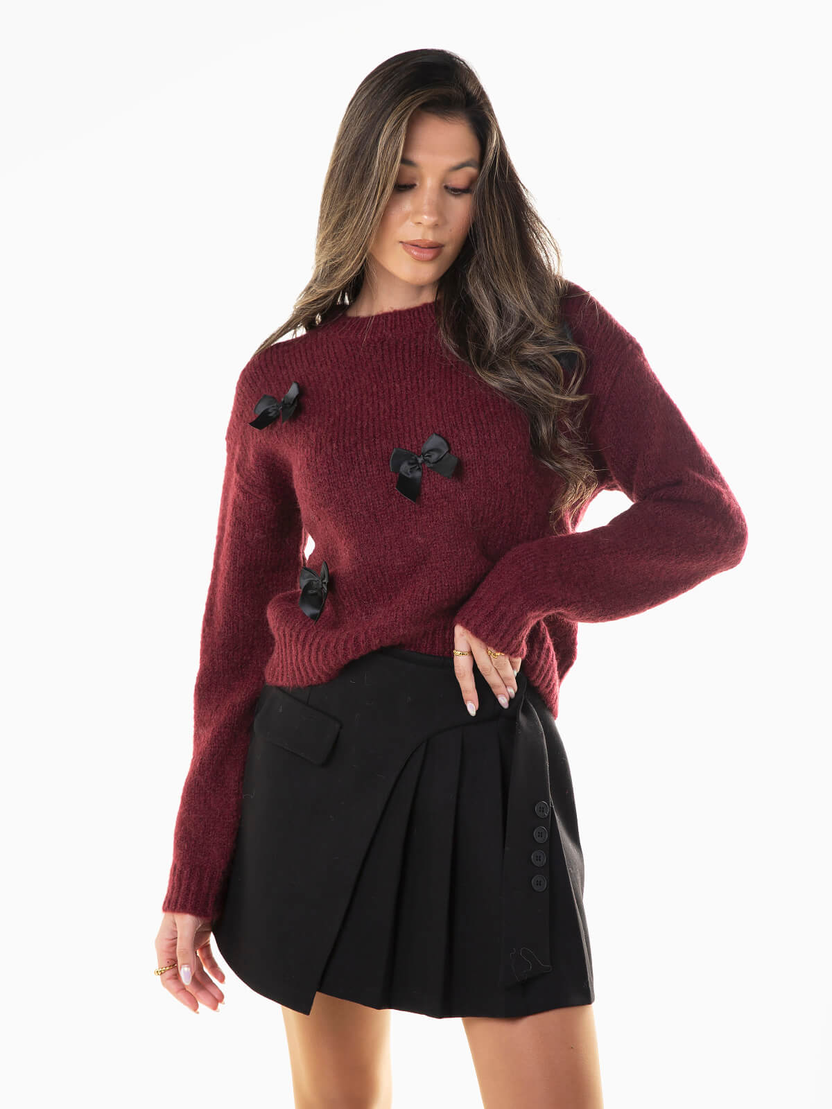 Camisola de malha suave com mistura de lã para maior conforto térmico. Camisola de manga comprida com laços acetinados aplicados e acabamentos canelados. Decote redondo.