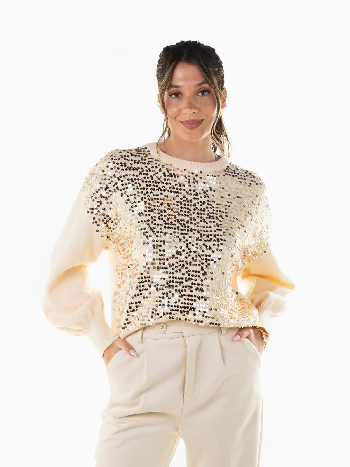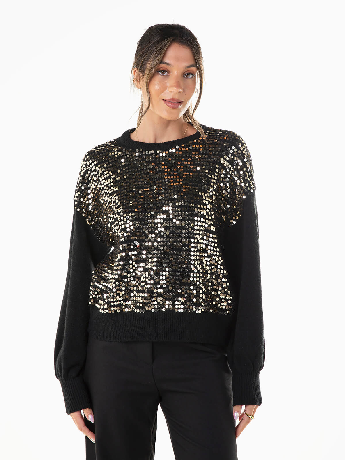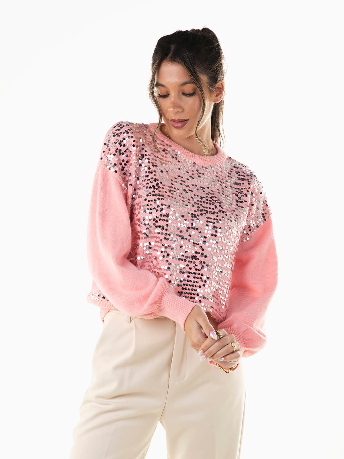 Camisola de malha com lantejoulas aplicadas à frente. Camisola de manga comprida com ombros descaídos e acabamentos canelados. Decote redondo.