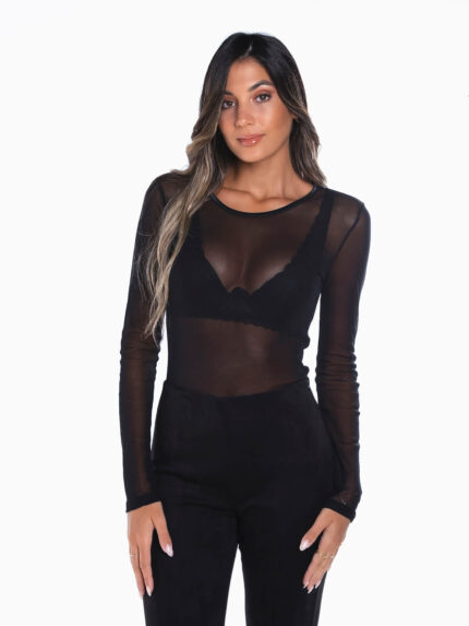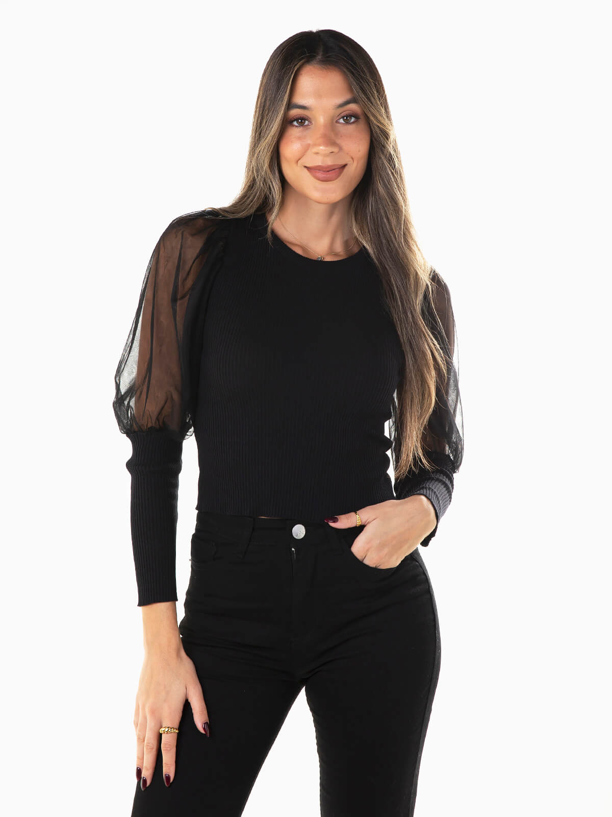Camisola de malha canelada com manga balão em tule. Camisola curta com decote redondo.