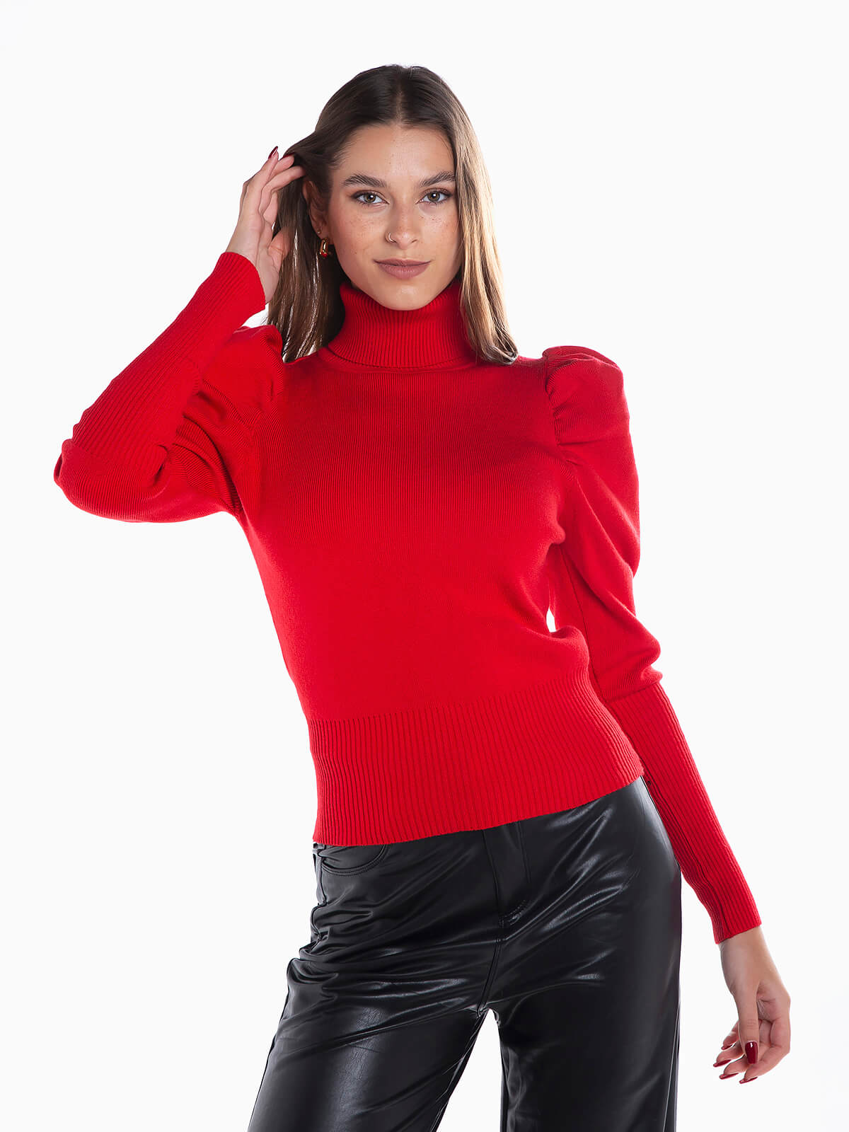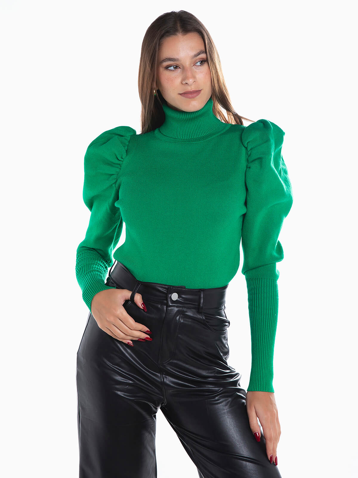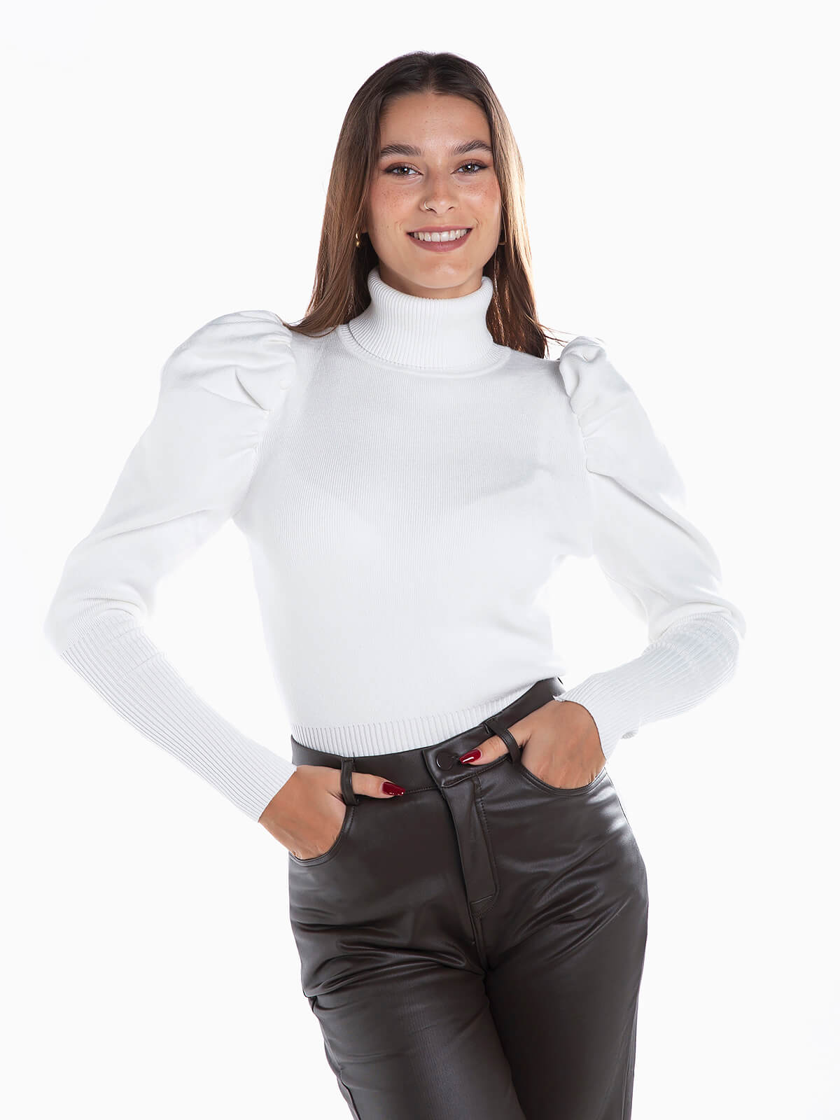 Camisola de malha com manga balão e punho justo. Camisola com gola alta dobrada. Acabamentos canelados.