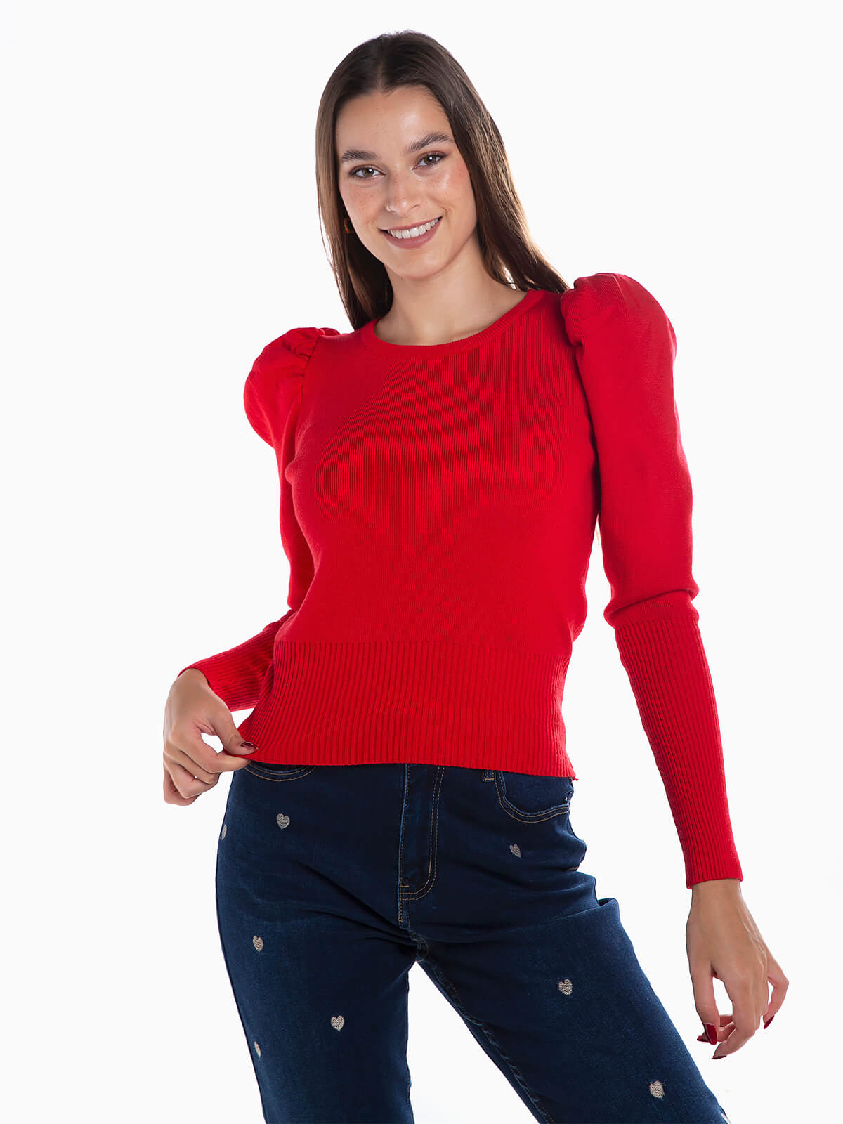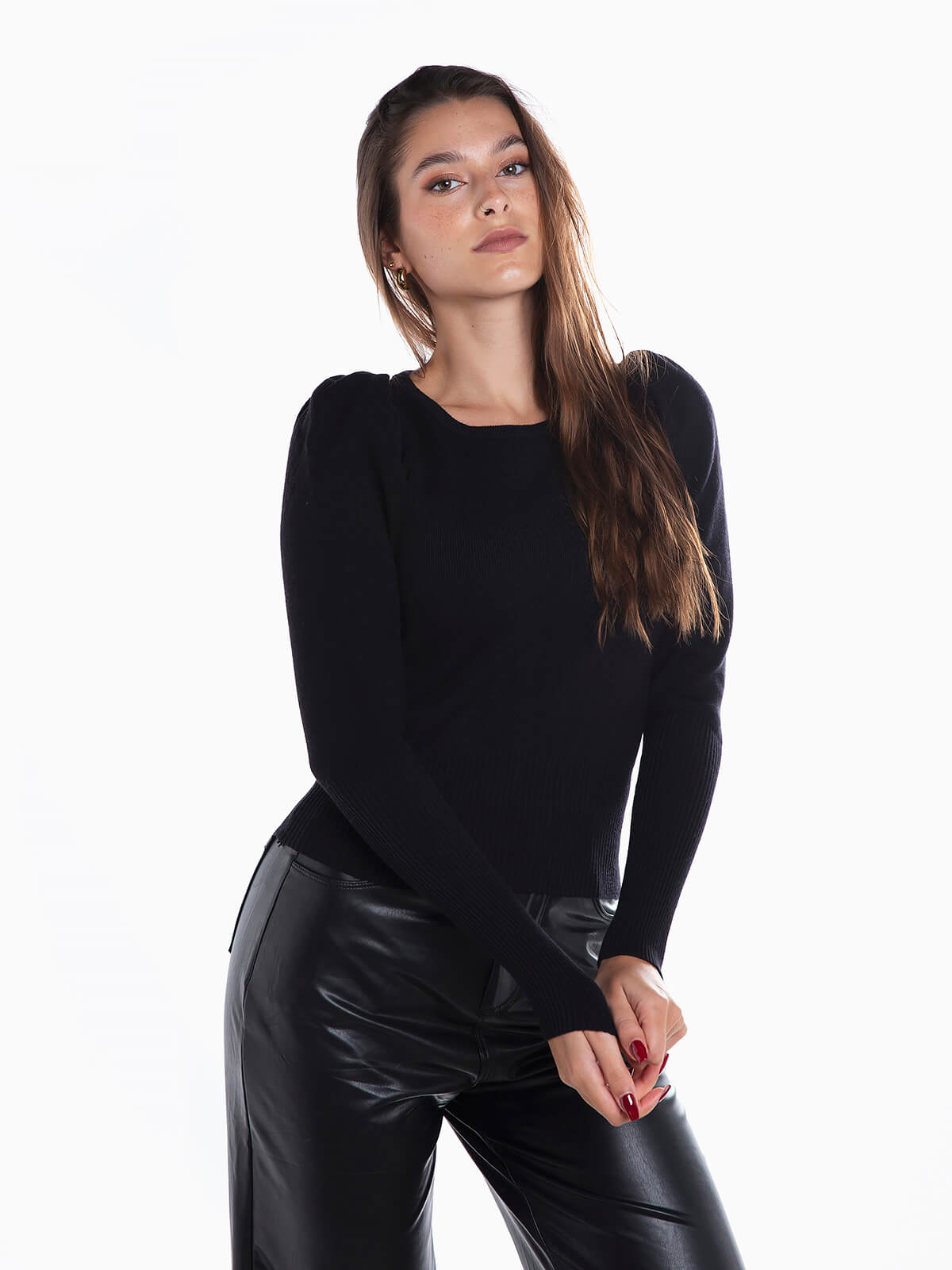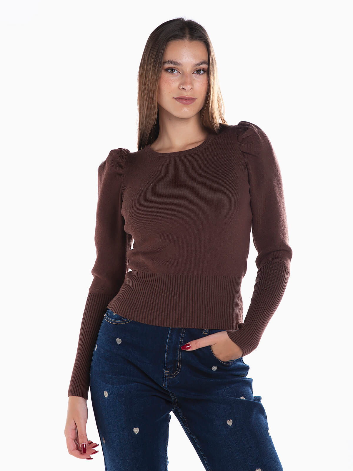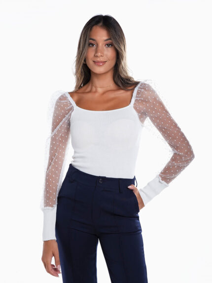 Camisola de malha com manga balão e punho justo. Camisola com decote redondo. Acabamentos canelados.