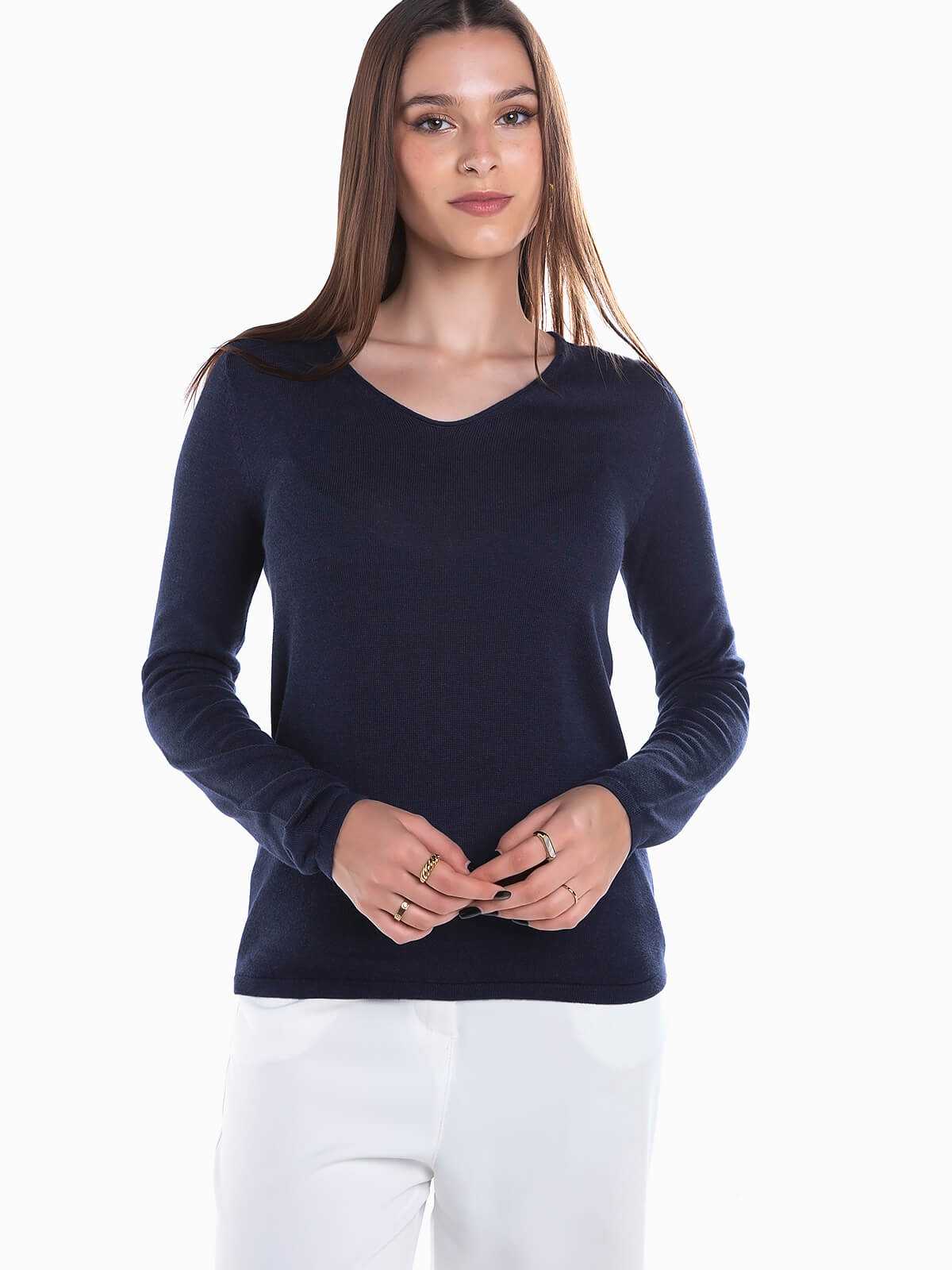 Camisola malha fina de manga comprida para senhora. Camisola com decote em bico.