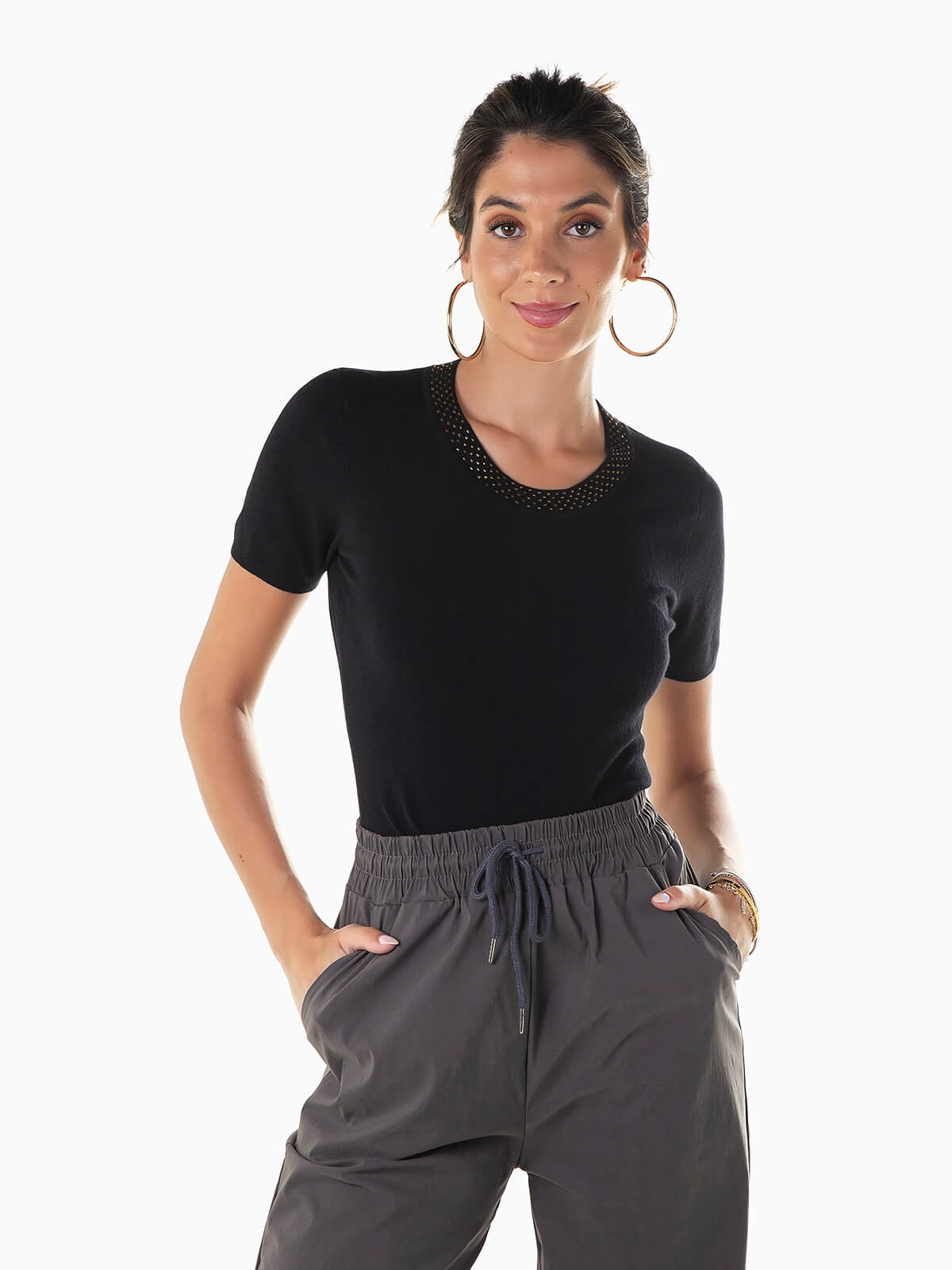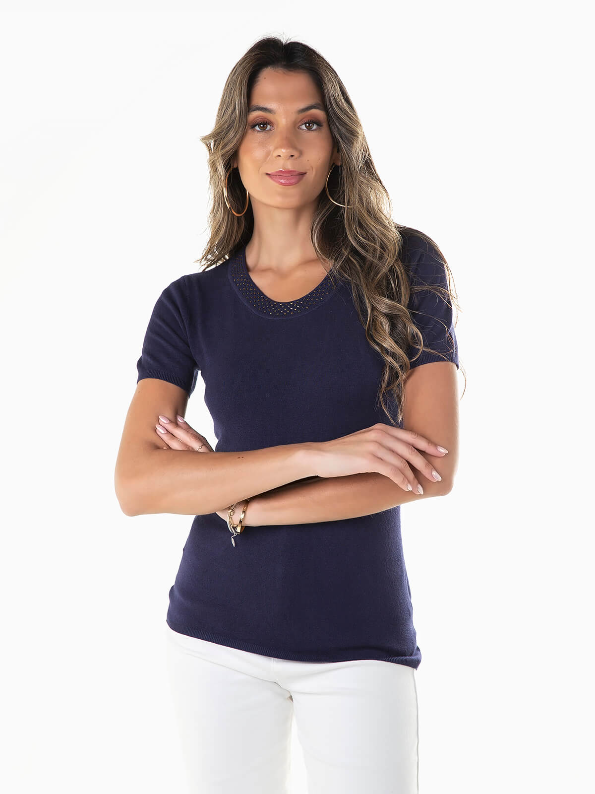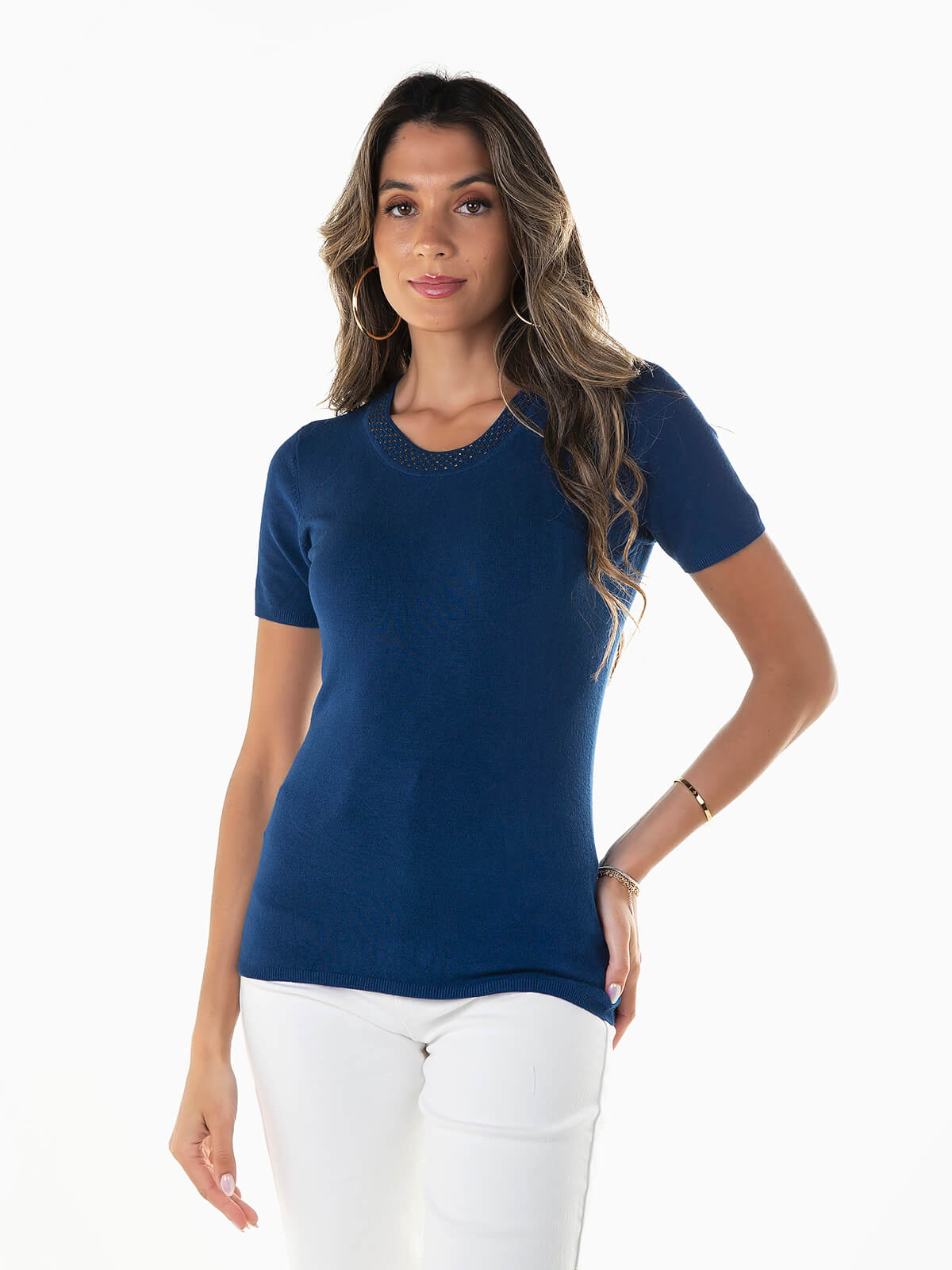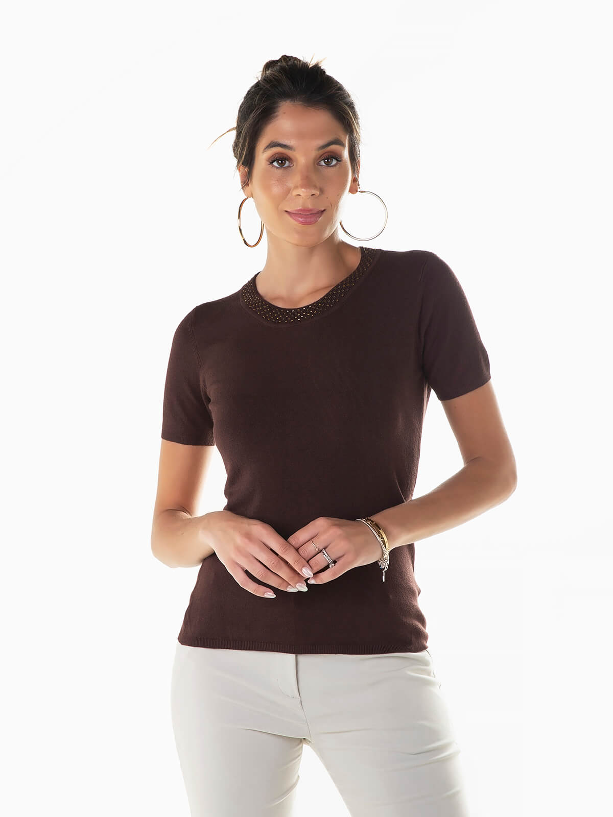 Camisola malha de manga curta com missangas aplicadas ao longo do decote. Camisola em tecido viscose com decote redondo.