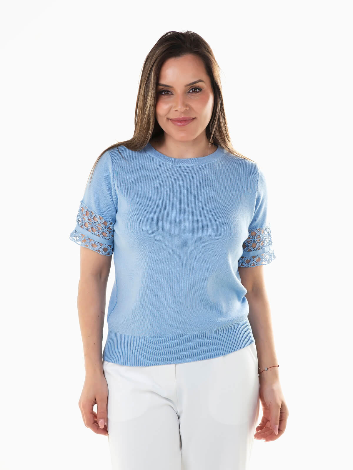 Camisola malha combinada com renda nas mangas. Camisola manga curta para mulher com decote redondo. Acabamentos canelados.