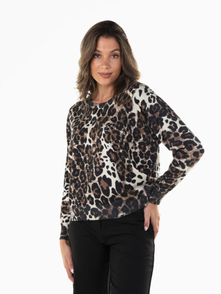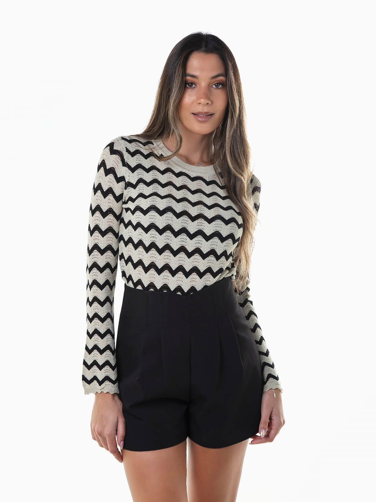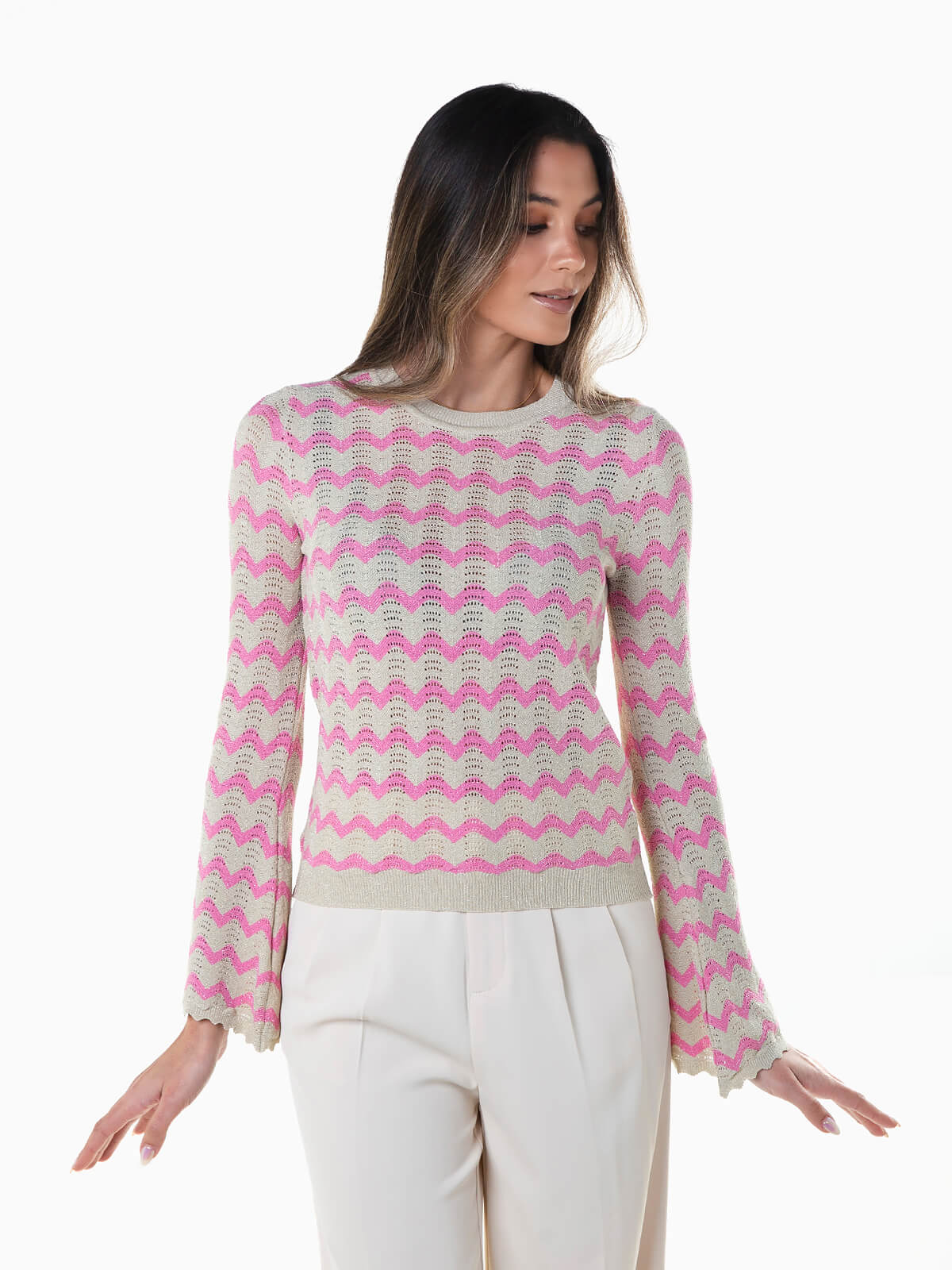 Camisola malha rendilhada de manga comprida evasé. Camisola com riscas em ziguezague e fios lurex para efeito brilhante. Decote redondo. Acabamentos em nervuras.