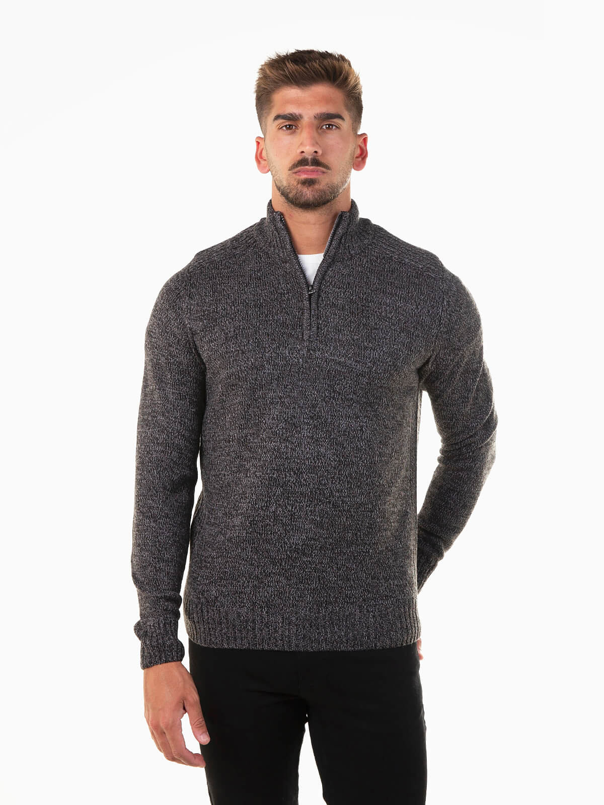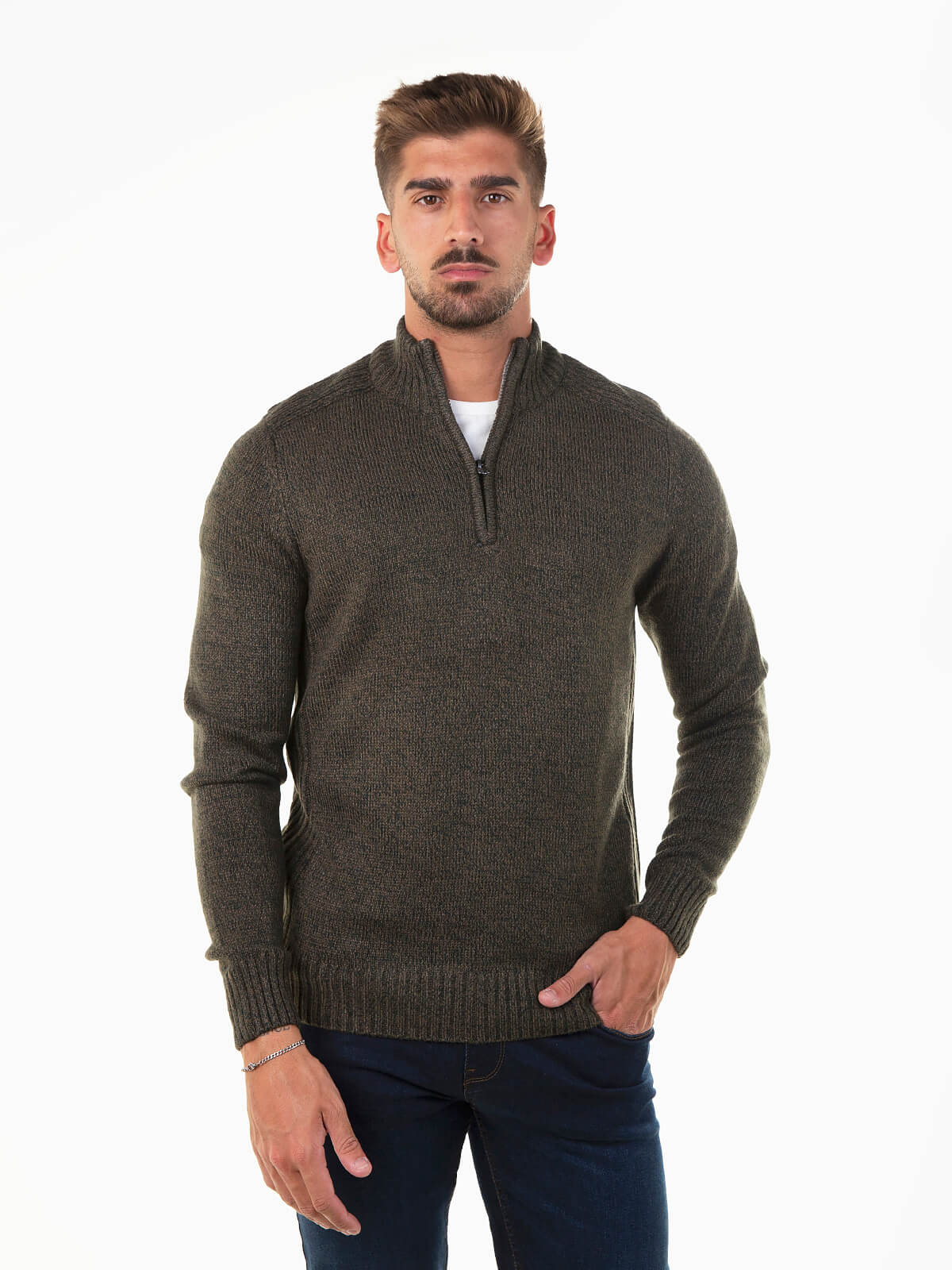 Camisola de malha mesclada para homem, com gola subida e fecho zíper. Detalhes canelados que adicionam um toque distinto. Uma peça confortável e versátil, ideal para usar nos dias frios com jeans ou calças de sarja. Disponível em várias cores.