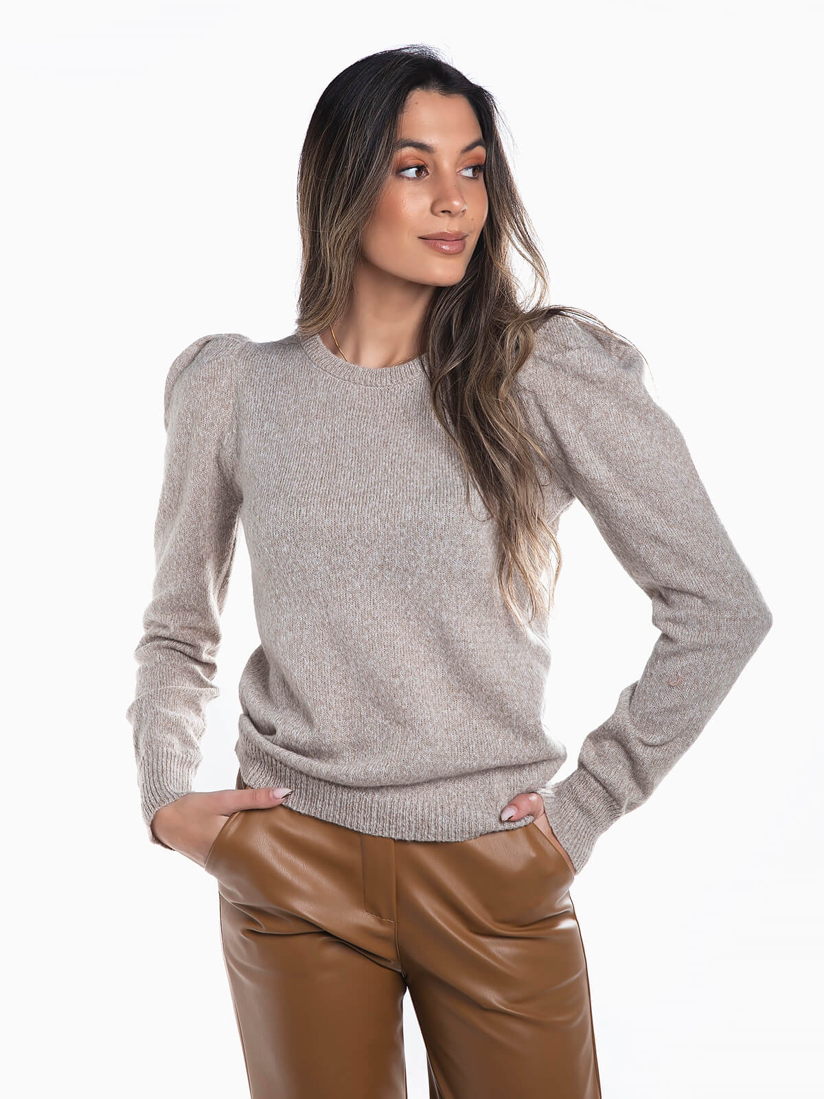 Camisola malha mesclada com manga abalonada para senhora. Camisola com mistura de lã para maior conforto. Decote redondo.