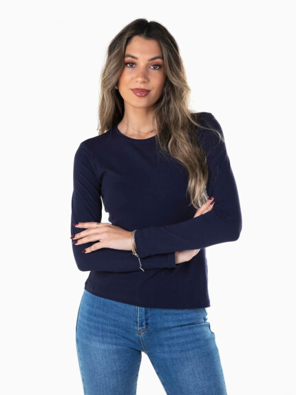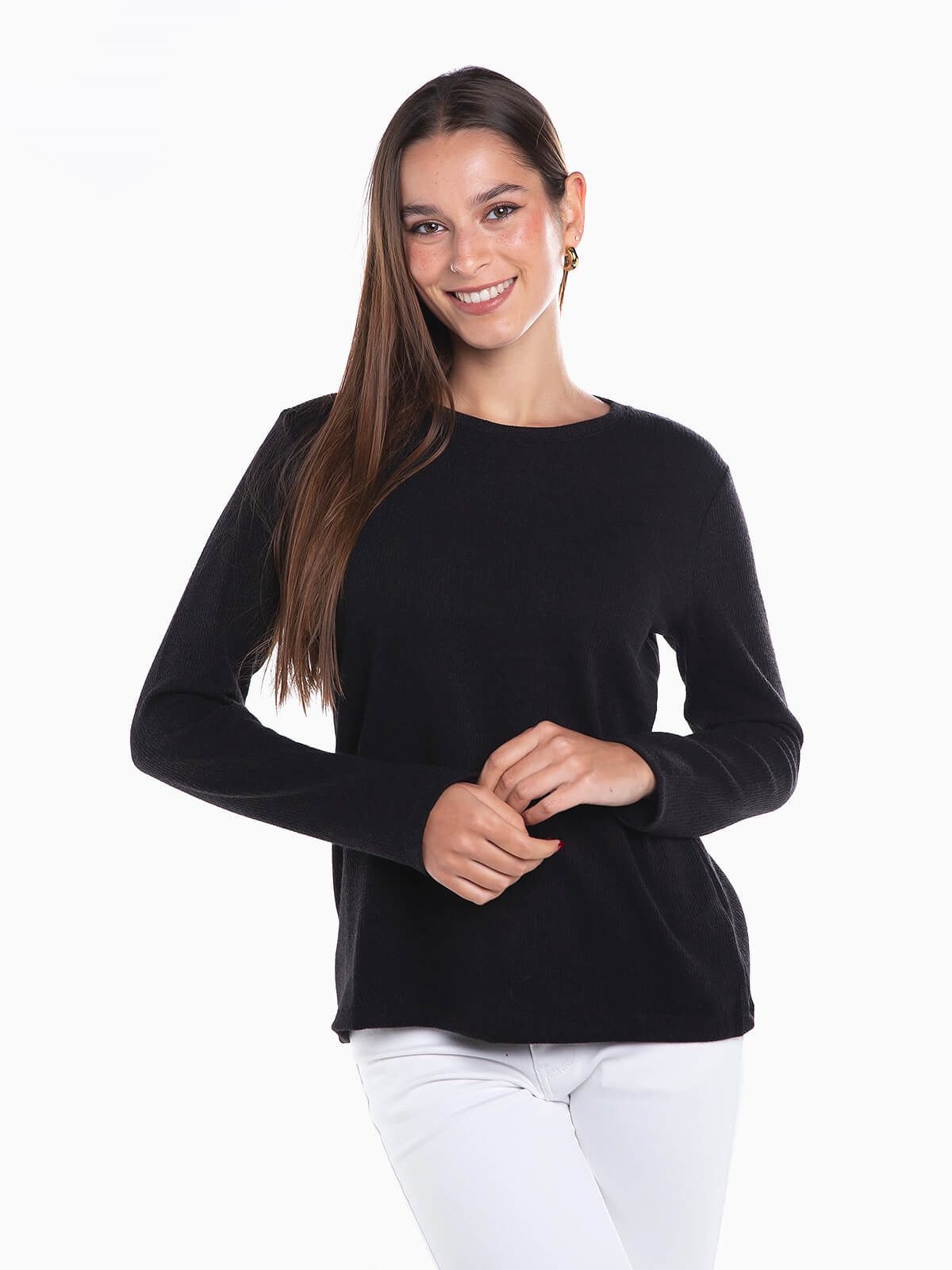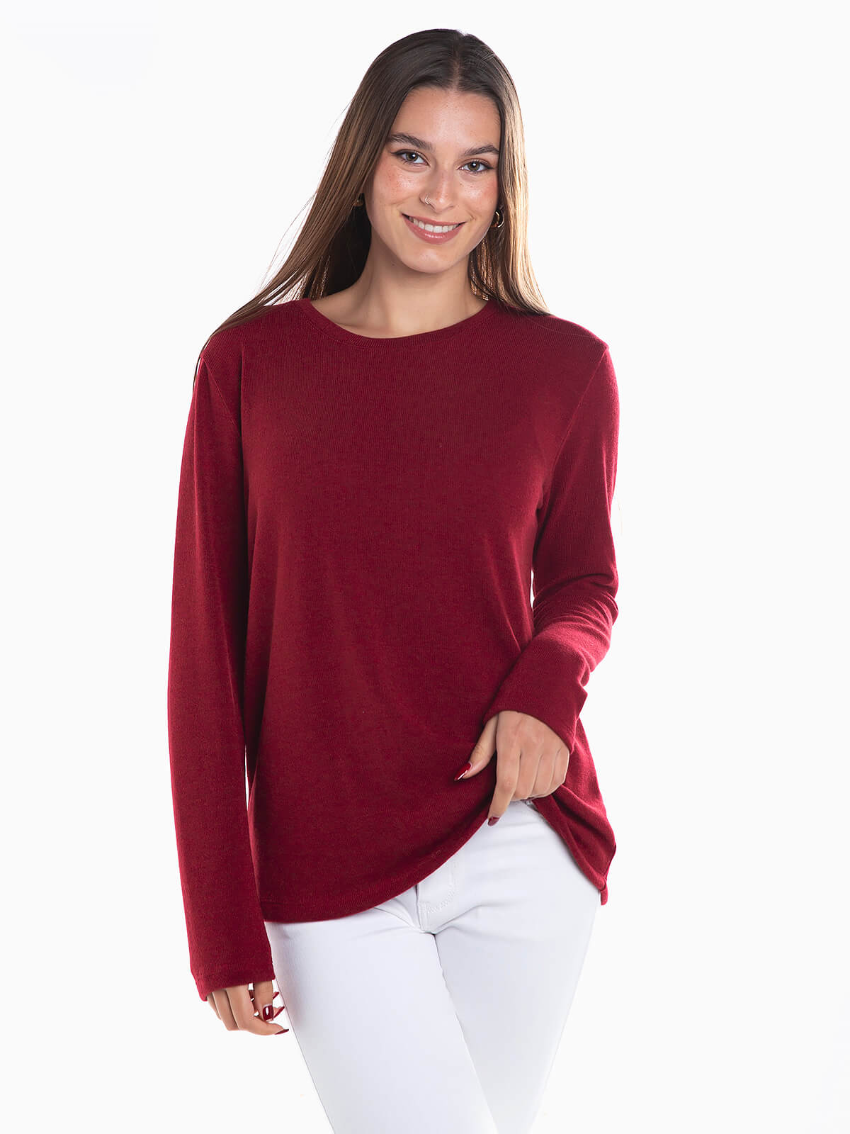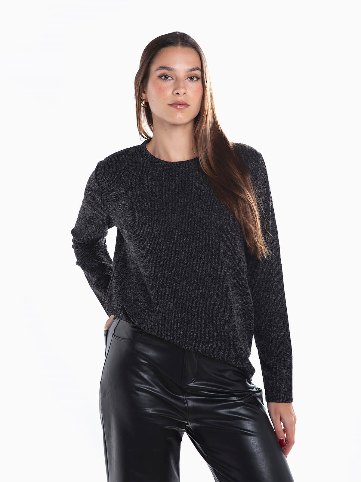 Camisola em malha mesclada com mistura de viscose. Camisola elástica de manga comprida com decote redondo.