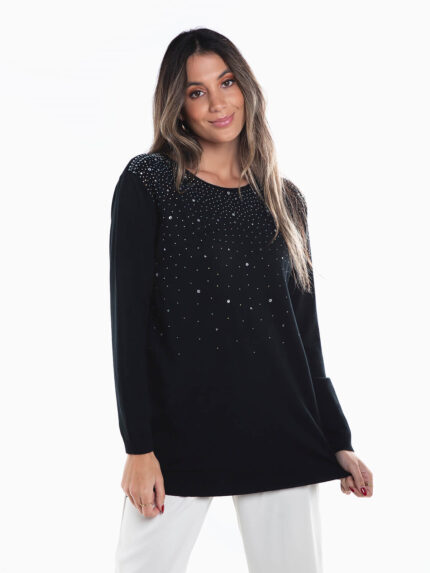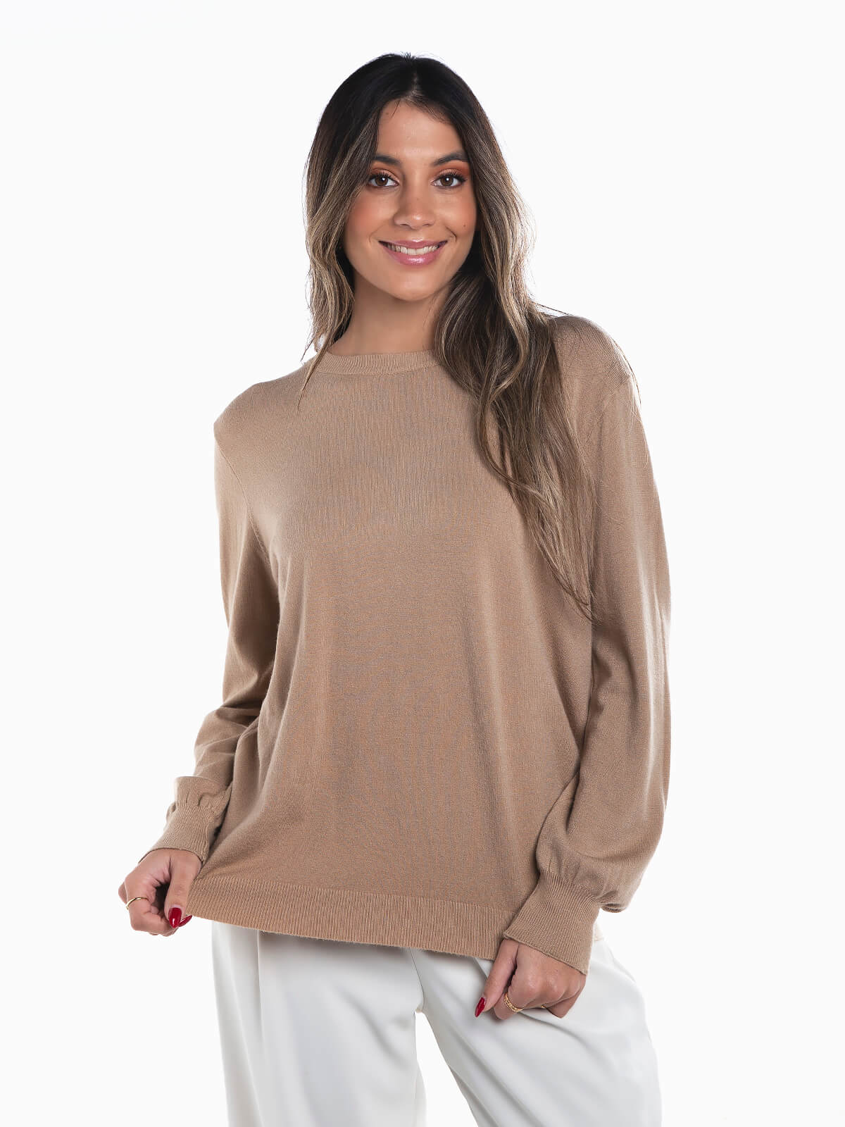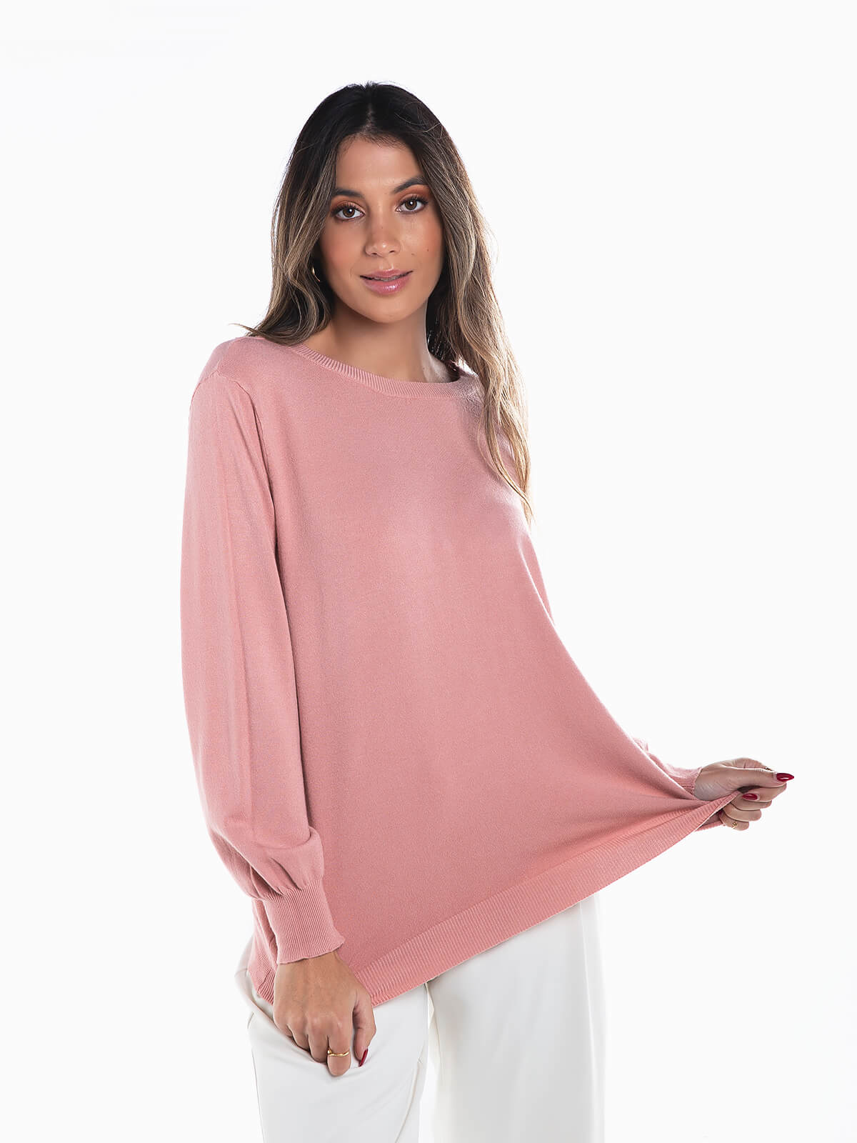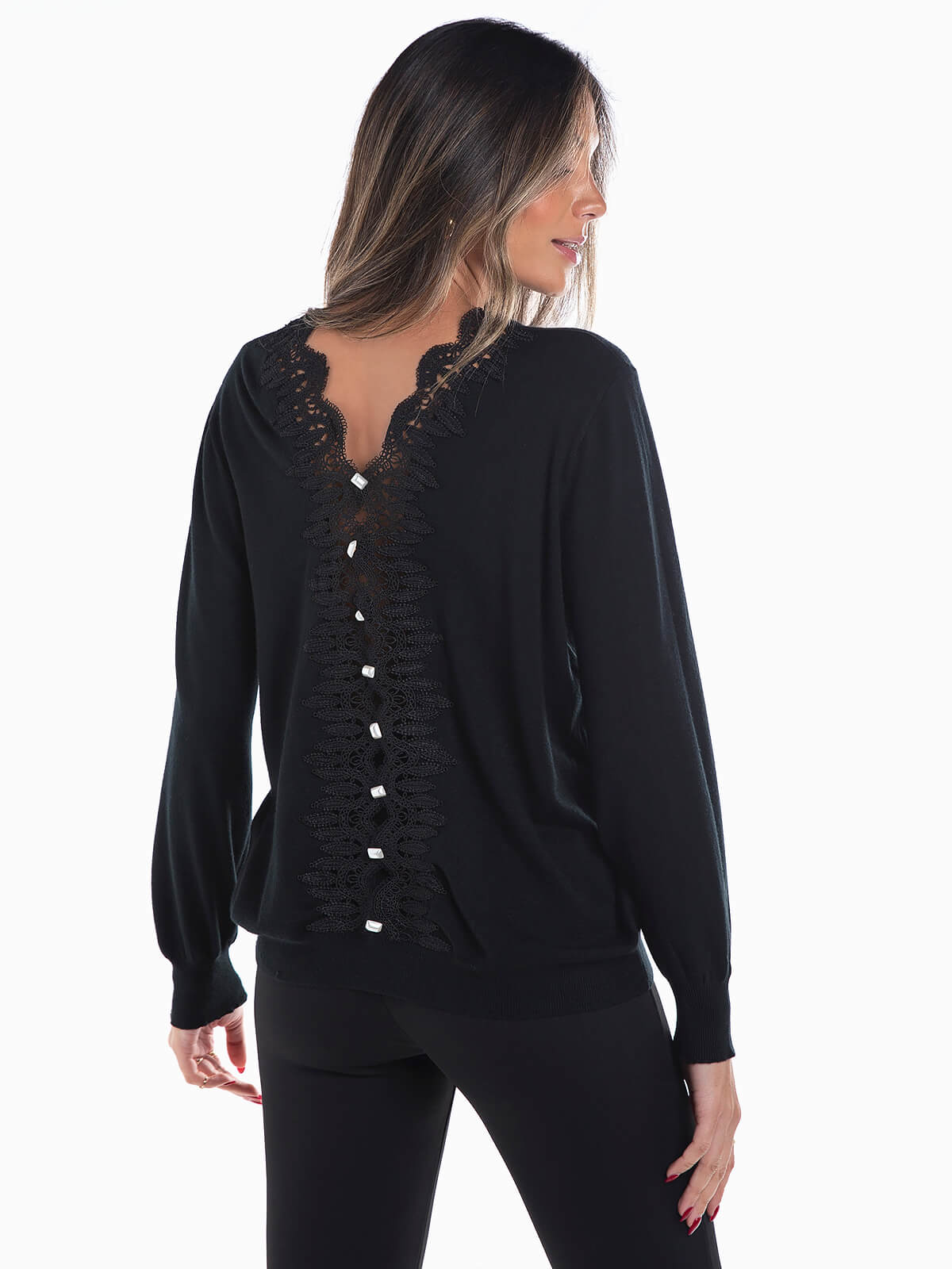 Camisola malha com mistura de viscose para senhora. Camisola combinada com renda e aplicações na parte posterior. Manga comprida abalonada. Decote redondo.