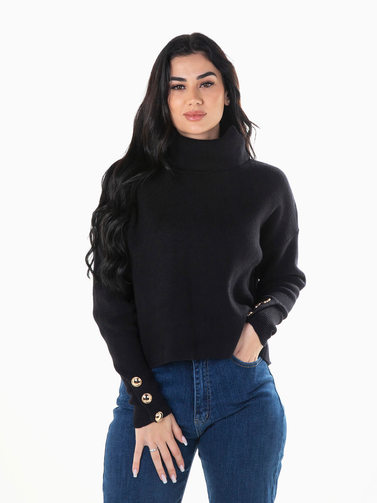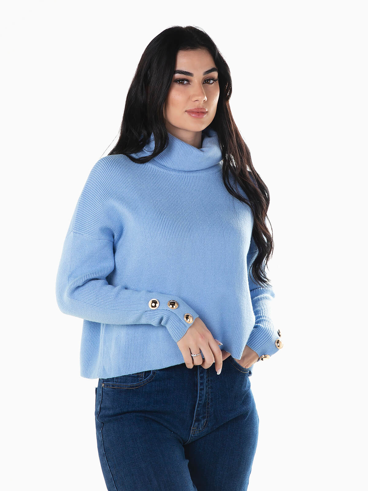 Camisola em malha com mistura viscose para maior conforto. Camisola oversize com gola alta dobrada e botões pérolas aplicados. Manga comprida.