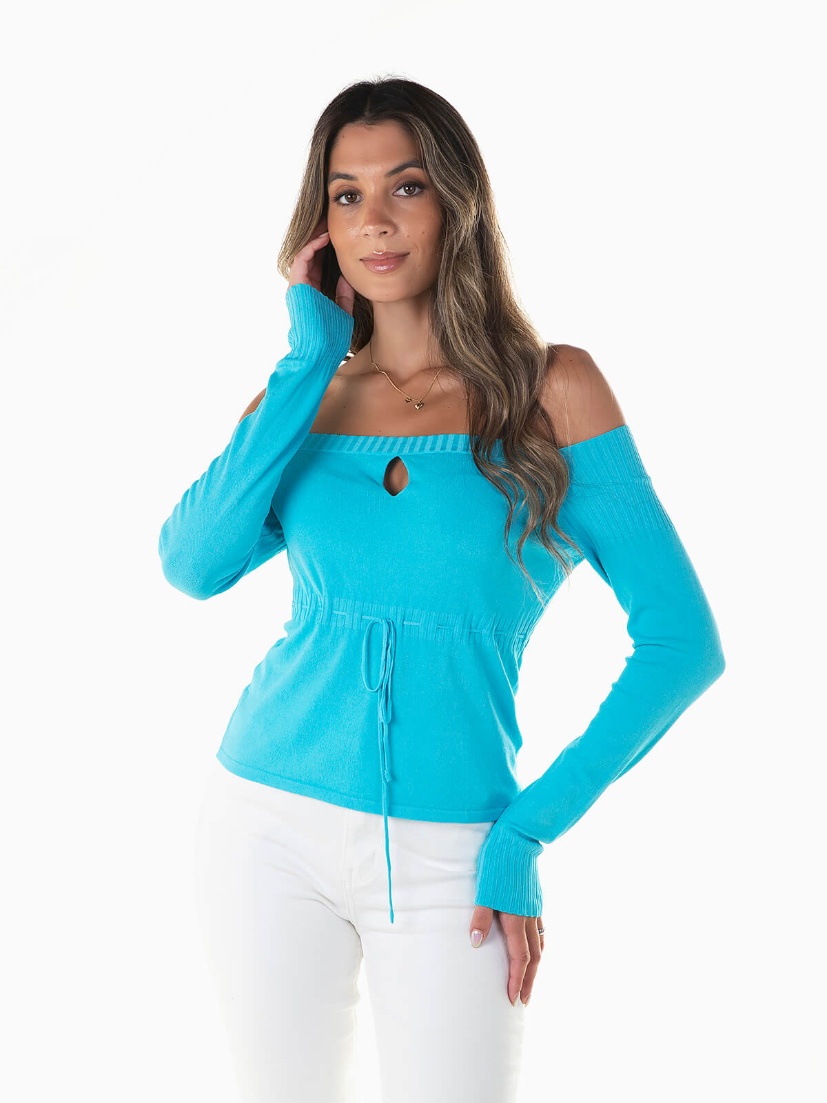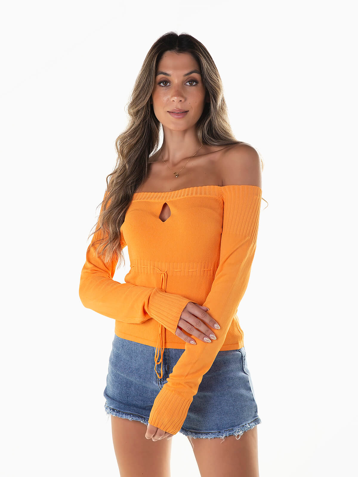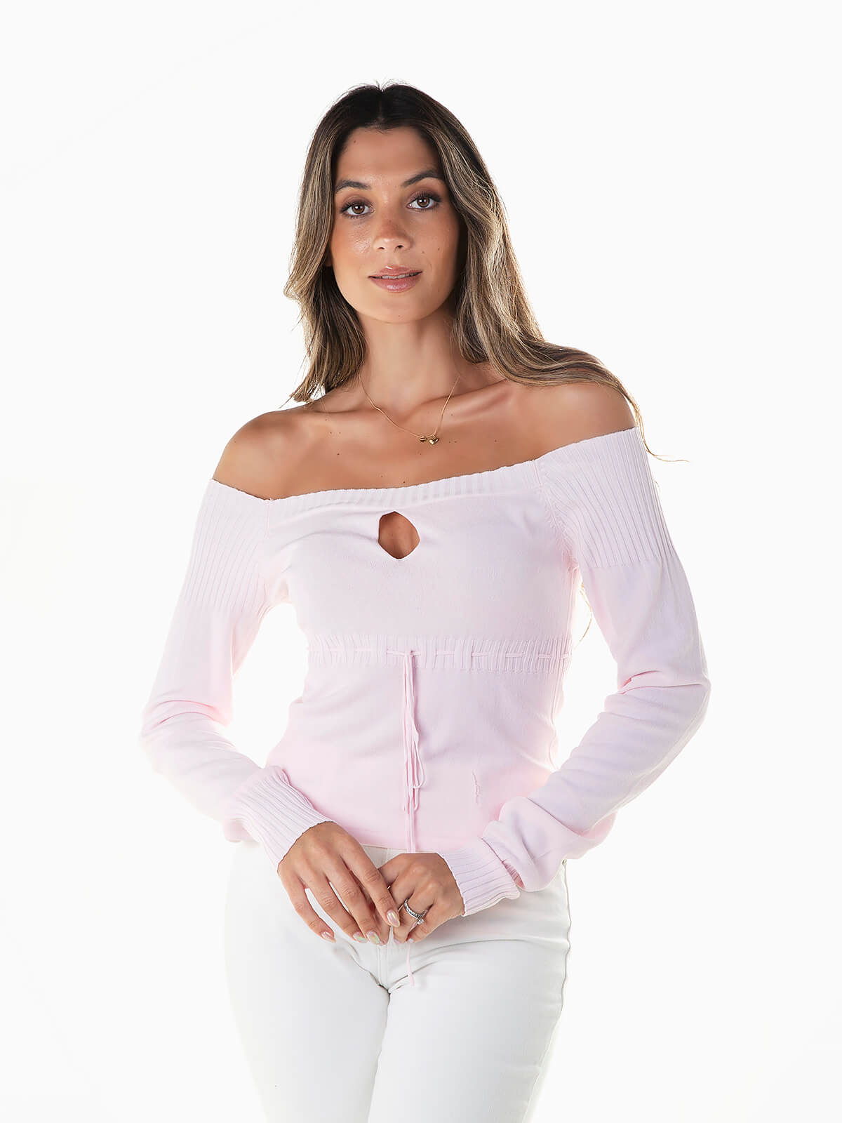 Camisola malha com ombros descobertos e extremidades caneladas. Camisola manga comprida com cordão na cintura para ajustar. Decote barco e pormenor cut out.