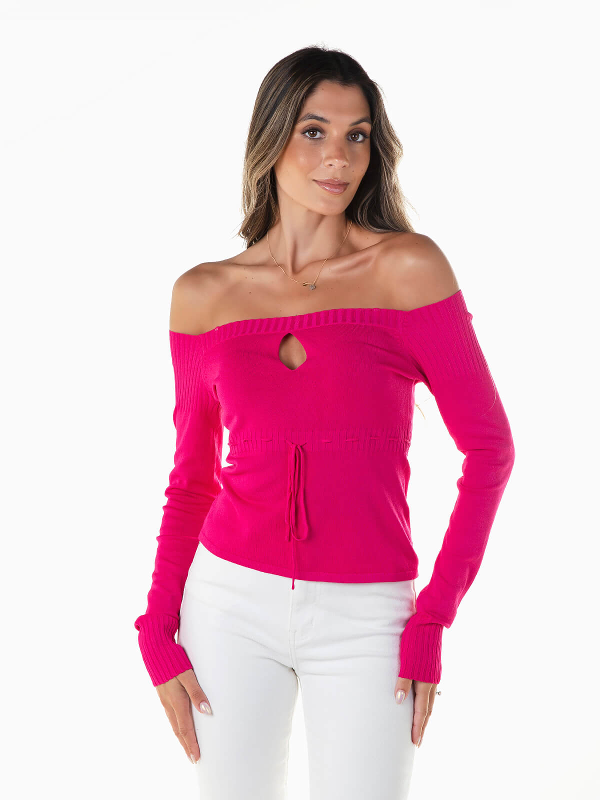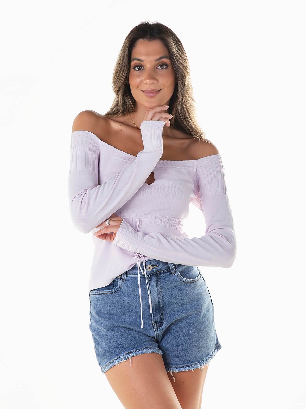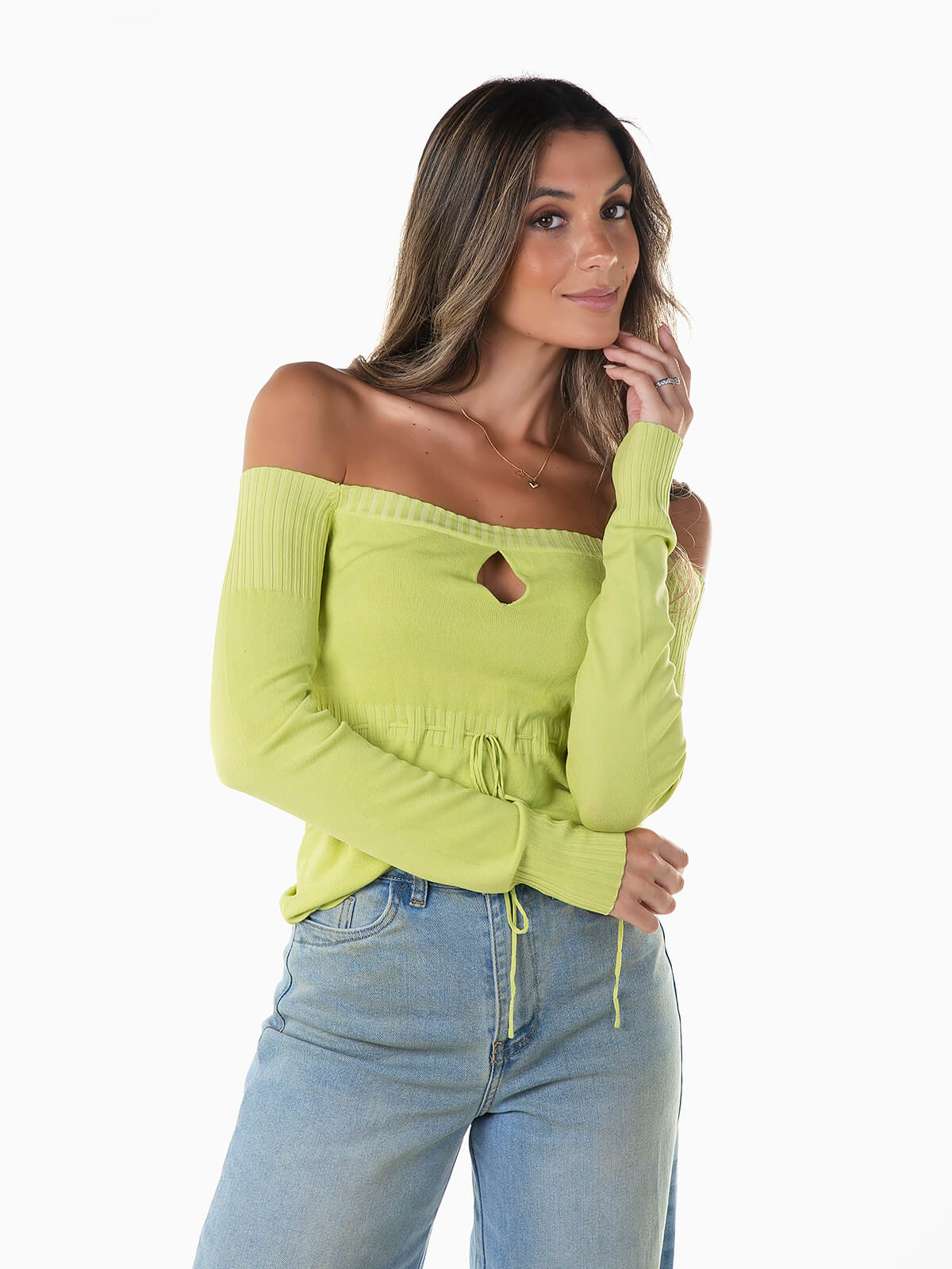 Camisola malha com ombros descobertos e extremidades caneladas. Camisola manga comprida com cordão na cintura para ajustar. Decote barco e pormenor cut out.