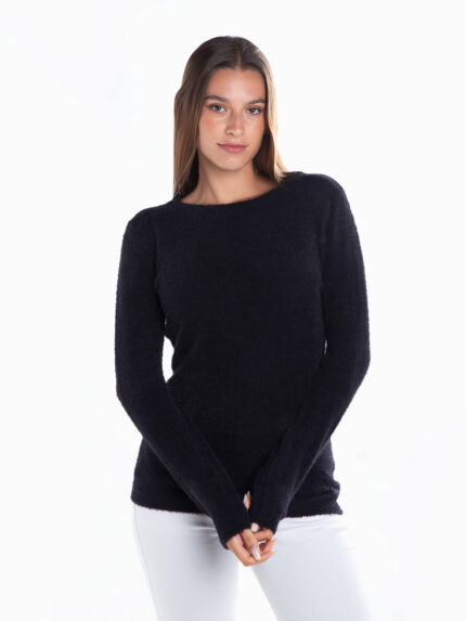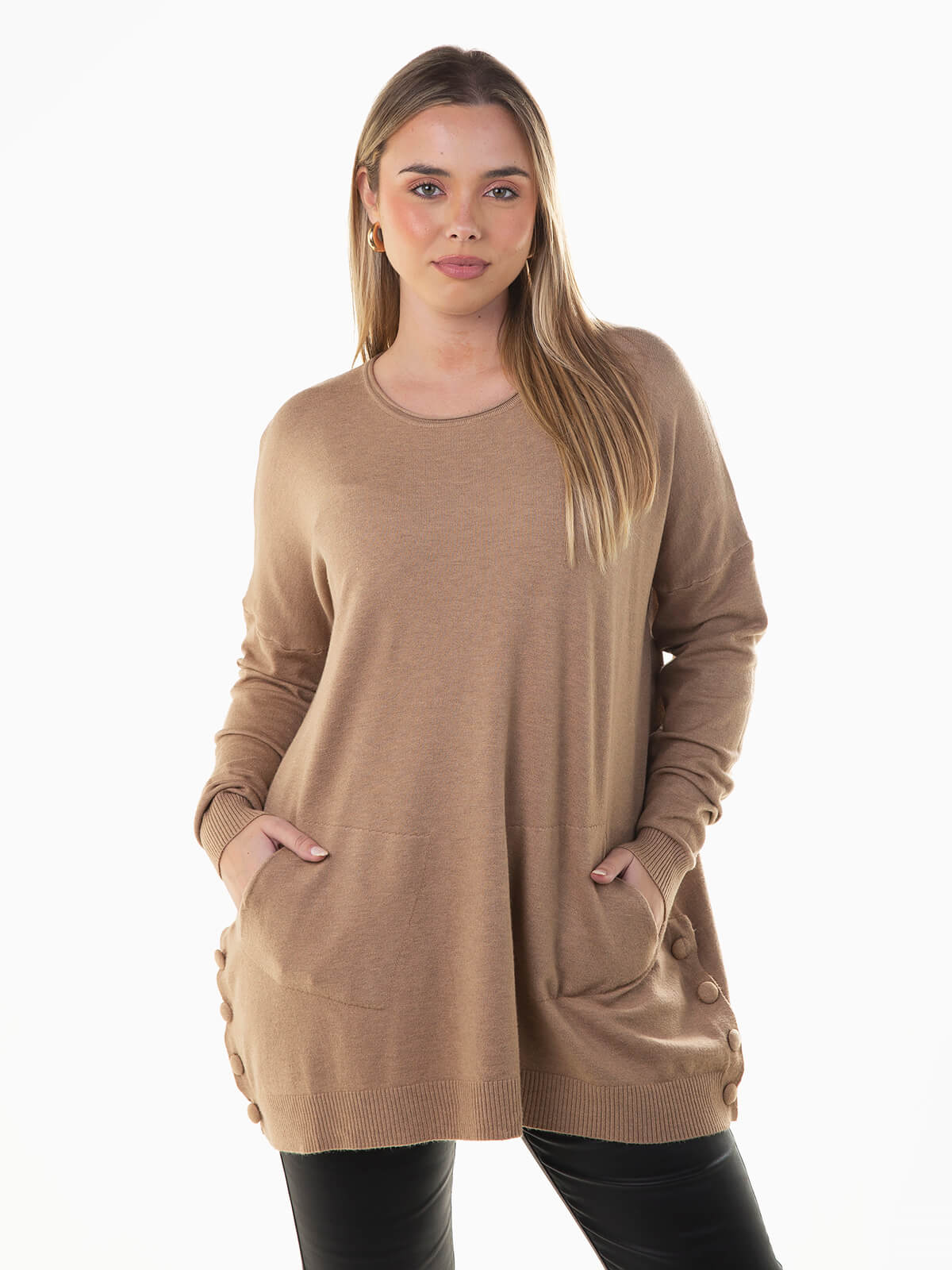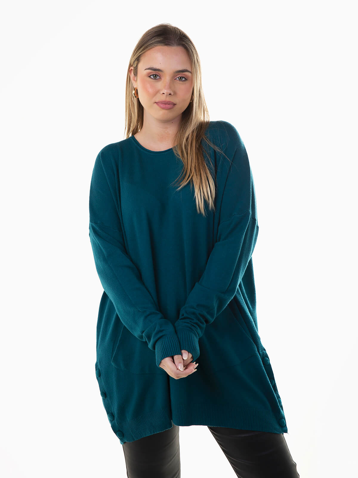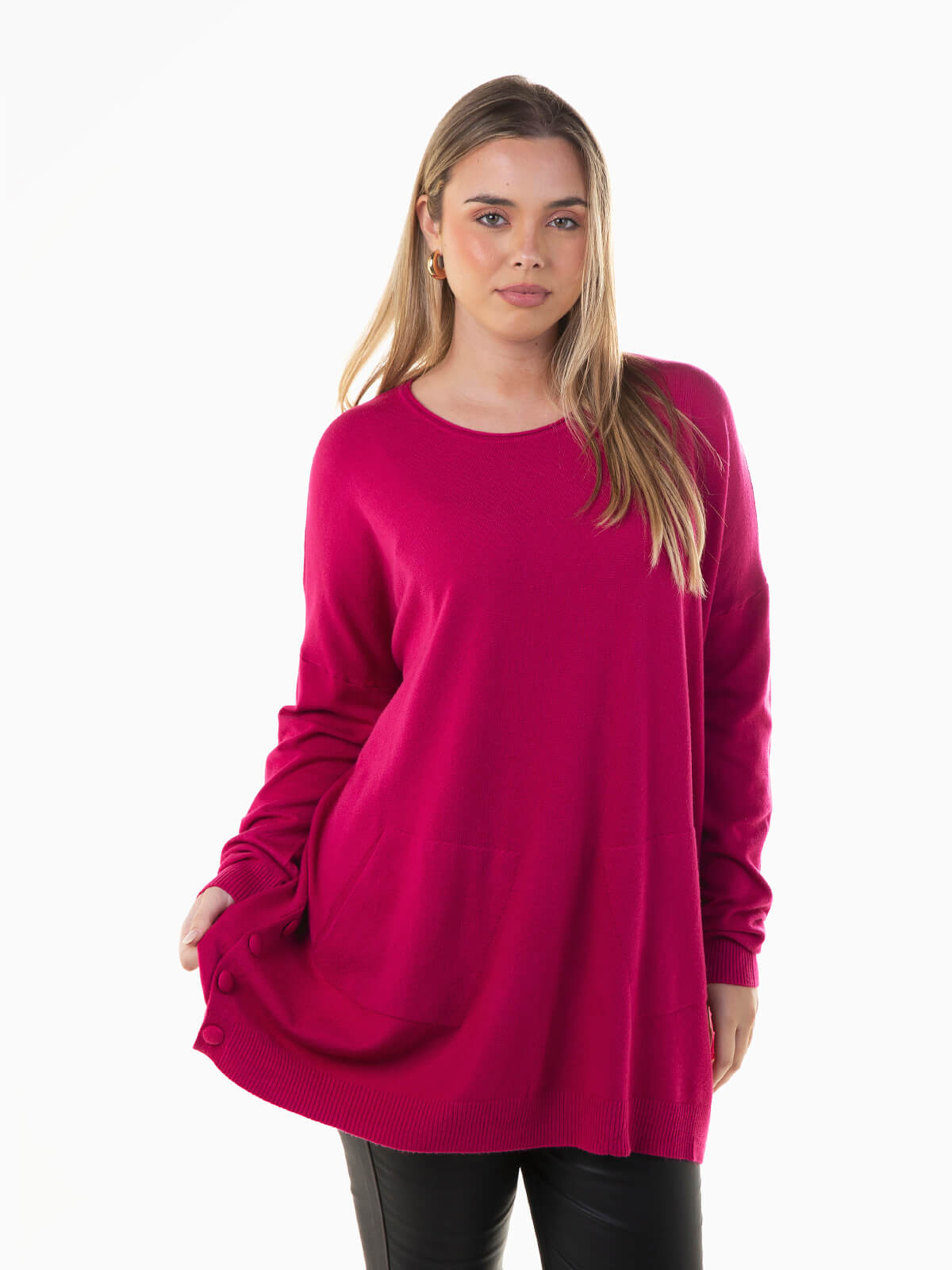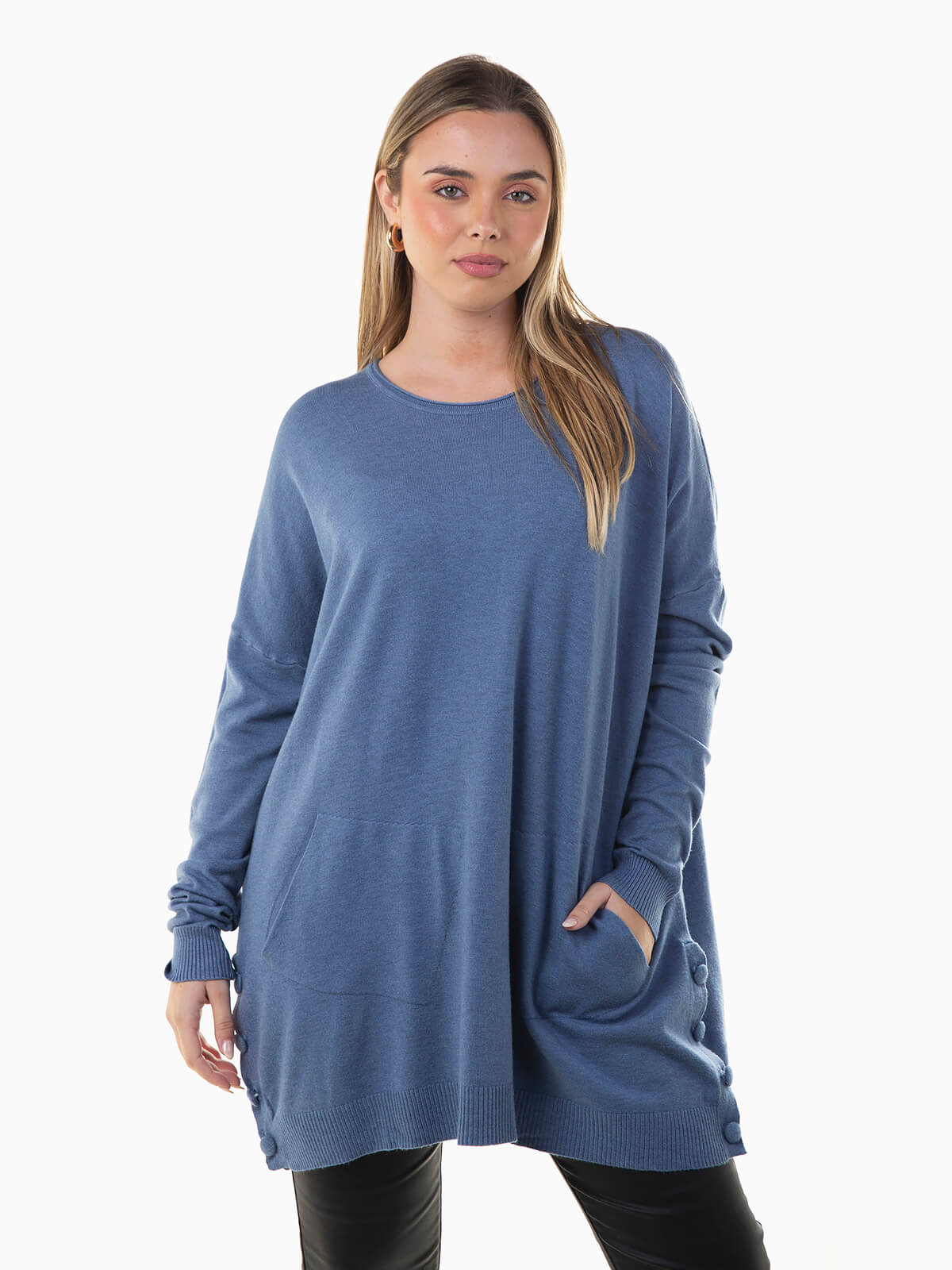 Camisola malha oversize com aperto lateral de botões forrados. Camisola manga comprida com 2 bolsos à frente e decote redondo. Acabamentos canelados.